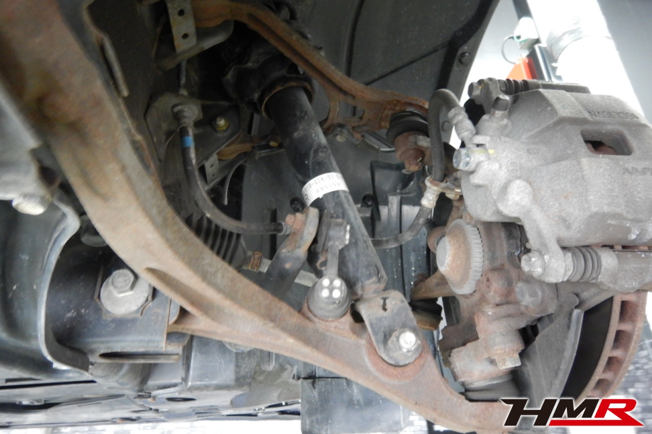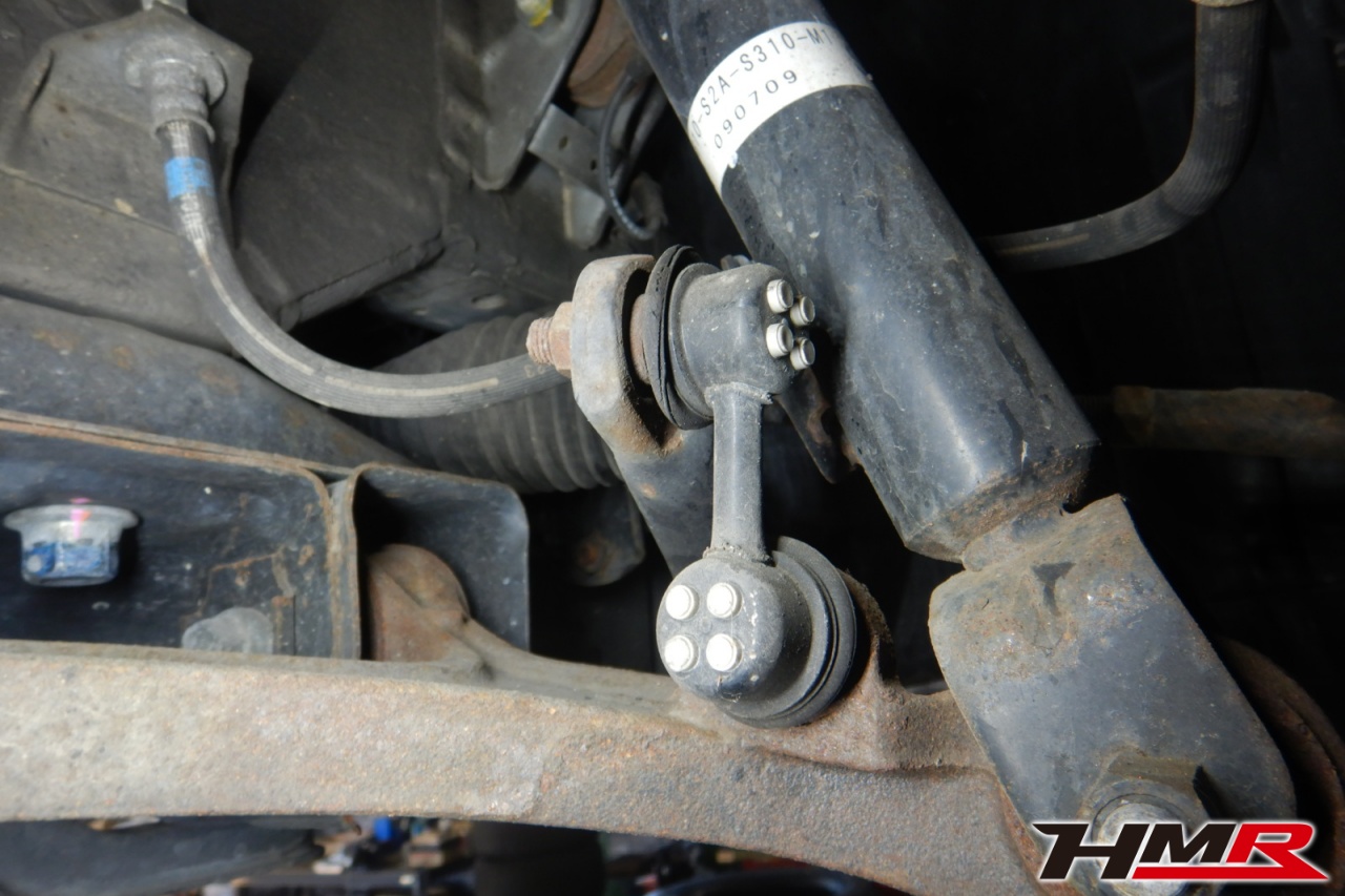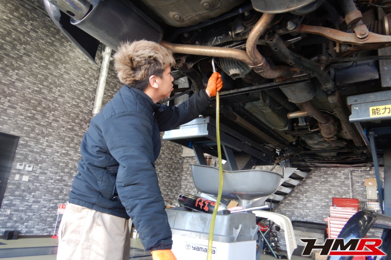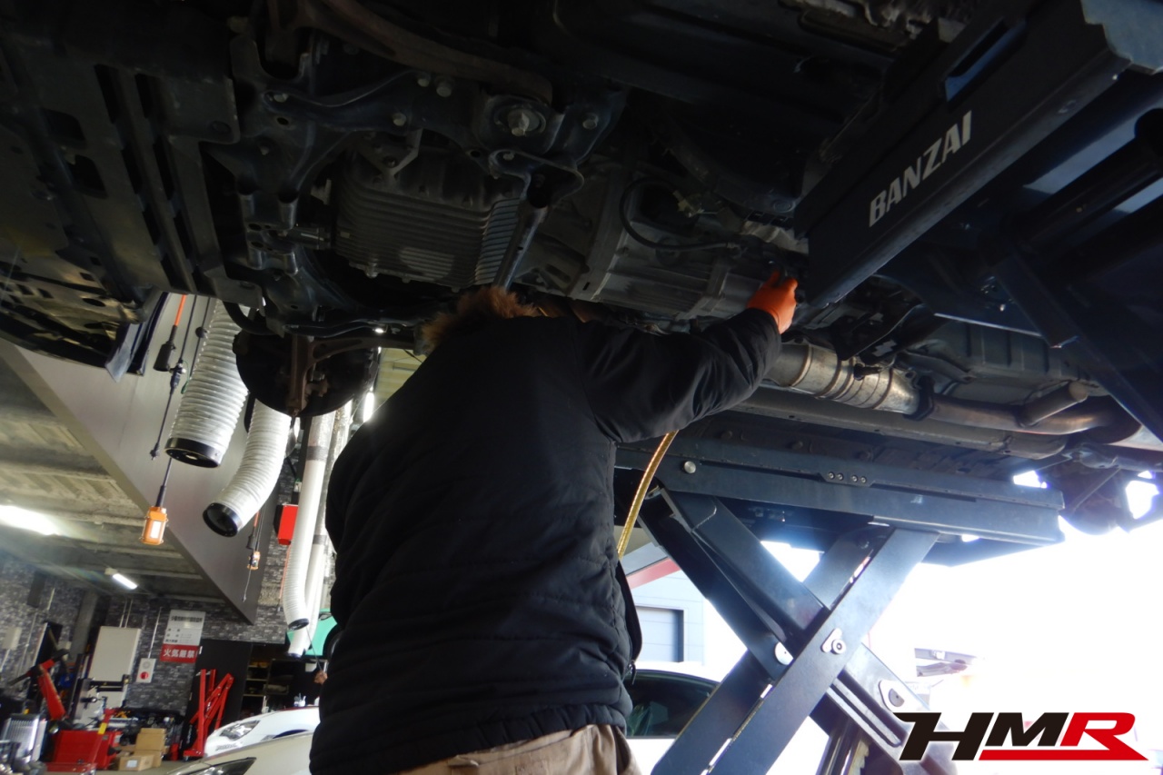 ハブベアリング・ボールジョイント、アーム・リンク類のガタ、ブッシュ・ブーツ類の劣化、エンジン・ミッション・デフからのオイル漏れと各マウント類、タイヤ溝の残量、空気圧の点検を行いました。フロント右側スタビリンクが劣化していたため交換しました。またフロントロアアームにヒビが見られましたがすぐに交換する必要はなかったため今後交換をおすすめします。