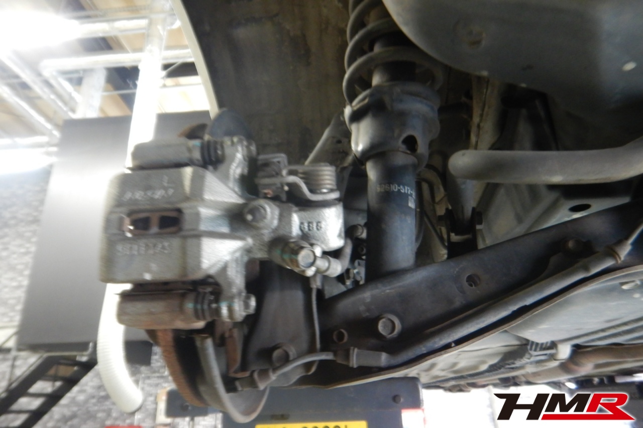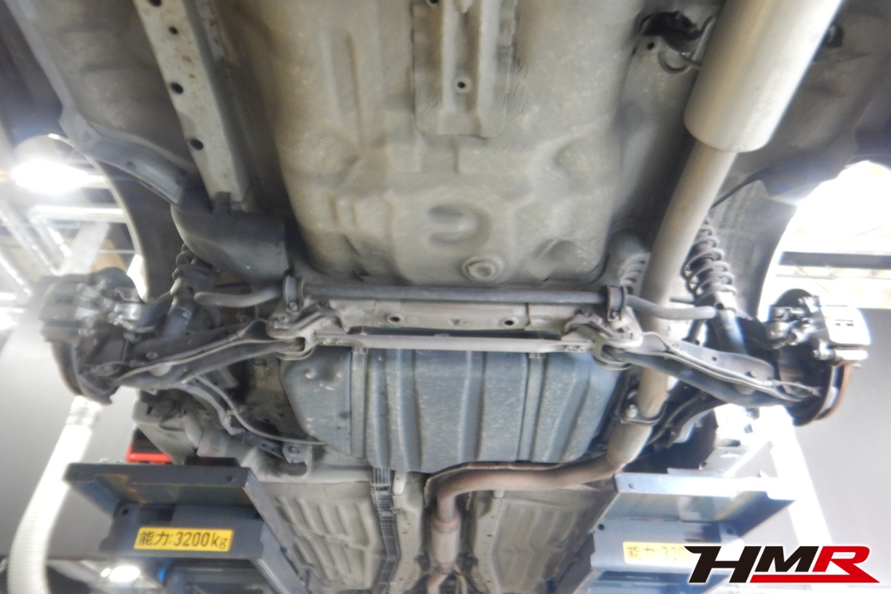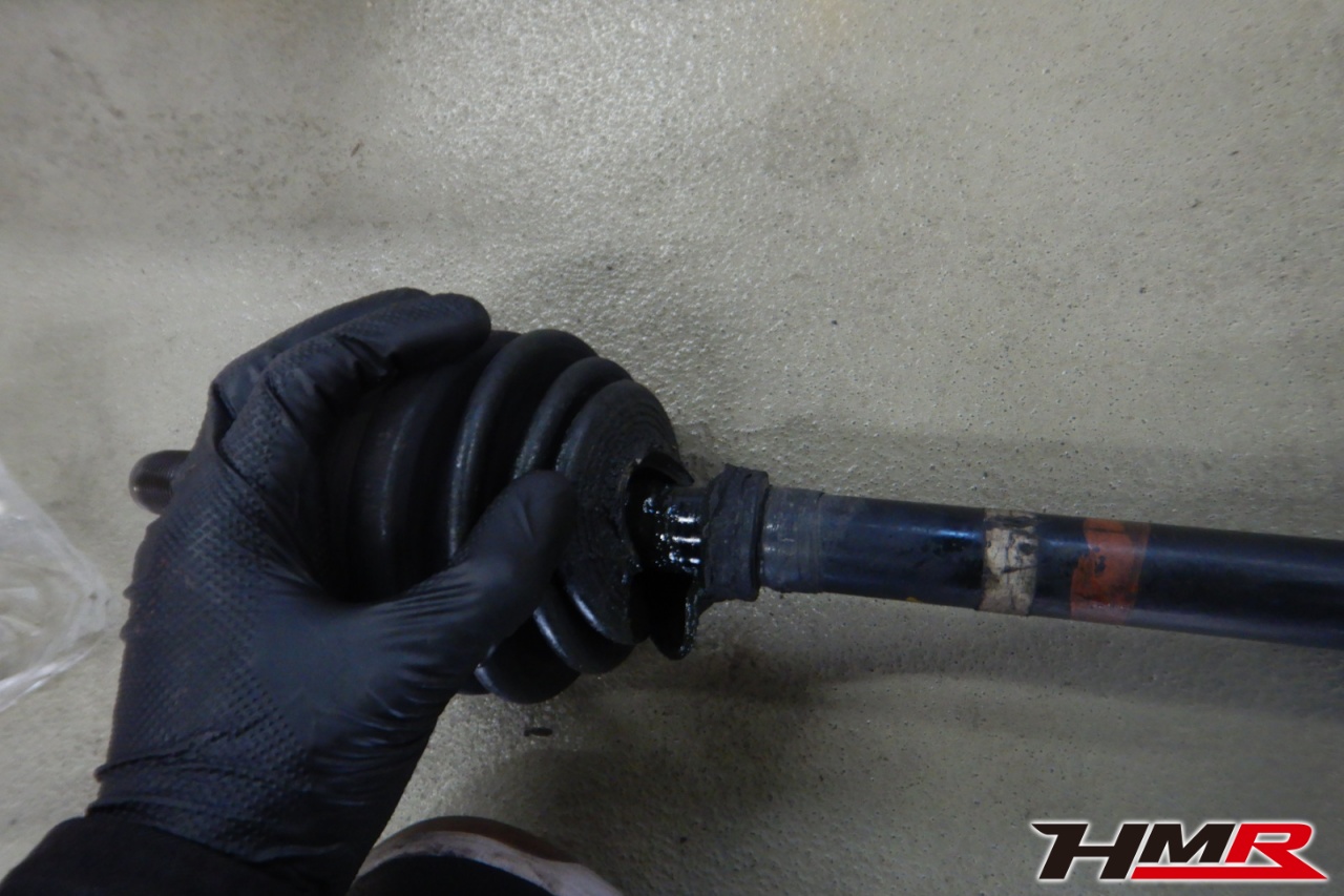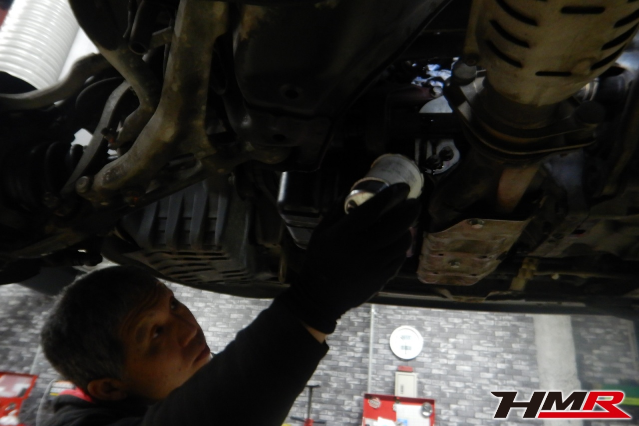 ハブベアリング・ボールジョイント、アーム・リンク類のガタ、ブッシュ・ブーツ類の劣化、エンジン・ミッション・デフからのオイル漏れと各マウント類、タイヤ溝の残量、空気圧の点検しました。左右ドライブシャフトブーツが切れていましたので交換しました。またステアリングギアボックスから滲み、左右フロントロアアームのフォーク取付ブッシュにヒビ、左側トレーリングアームブッシュにヒビが見られました。こちらも今後タイミングを見て交換をおすすめします。