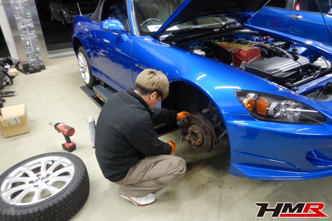HMR(エイチエムアール)の秋山です。今回はアミューズフロントバンパー 社外マフラー装備のS2000(AP2)の納車前点検整備を行いました。担当メカニックは手代木です。
