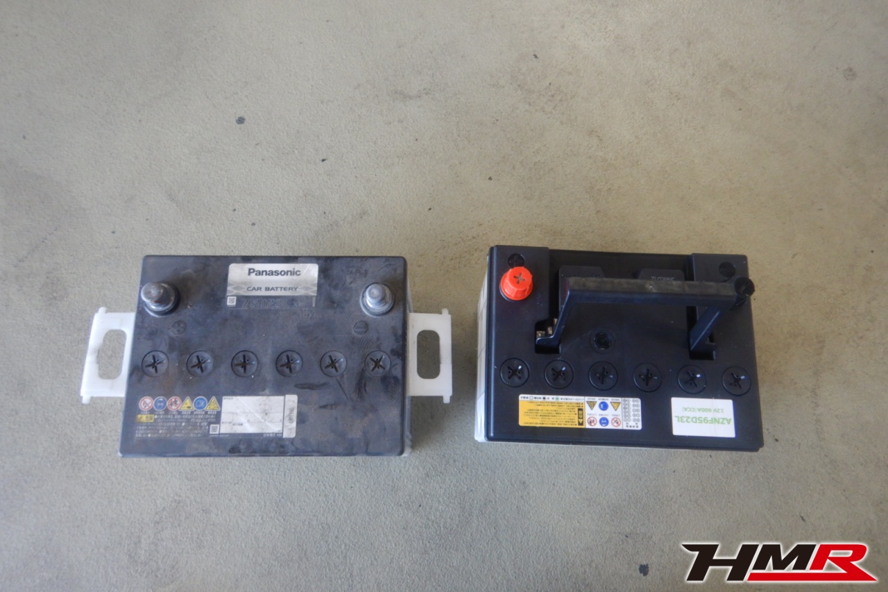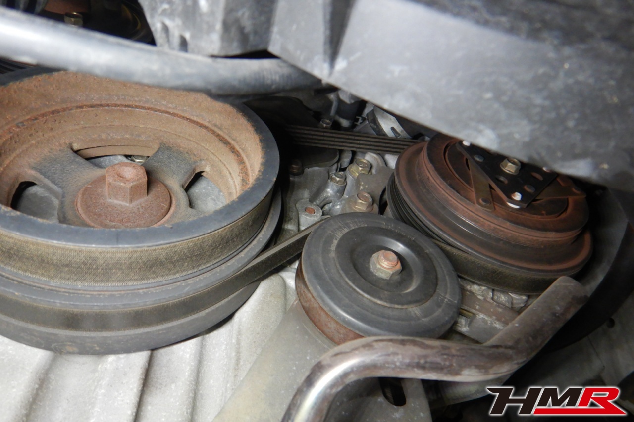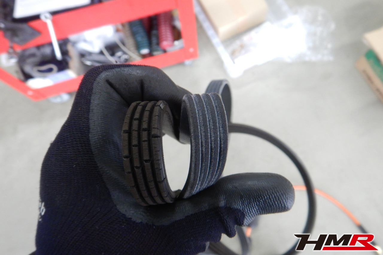 バッテリー、インテークホース、エアクリーナー、補機ベルト、プラグ、ブレーキ・クラッチマスターシリンダー、各部ゴム類の劣化、パッキン類・シール類からのオイル滲み・漏れ、ラジエターの劣化、冷却水漏れ、その他異音などをチェックしました。バッテリーが弱っていたのとエアコンベルトに大きなヒビが見られましたので交換しました。