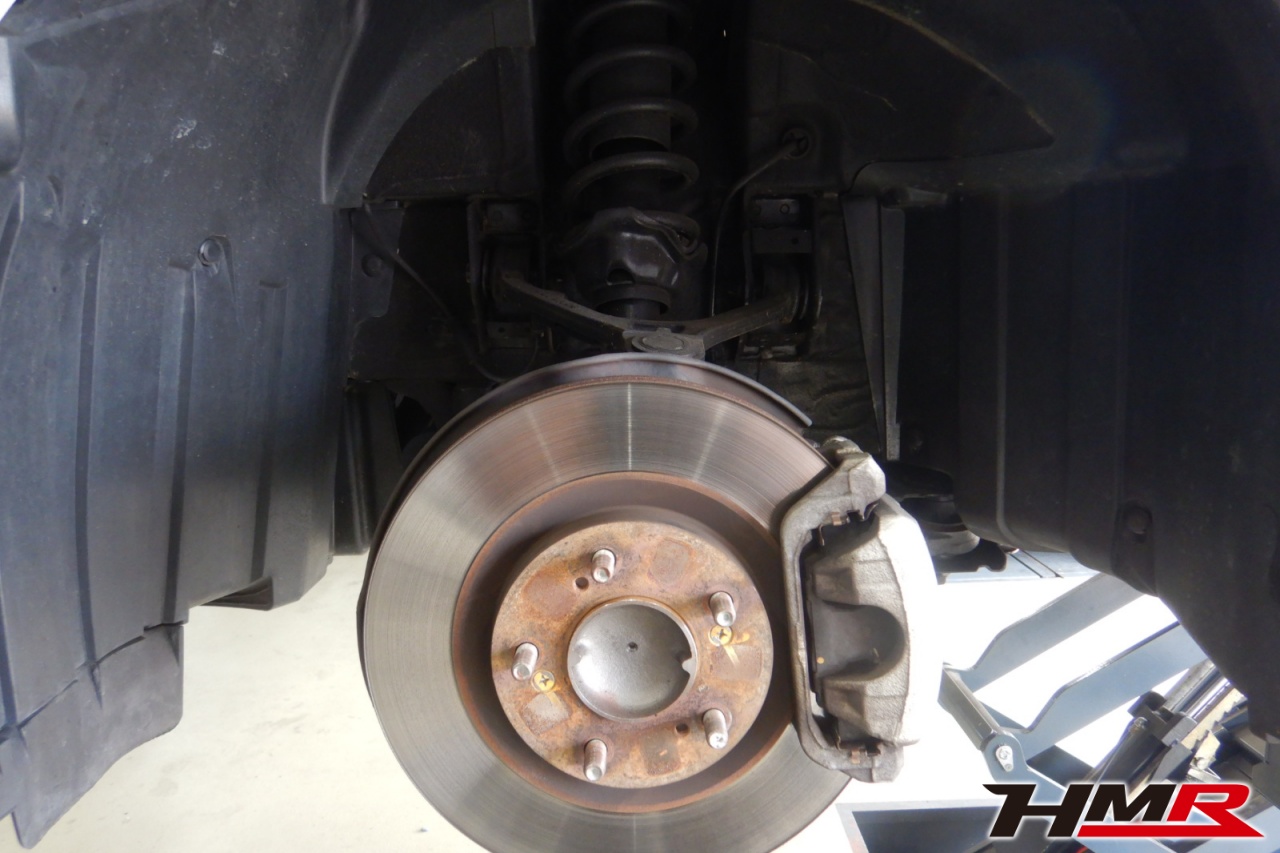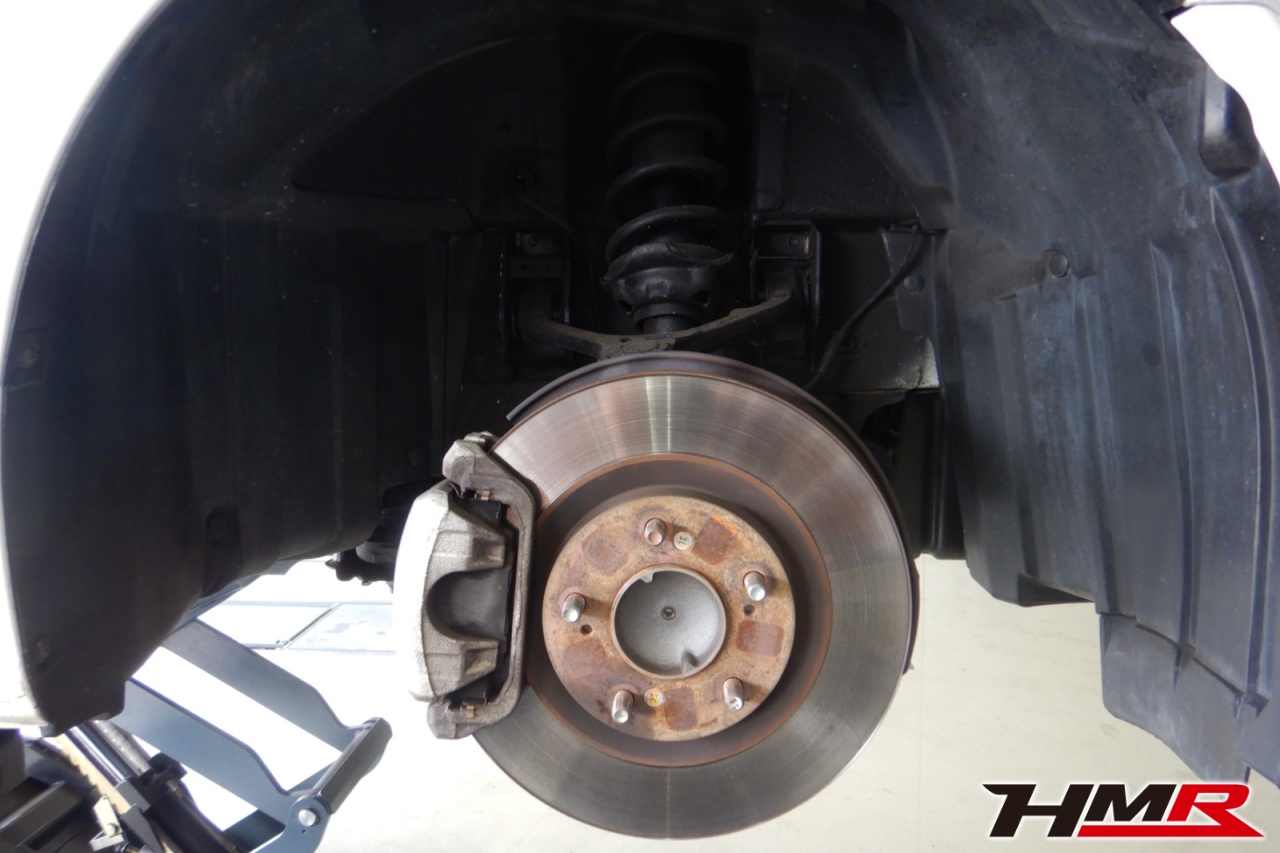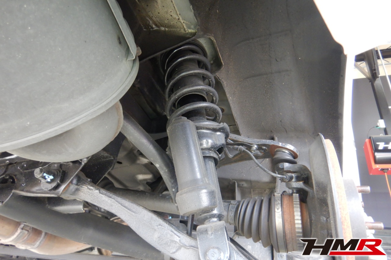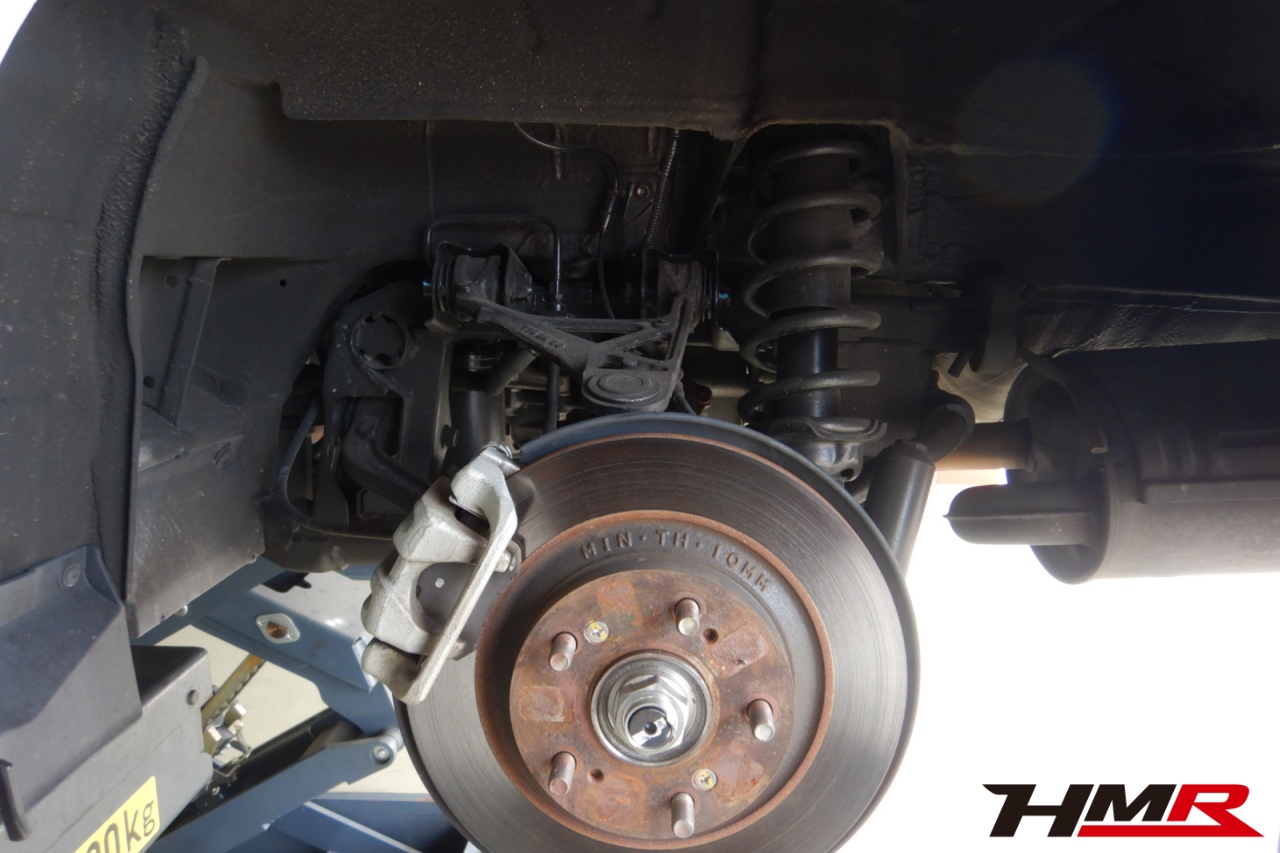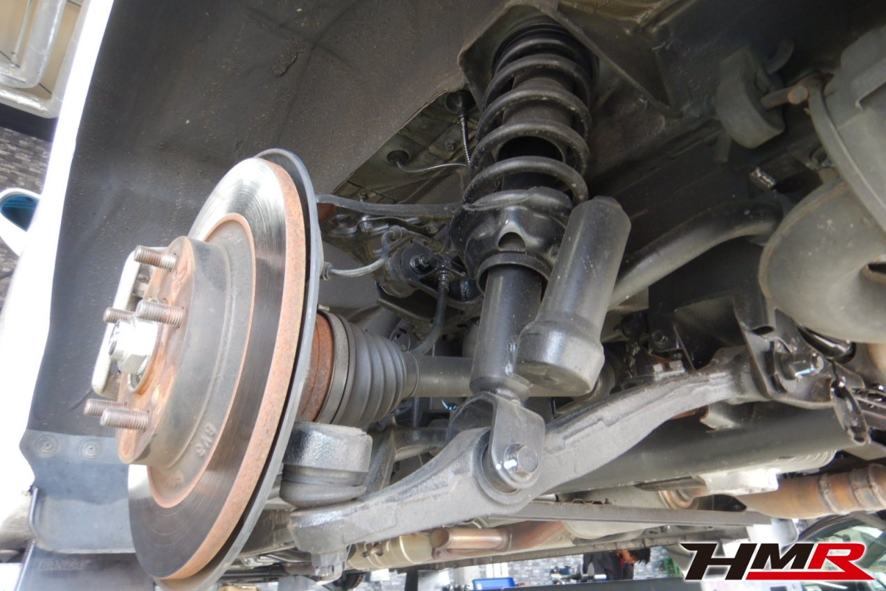 ハブベアリング・ボールジョイント、アーム・リンク類のガタ、ブッシュ・ブーツ類の劣化、エンジン・ミッション・デフからのオイル漏れと各マウント類、タイヤ溝の残量、空気圧の点検を行いました。特に問題ありませんでした。