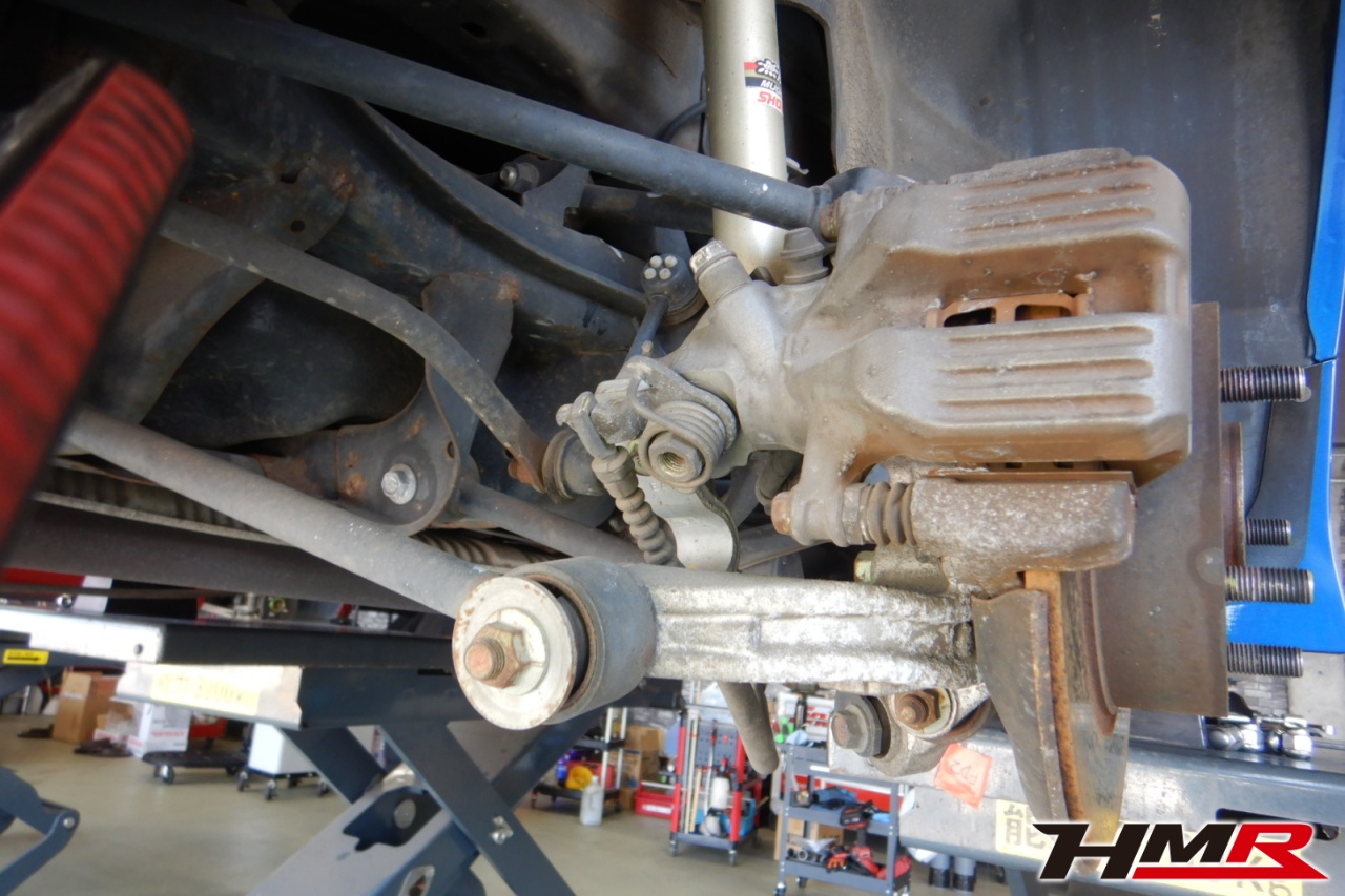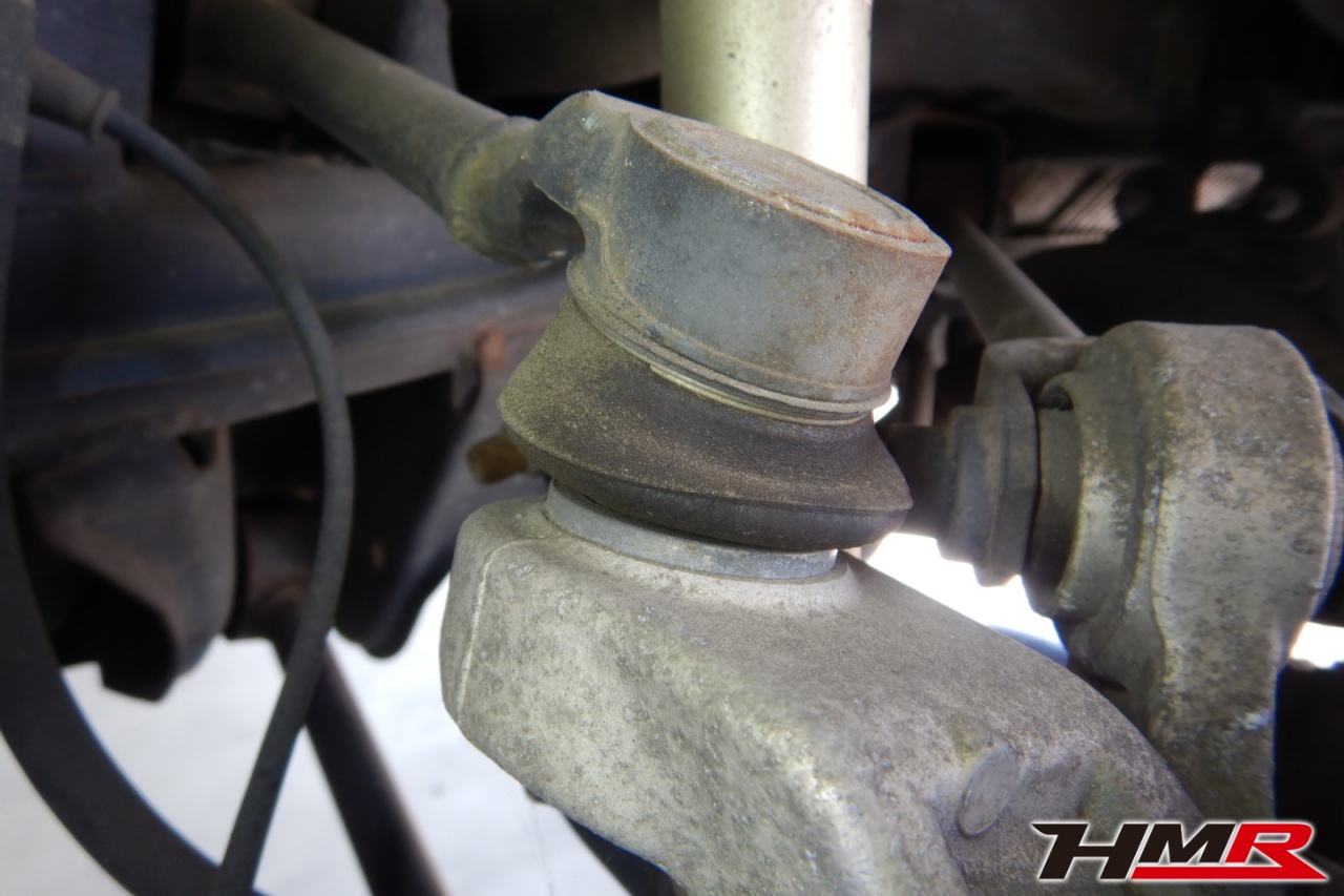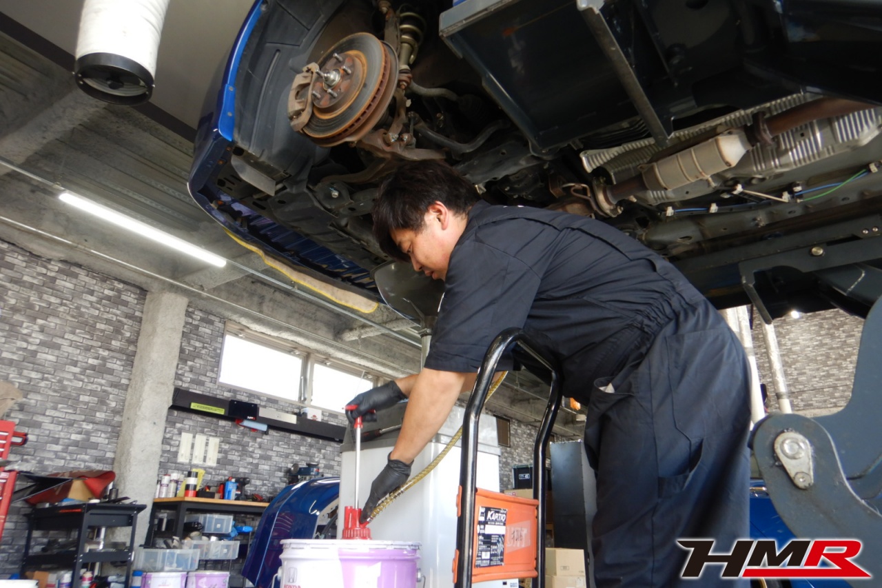 ハブベアリング・ボールジョイント、アーム・リンク類のガタ、ブッシュ・ブーツ類の劣化、エンジン・ミッション・デフからのオイル漏れと各マウント類、タイヤ溝の残量、空気圧の点検をしました。