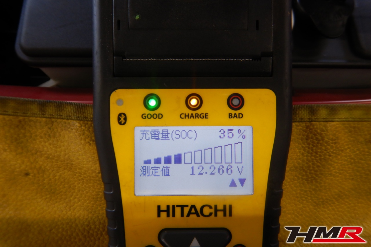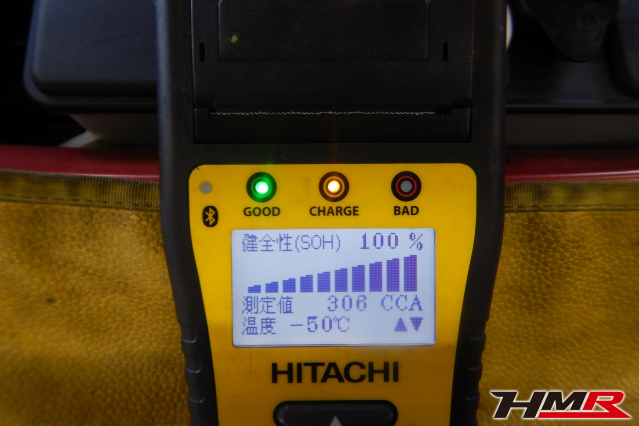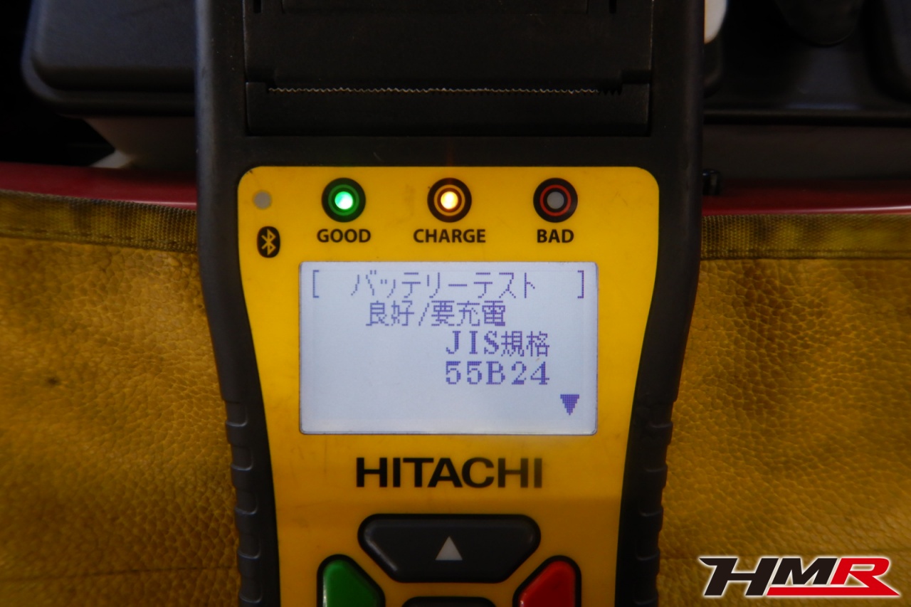 バッテリー、インテークホース、エアクリーナー、補機ベルト、プラグ、ブレーキ・クラッチマスターシリンダー、各部ゴム類の劣化、パッキン類・シール類からのオイル滲み・漏れ、ラジエターの劣化、冷却水漏れ、その他異音等をチェックしました。バッテリーが弱っていましたので充電しました。