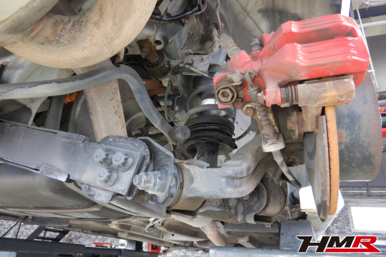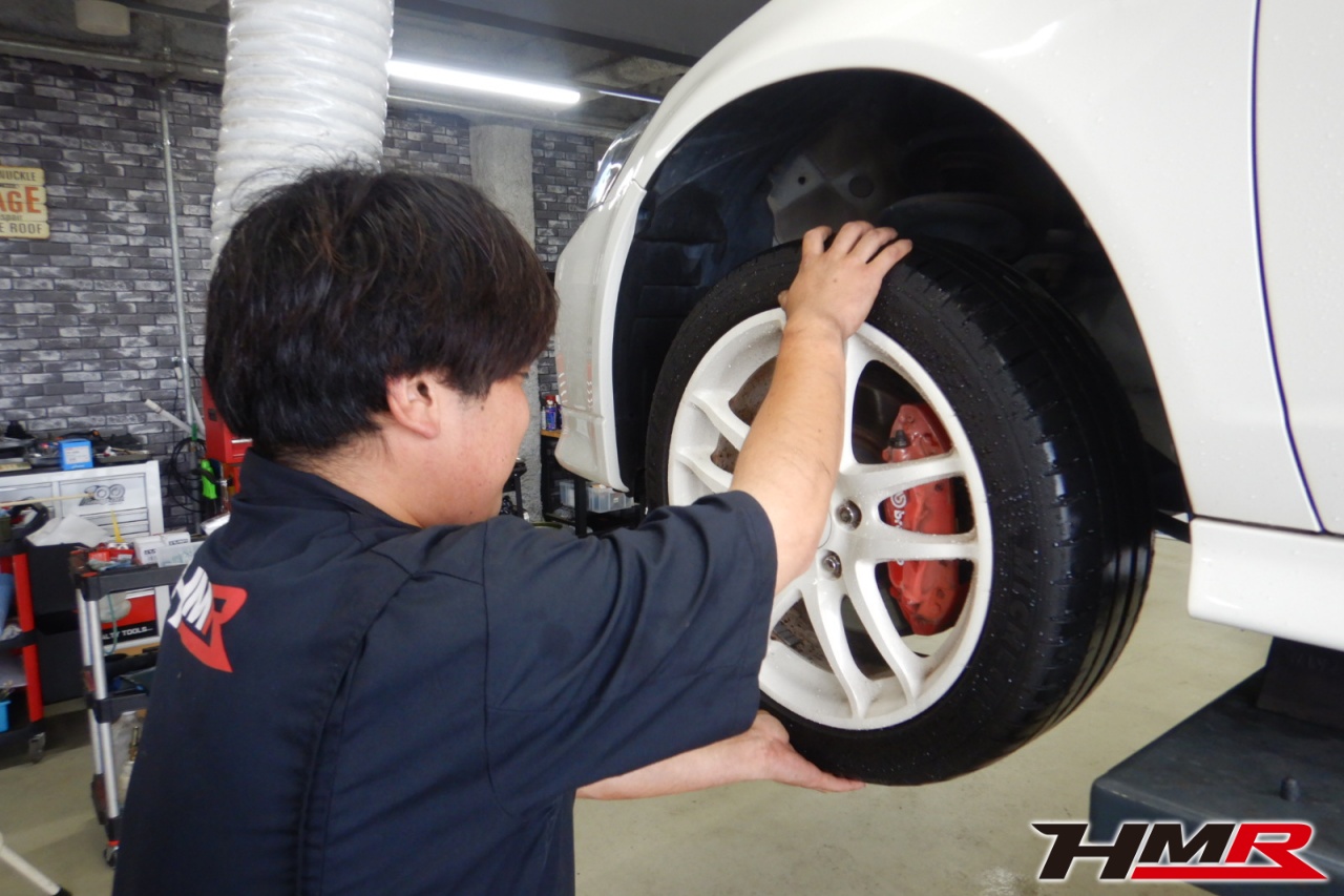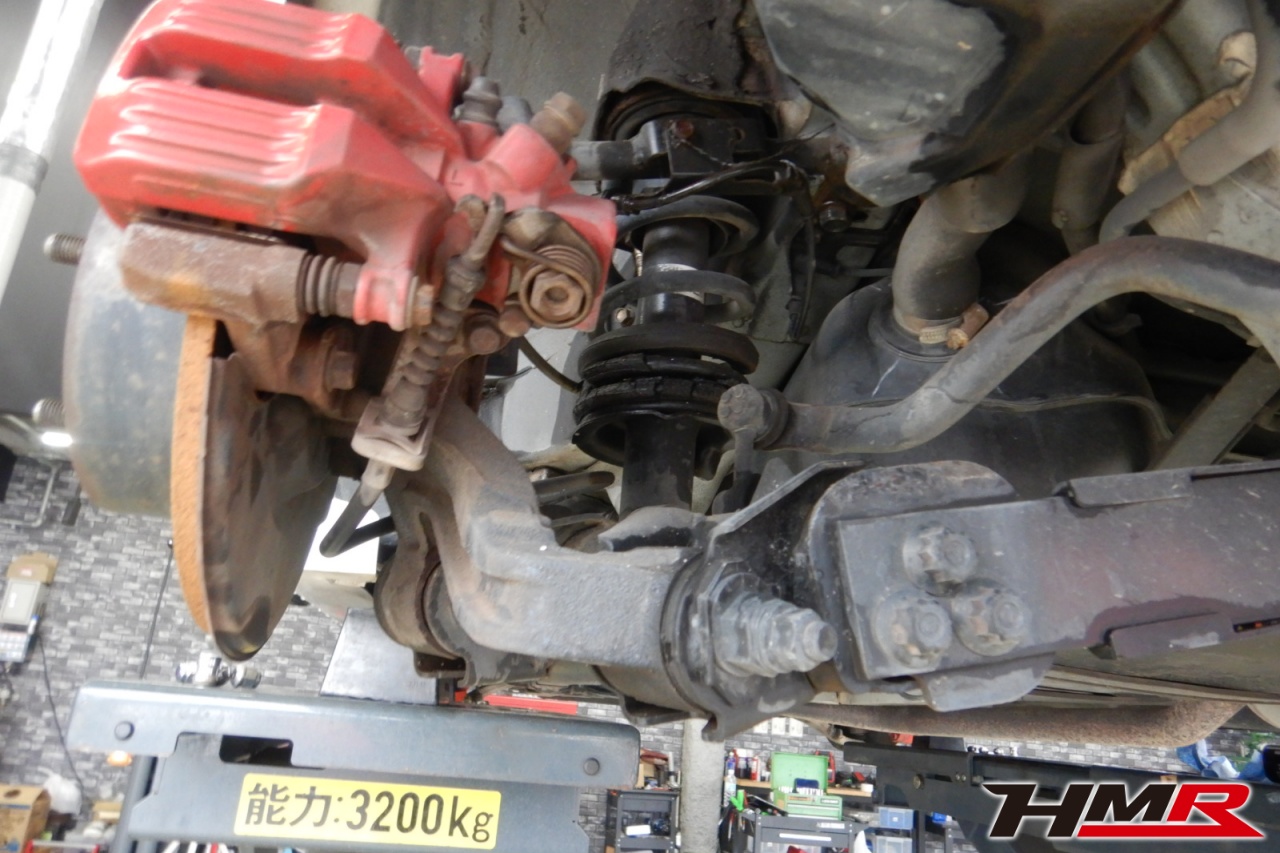 ハブベアリング・ボールジョイント、アーム・リンク類のガタ、ブッシュ・ブーツ類の劣化、エンジン・ミッション・デフからのオイル漏れと各マウント類、タイヤ溝の残量、空気圧の点検しました。特に問題ありませんでした。