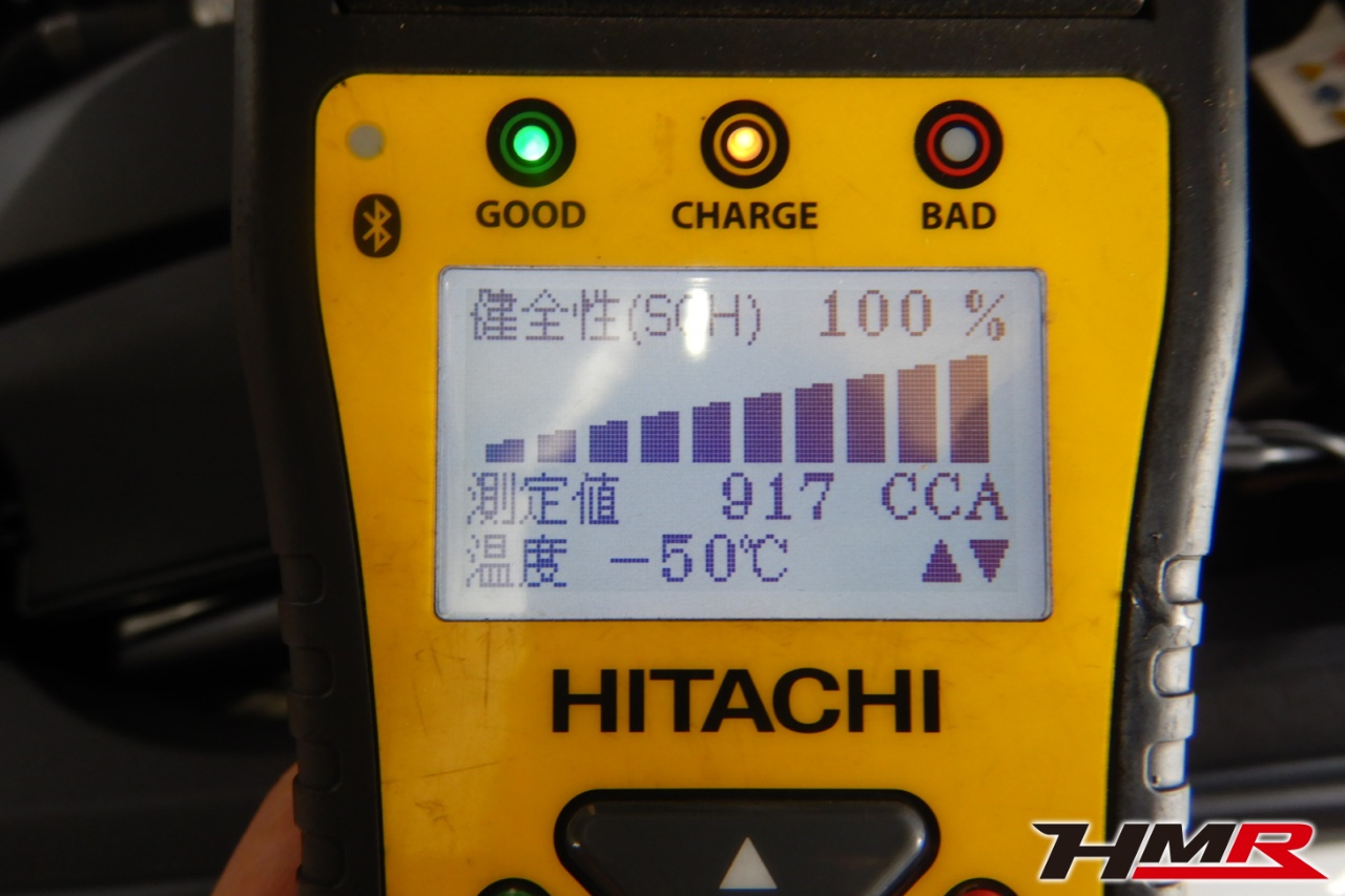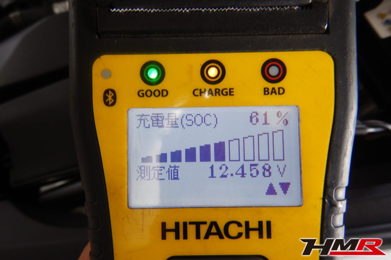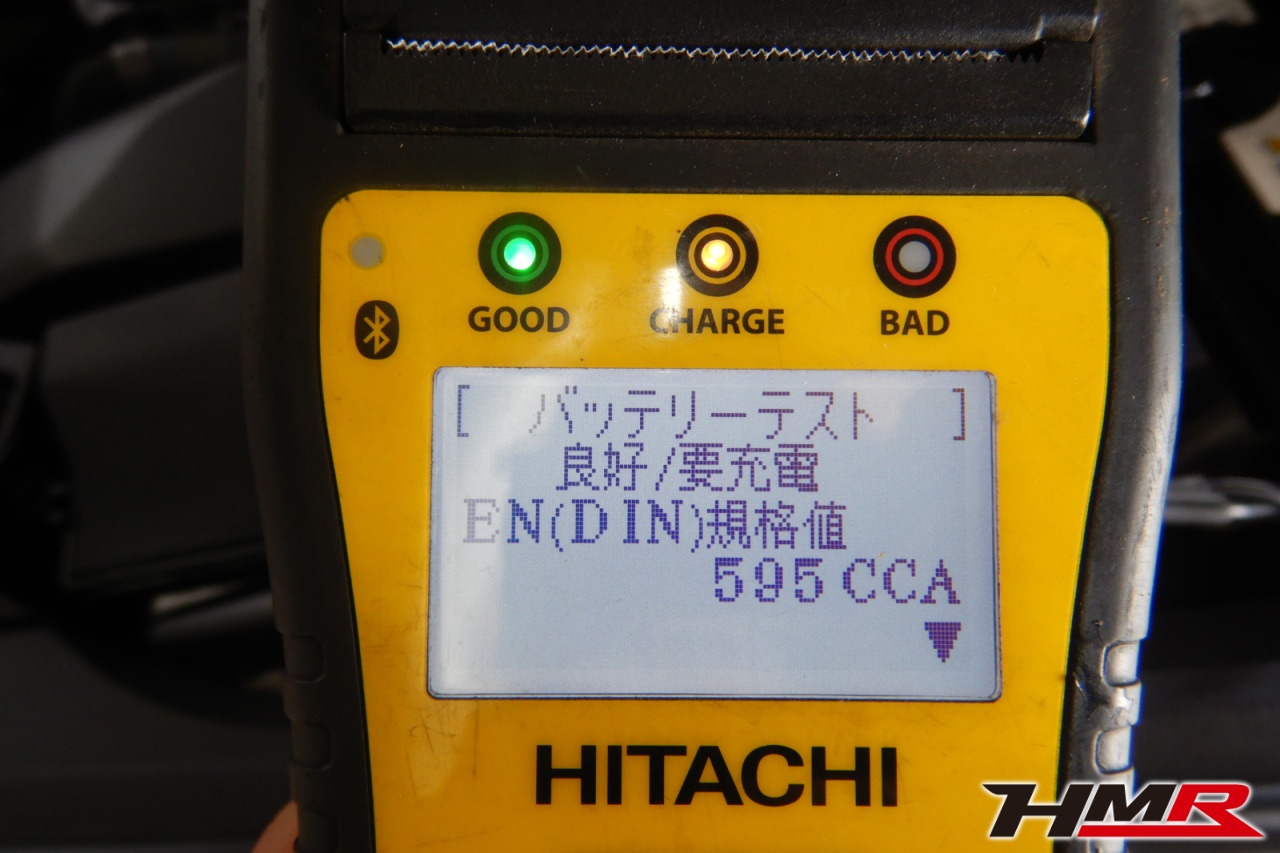バッテリー、インテークホース、エアクリーナー、補機ベルト、プラグ、ブレーキ・クラッチマスターシリンダー、各部ゴム類の劣化、パッキン類・シール類からのオイル滲み・漏れ、ラジエターの劣化、冷却水漏れ、その他異音などをチェックしました。バッテリーが弱っていましたので充電しました。