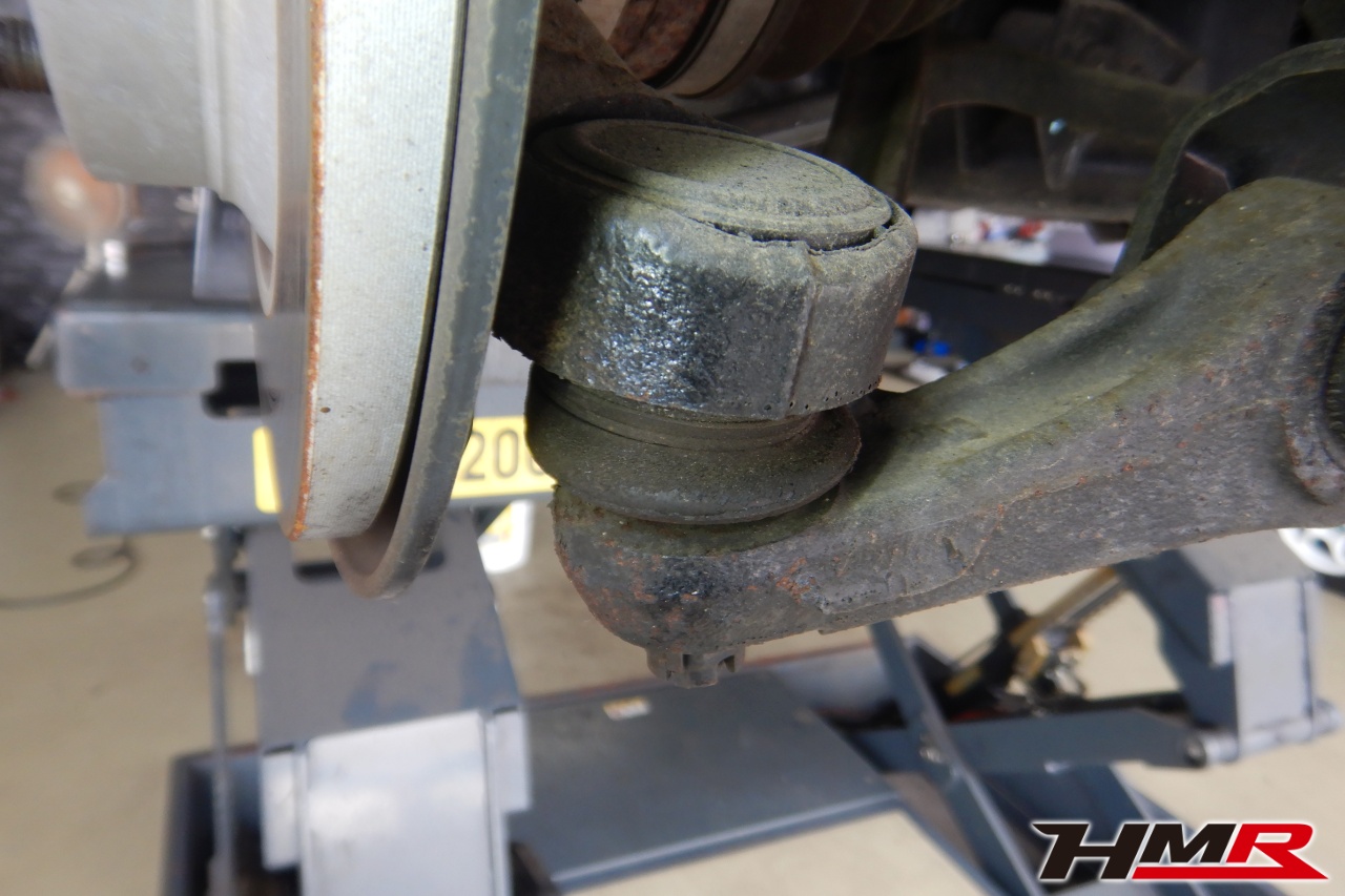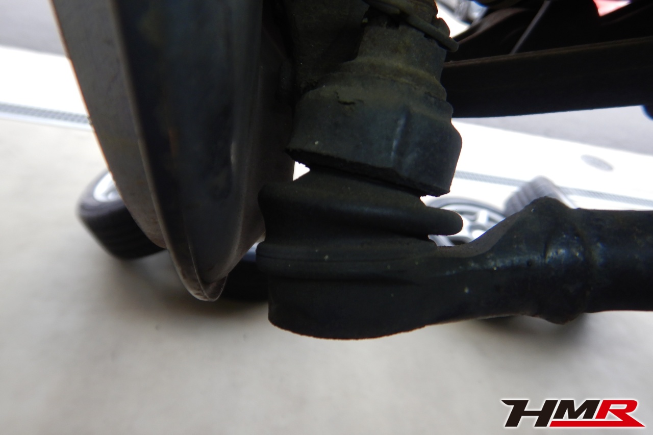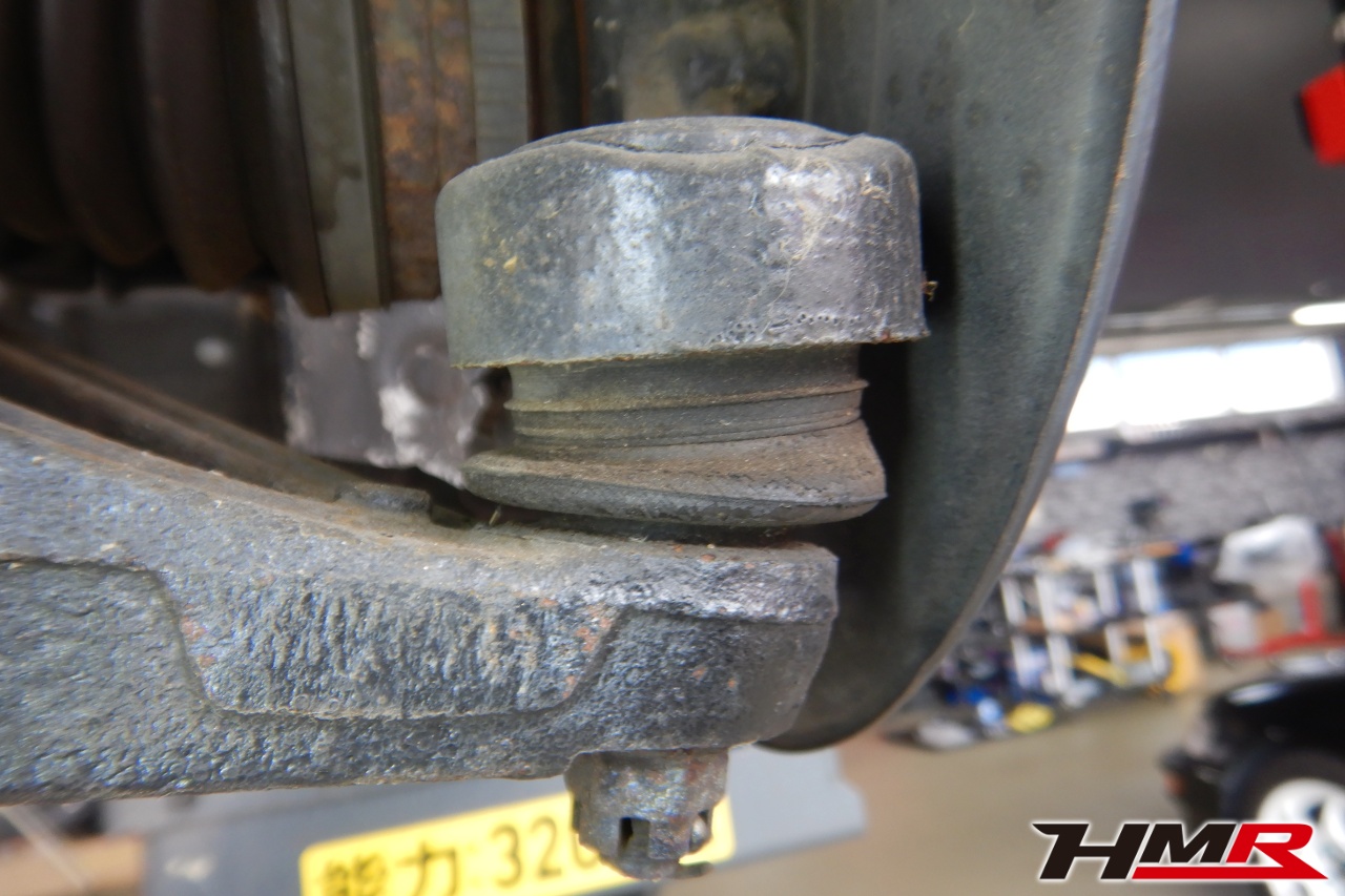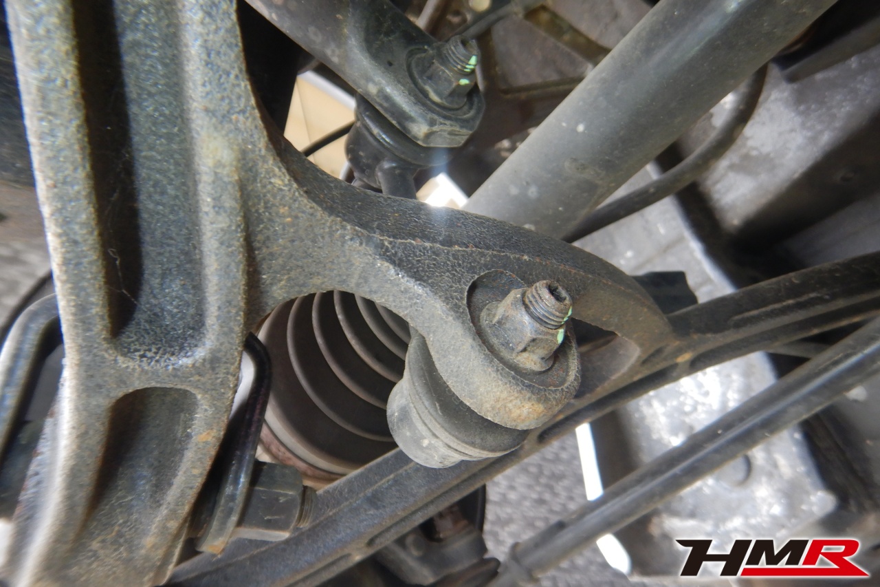 ハブベアリング・ボールジョイント、アーム・リンク類のガタ、ブッシュ・ブーツ類の劣化、エンジン・ミッション・デフからのオイル漏れと各マウント類、タイヤ溝の残量、空気圧の点検しました。右側フロントタイロッドエンドブーツ、左右フロントロアアームにヒビが見られましたので交換しました。