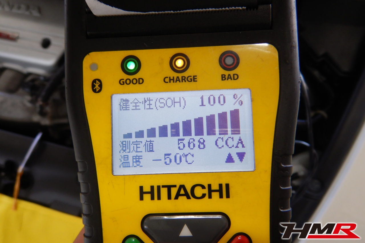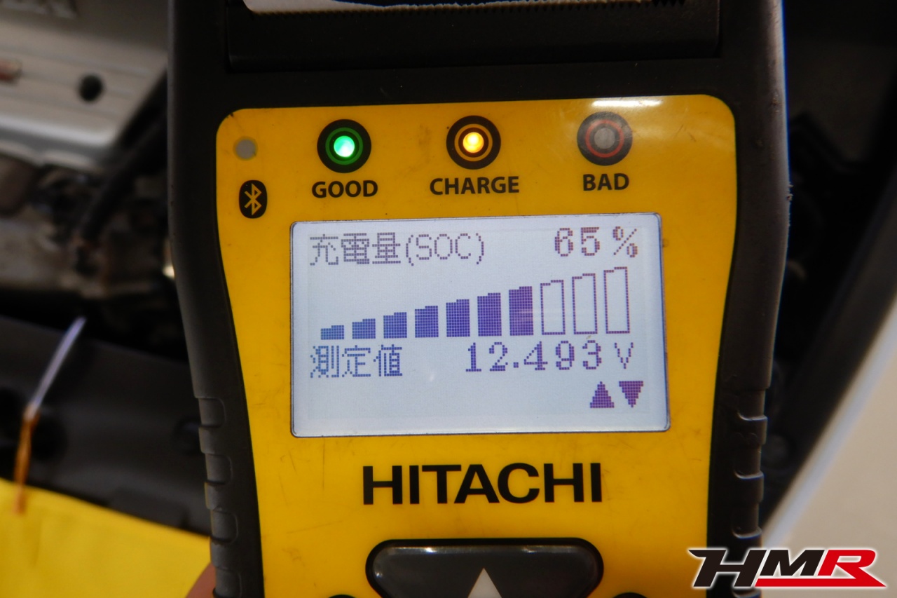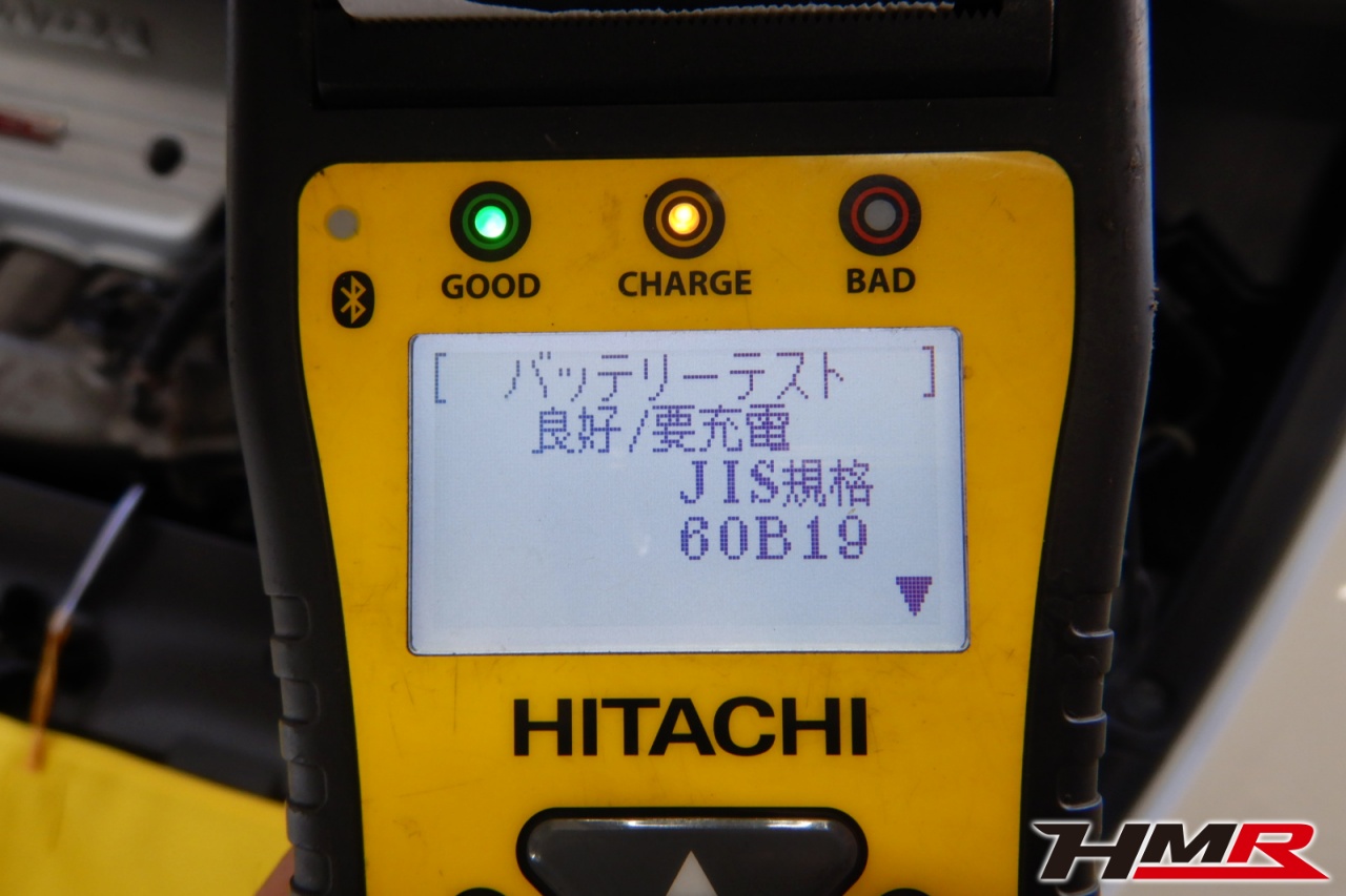 バッテリー、インテークホース、エアクリーナー、補機ベルト、プラグ、ブレーキ・クラッチマスターシリンダー、各部ゴム類の劣化、パッキン類・シール類からのオイル滲み・漏れ、ラジエターの劣化、冷却水漏れ、その他異音などをチェックしました。バッテリーが弱っていましたので充電しました。