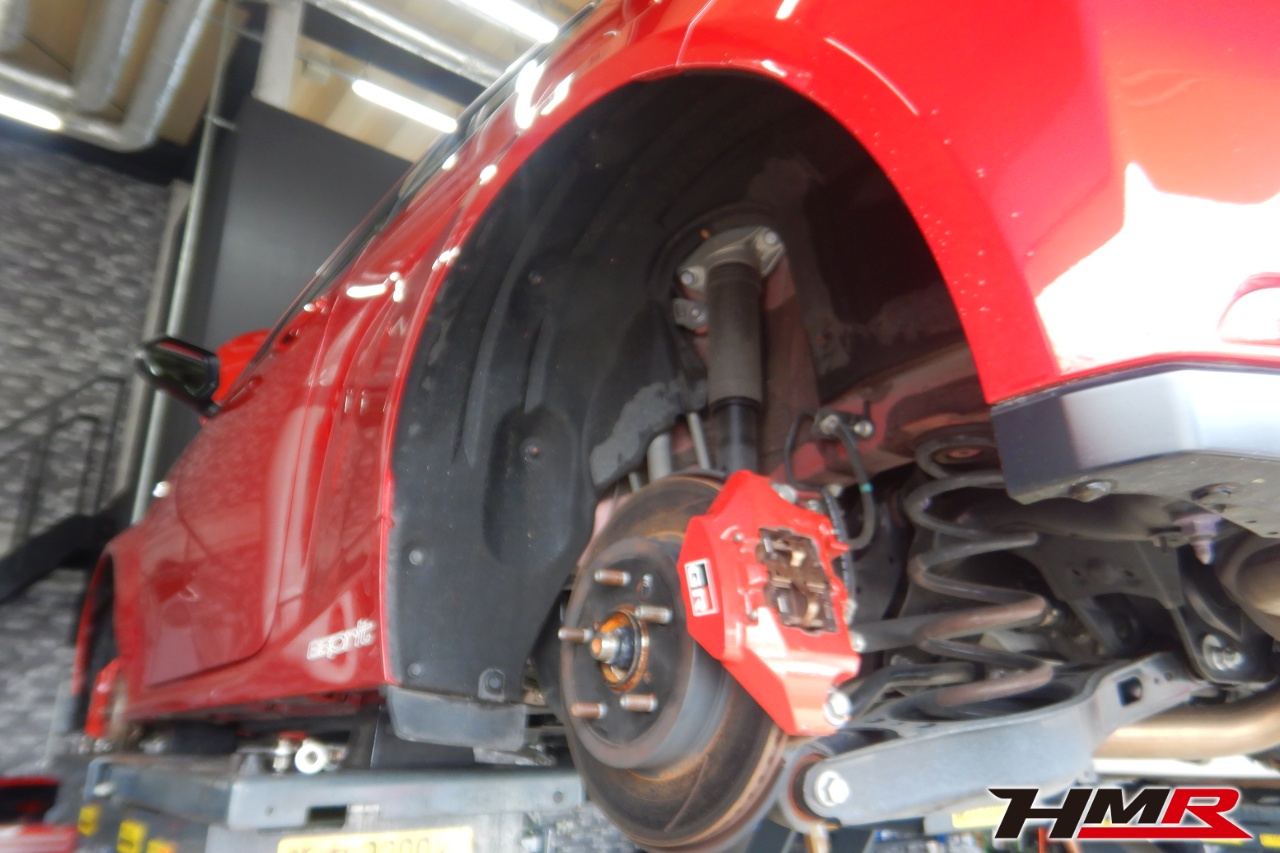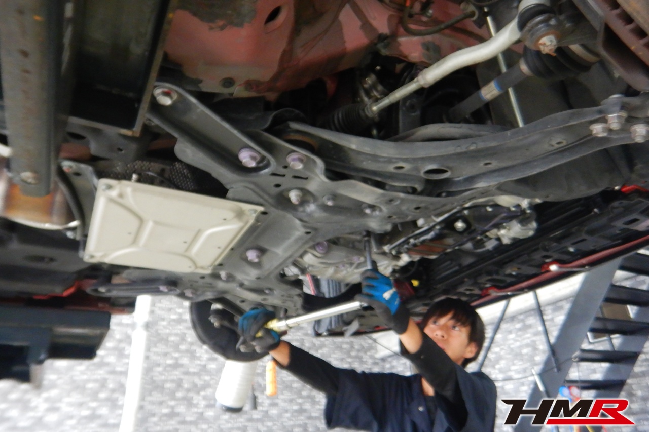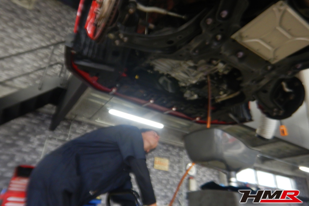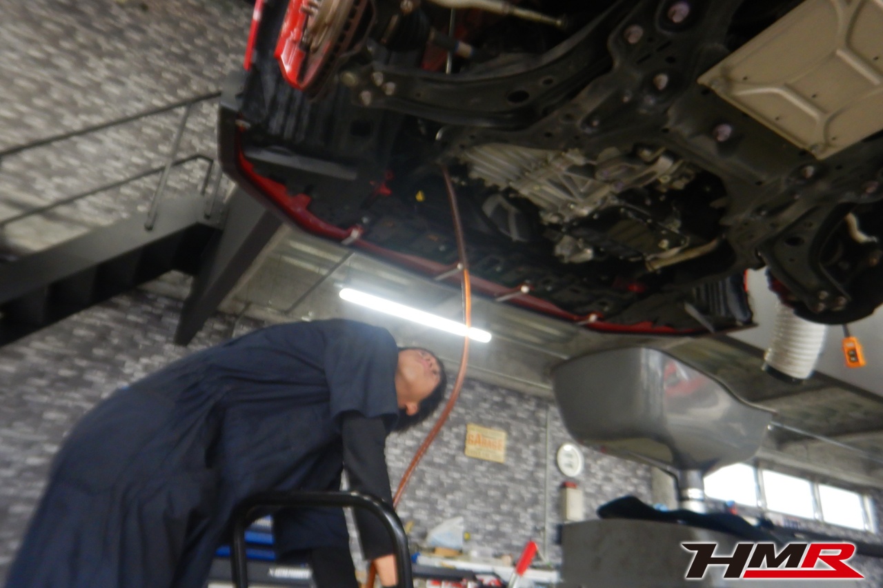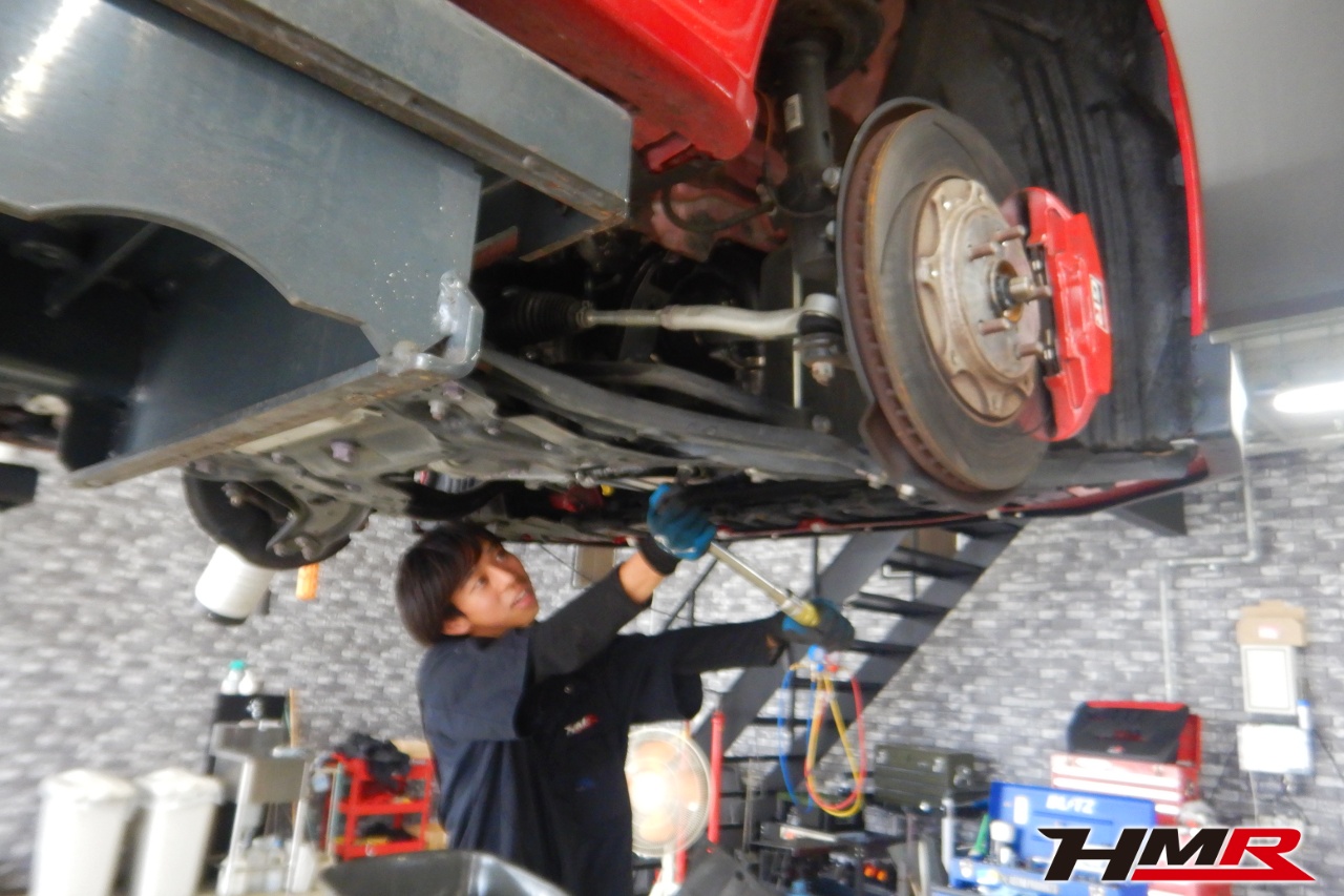 ハブベアリング・ボールジョイント、アーム・リンク類のガタ、ブッシュ・ブーツ類の劣化、エンジン・ミッション・デフからのオイル漏れと各マウント類、タイヤ溝の残量、空気圧の点検しました。特に問題ありませんでした。