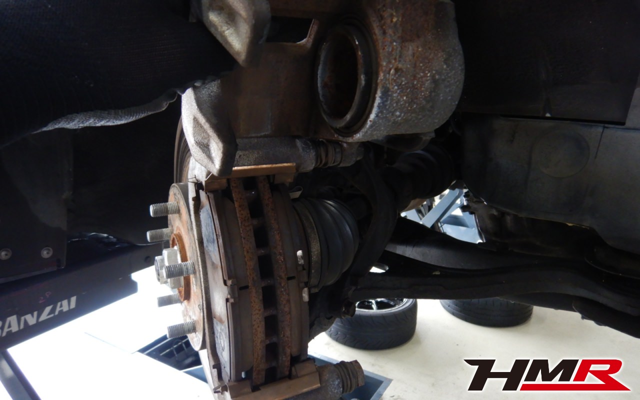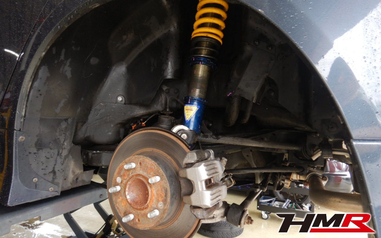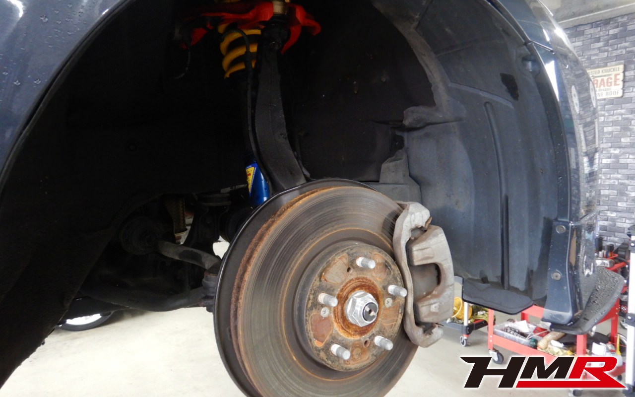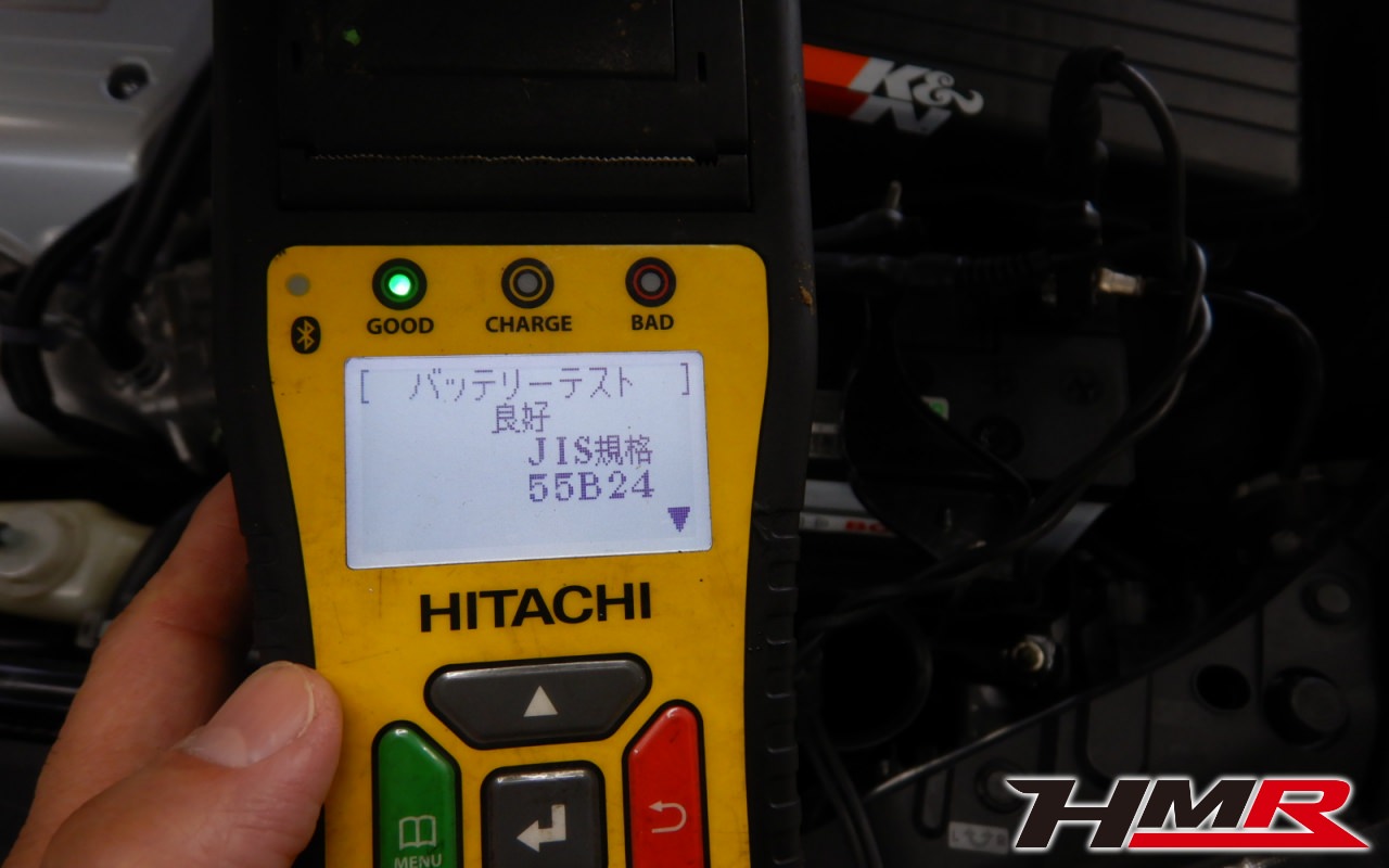 まず最初にバッテリーの健全性を点検しましたが特に問題なく良好な状態でした。健全性が低くなっていくとしっかり充電されなくなったり、本来の電力を発揮出来無くなり走行に支障をきたす場合があります。スマートフォン・タブレットの充電などでバッテリーに負荷が掛かりやすいので注意が必要です。バッテリーの交換時期は使用状況によりますが3〜5年のサイクルで交換することをおススメいたします。 インテークホースの点検を行いました。特に問題ありませんでした。インテークホースは経年劣化で蛇腹部分に亀裂が入ると、そこからエアフィルターを通さない空気を吸いエンジン不調に繋がる可能性があります。定期的な点検をおススメいたします。 エアフィルターの点検を行います。汚れもなく問題ありませんでした。汚れで目詰まりを起こすと燃費悪化やエンジン本来の性能を発揮できなくなります。定期的にケースを開けて目視で確認してみましょう。  次に冷却系廻りを点検していきます。ホースに漏れはありませんでした。経年劣化していくと亀裂が入りそこから冷却水が漏れてしまいエンジンがオーバーヒートを起こす可能性があります。定期的な点検をおススメいたします。 続いて補機ベルトの状態およびオートテンショナーの異音やガタが無いかを点検していきます。問題ありませんでした。ベルトが切れてしまうとバッテリー充電が出来なくなり最悪エンジンが停止する恐れがあります。定期的な点検をおススメいたします。 続いてプラグの点検を行いました。4本とも特に問題ありませんでした。先端の部分がひどく汚れてしまうとエンジンが掛かりづらくなったり、走行中に失火が起こり故障の原因となります。エンジンが掛かりづらくなるなどの症状が出た場合は当店にご相談ください。 続いてリフトアップして足廻りをチェックしていきます。まず最初にタイヤを縦横に揺らしてハブベアリングとボールジョイントのガタがないかチェックを行います。左後ろのハブボルト1本のネジ山が潰れていたので交換しました。走行中に異音やハンドルのガタつきなどを感じた場合は当店へお早めにご相談下さい。  リフトアップして下廻りをチェックしていきます。特に目立つようなキズやサビもなくきれいな状態でした。 足廻りのブッシュ・ブーツをチェックしていきます。ブッシュ・ブーツにヒビが入ってしまいそのままにしておくとそこからグリスが漏れ出したり、異物が侵入して足廻りの機能に支障をきたすだけではなく、車検を通過できなくなってしまいます。またそれ以外にもダンパーのオイル漏れがないかを点検していきます。  ダンパーからは少しオイルが滲んできているのが確認できました。社外車高調なので、どこかのタイミングでオーバーホールしていただくのがいいかもしれませんね。