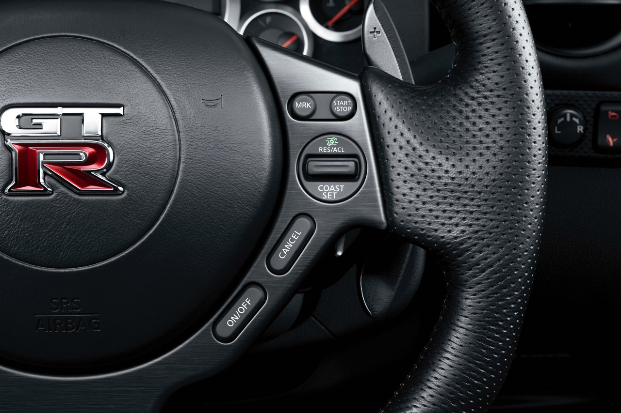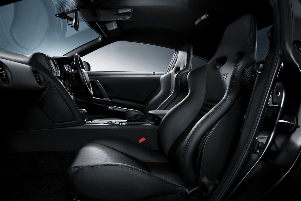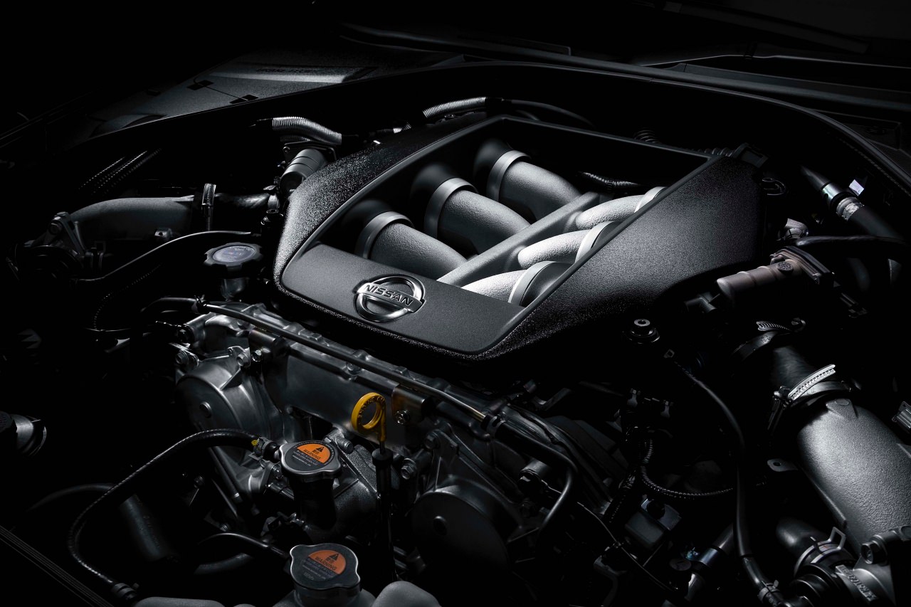 日産GT-Rの心臓部である3.8L V型6気筒ツインターボエンジン「VR38DETT」は、その価格差からNISMOに近いチューニングが施されているのではと一見思ってしまうが、基本スペックは標準モデルと同等(485〜530馬力)である。標準モデルとの違いは、ターボチャージャーの過給圧を一時的に高める「ハイギヤードブースト」をスイッチをステアリングホイール上に設けている。