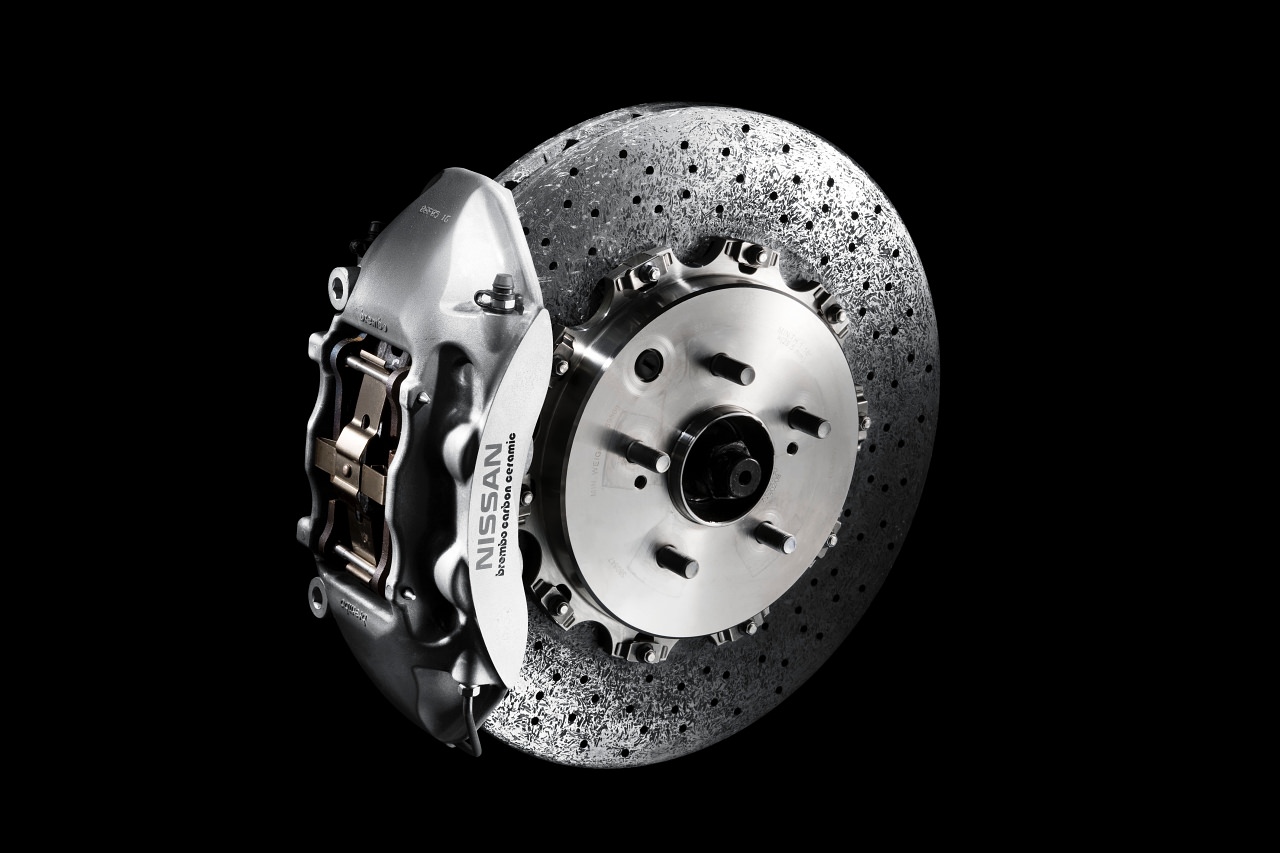 このスペックV最大のポイントでもっとも高額なパーツは、このカーボンセラミック製ブレーキ「NCCB(Nissan Carbon Ceramic Brake)」である。GT-R開発時から同時進行で進められてきたパーツで、レーシングユースのカーボンセラミックブレーキをベースに、日常走行での使用を両立させたブレーキシステムになっている。NCCBの特徴として、通常モデルのスチールブレーキに比べて1輪あたり5kgも軽量であることである。それだけにメンテナンスも特別な作業、技術が求められるので販売店舗の少なさの理由の一つである。