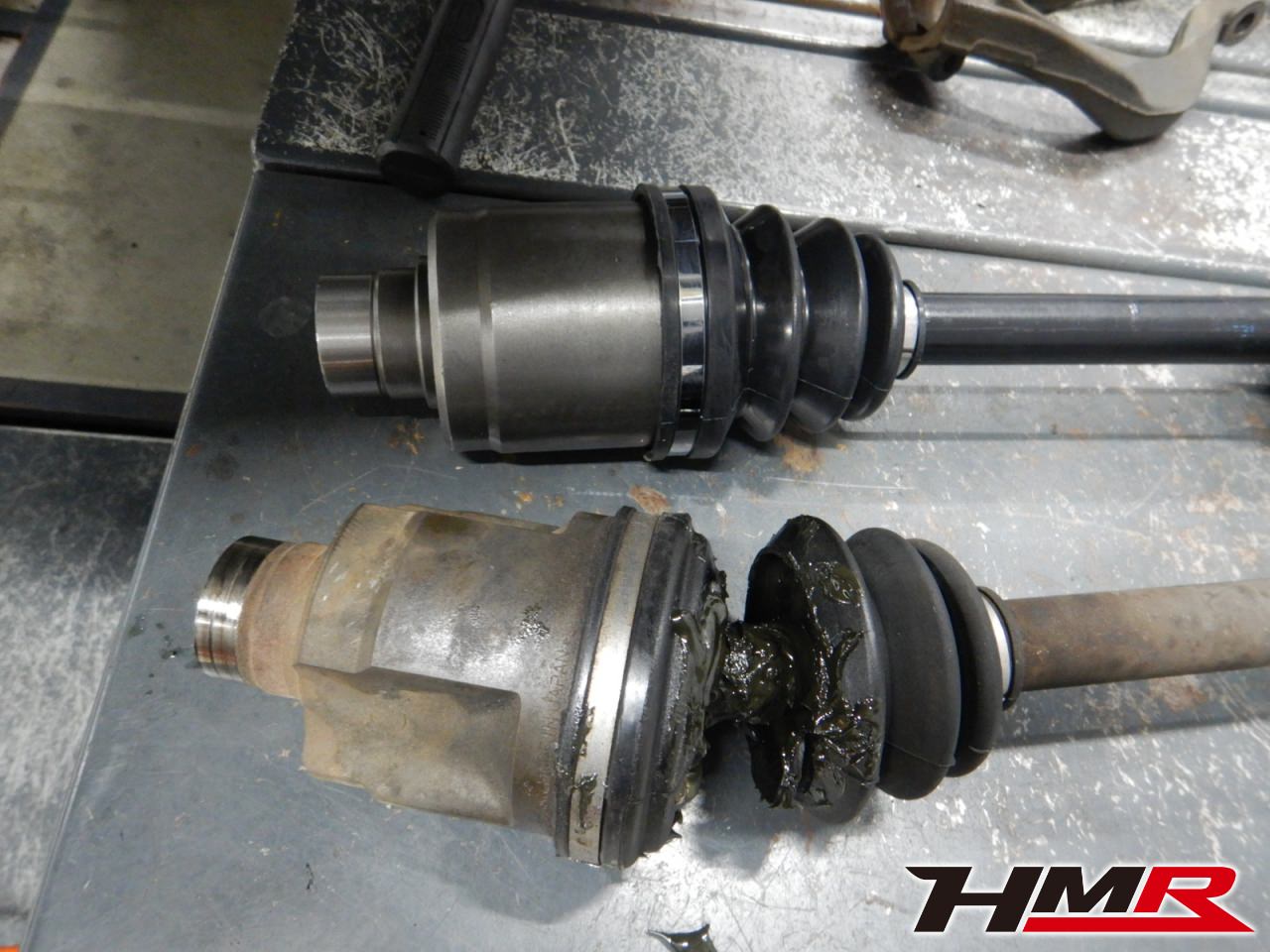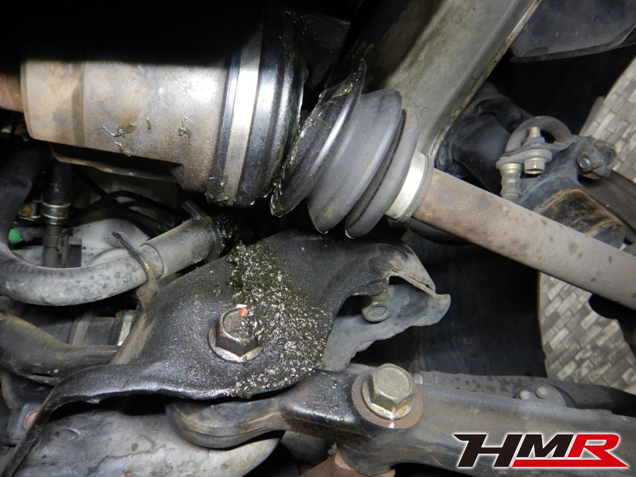 写真でわかるようにドライブシャフトのインナーブーツが大きく切れてしまいグリスが飛び散ってしまっています。このまま走り続けていると路上のチリ・ゴミや水が侵入し、ブーツが覆っているジョイントが傷んでしまいます。そうなるとコーナリングなどでカラカラ音が鳴り出したり、最悪ドライブシャフトが破損し走行できなく恐れがあります。