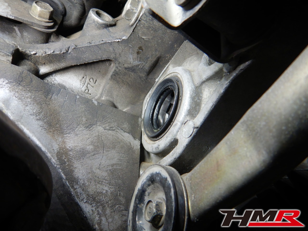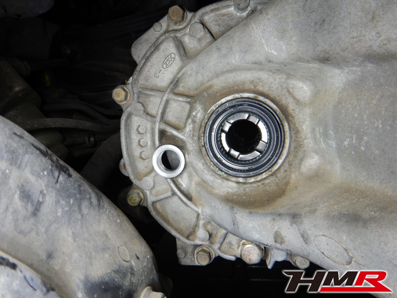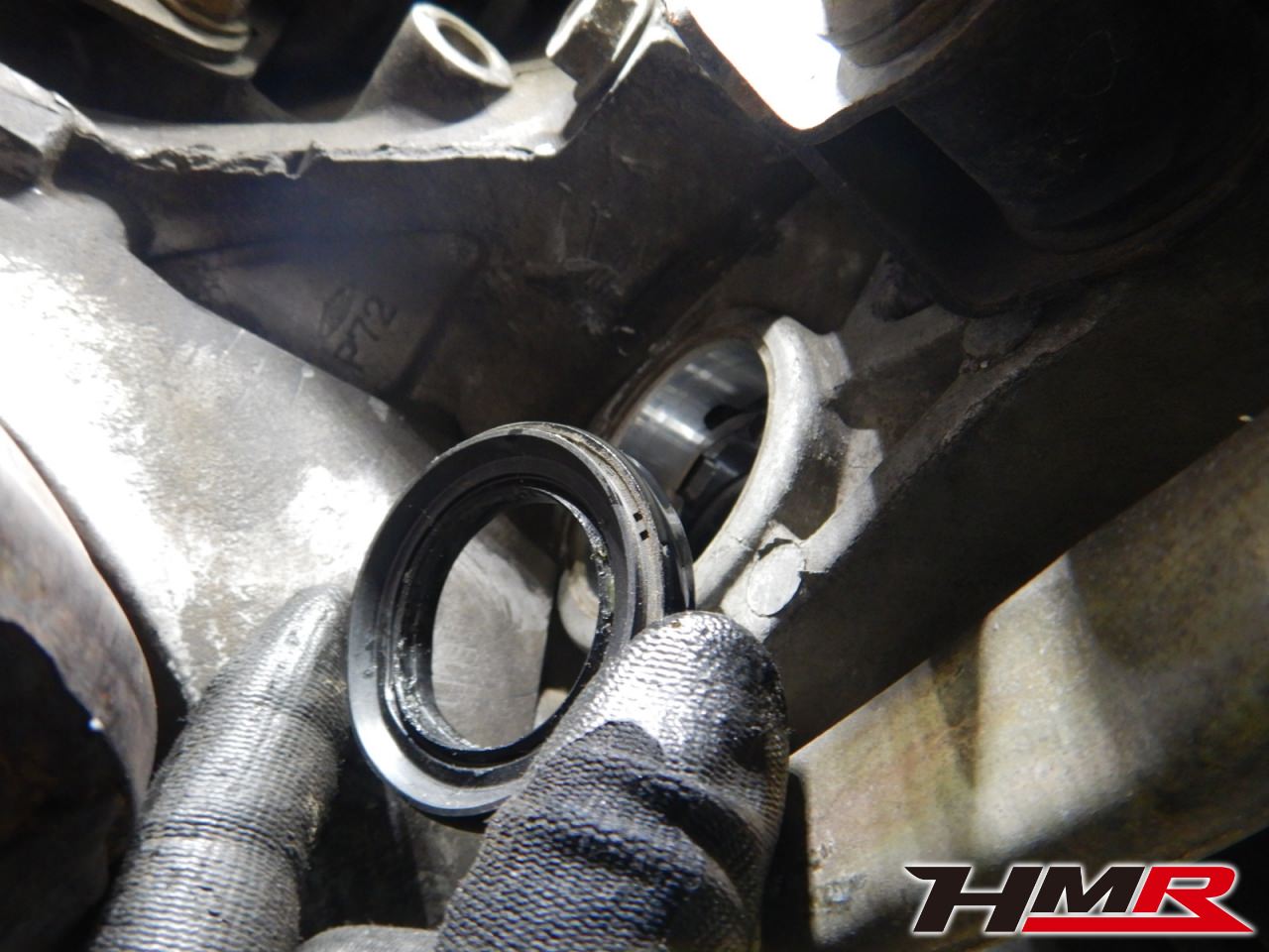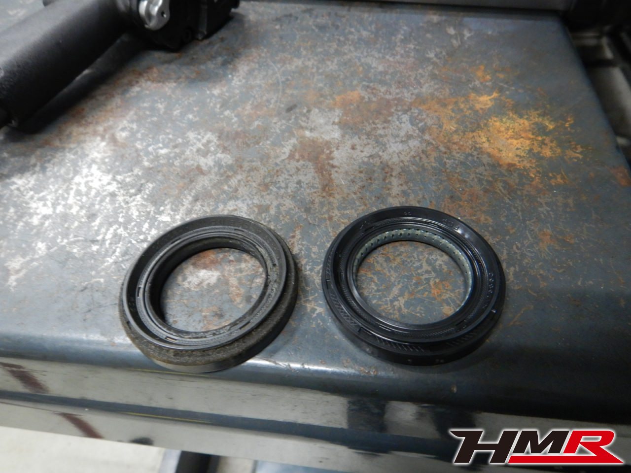 上のリビルト品と比較すると、その破れ具合の深刻さがわかりやすいですね。  交換の前に飛び散ってしまったグリスをキレイに取り除いていきます。 デフサイドオイルシールも交換します。 こちらも劣化するとオイル漏れを発生しやすい箇所になります。 ドライブシャフトを取付け、ナックルも戻して完了です。