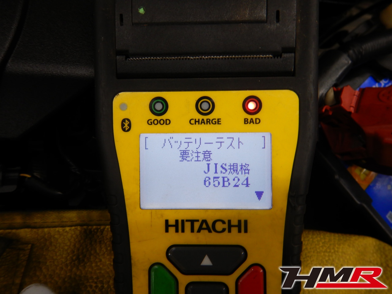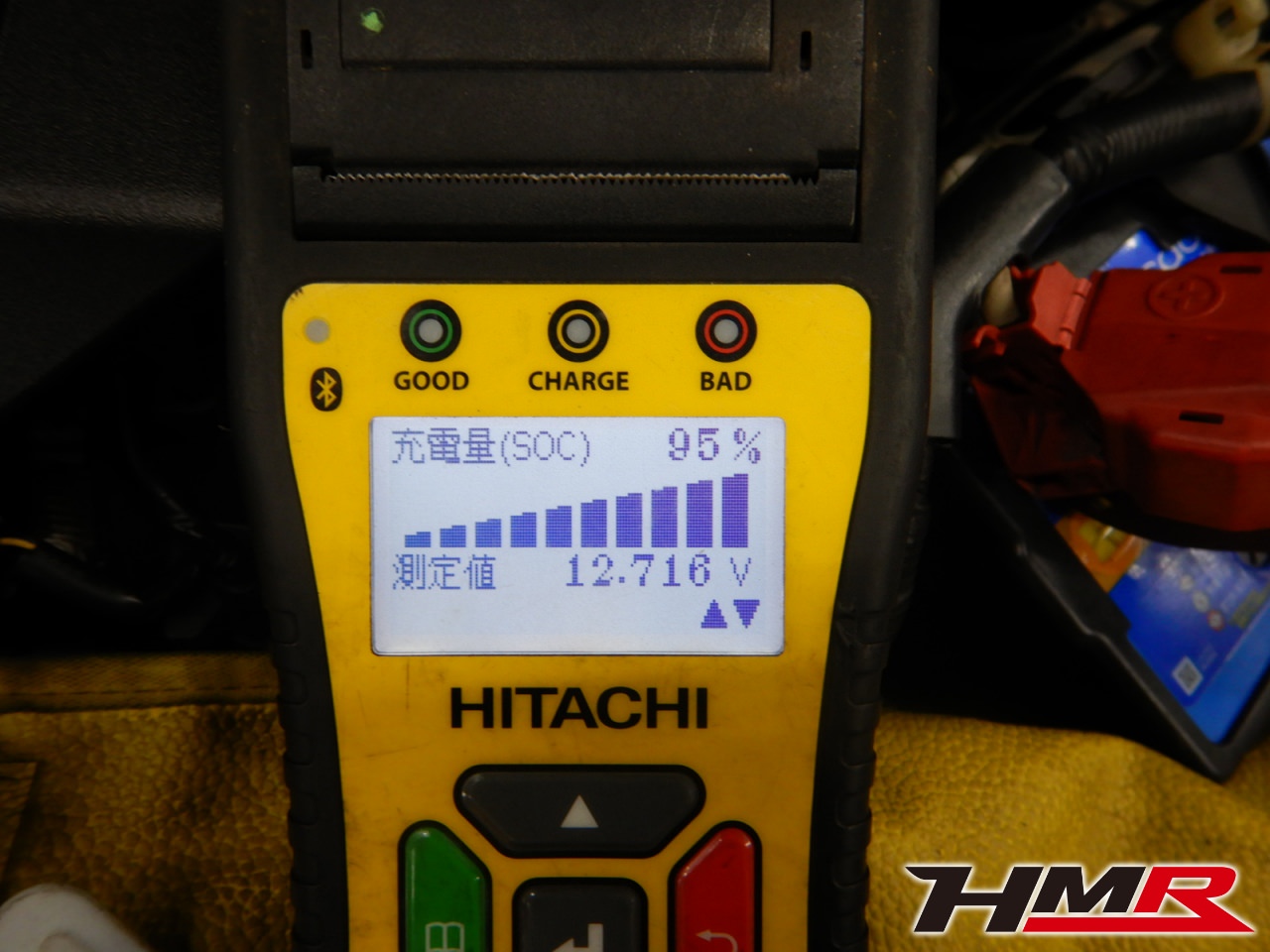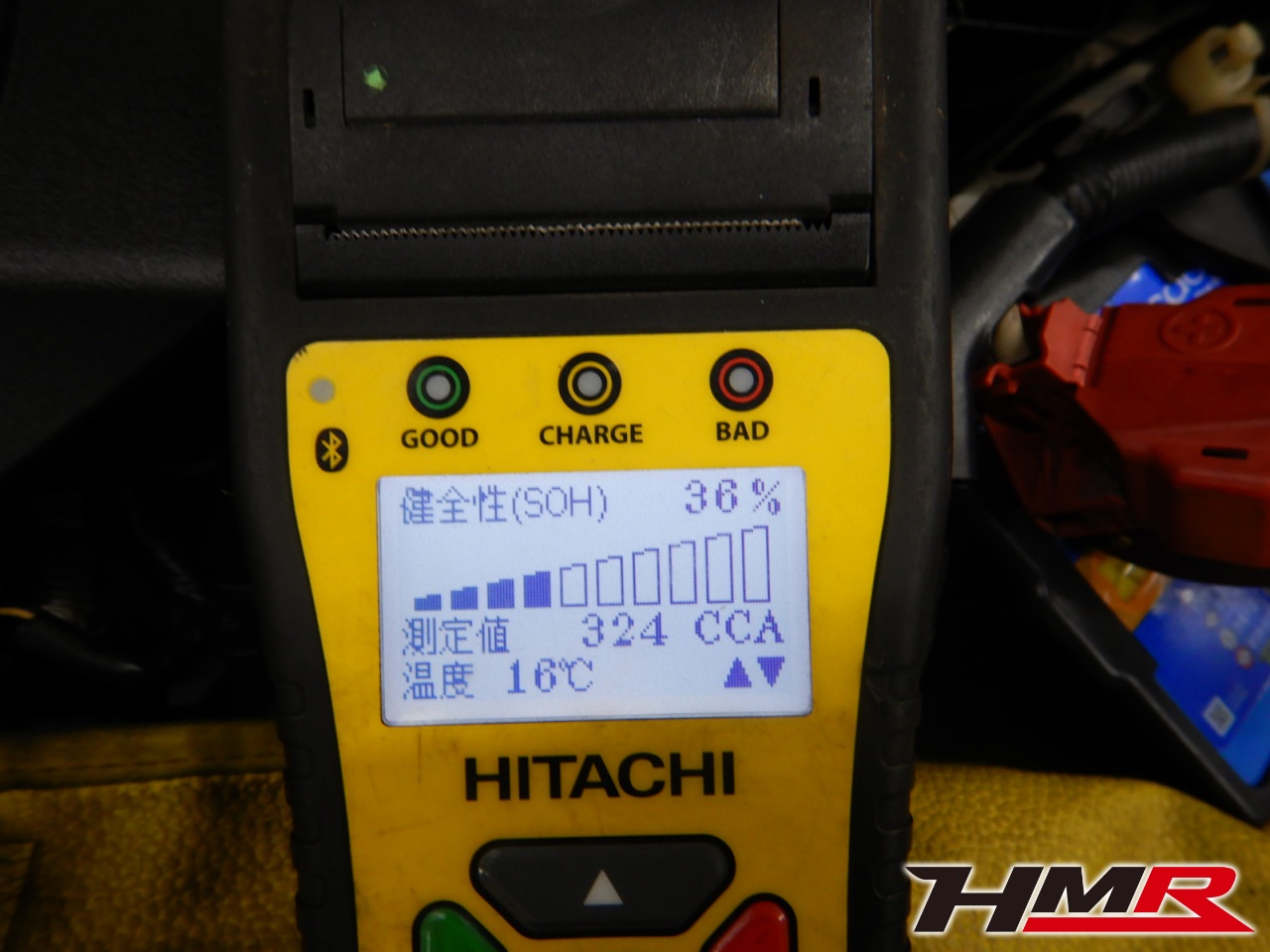 バッテリーテスターでバッテリーを点検していきます。要注意と表示されました。バッテリーの健康度になる「健全性」を表示してみます。この数値が低いと劣化が進んでいます。