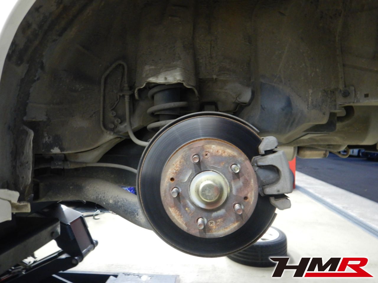 続いてリフトアップして足廻りをチェックしていきます。まず最初にタイヤを縦横に揺らしてハブベアリングとボールジョイントのガタがないかチェックを行います。特に問題ありませんでした。走行中に異音やハンドルのガタつきなどを感じた場合は当店へお早めにご相談下さい。