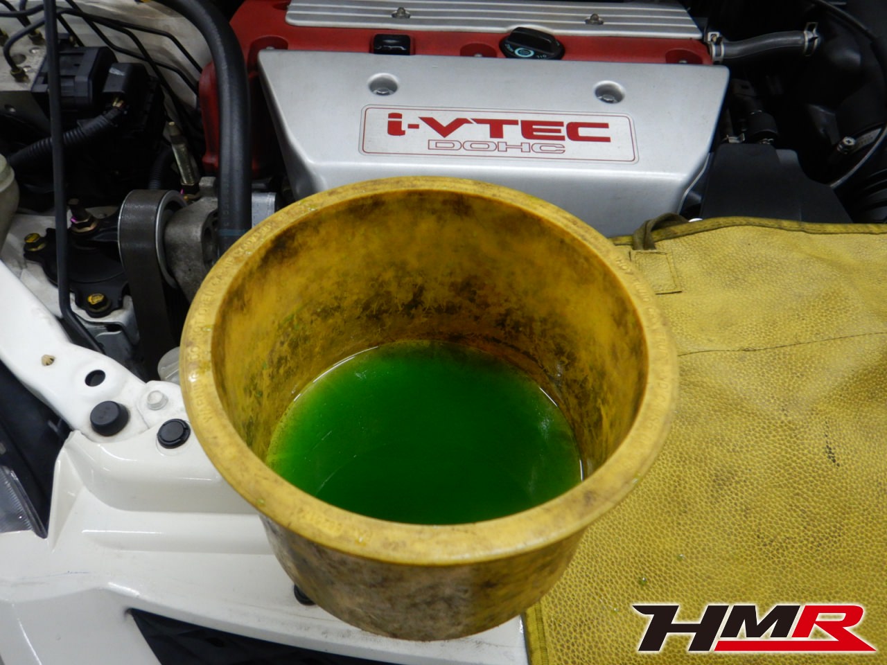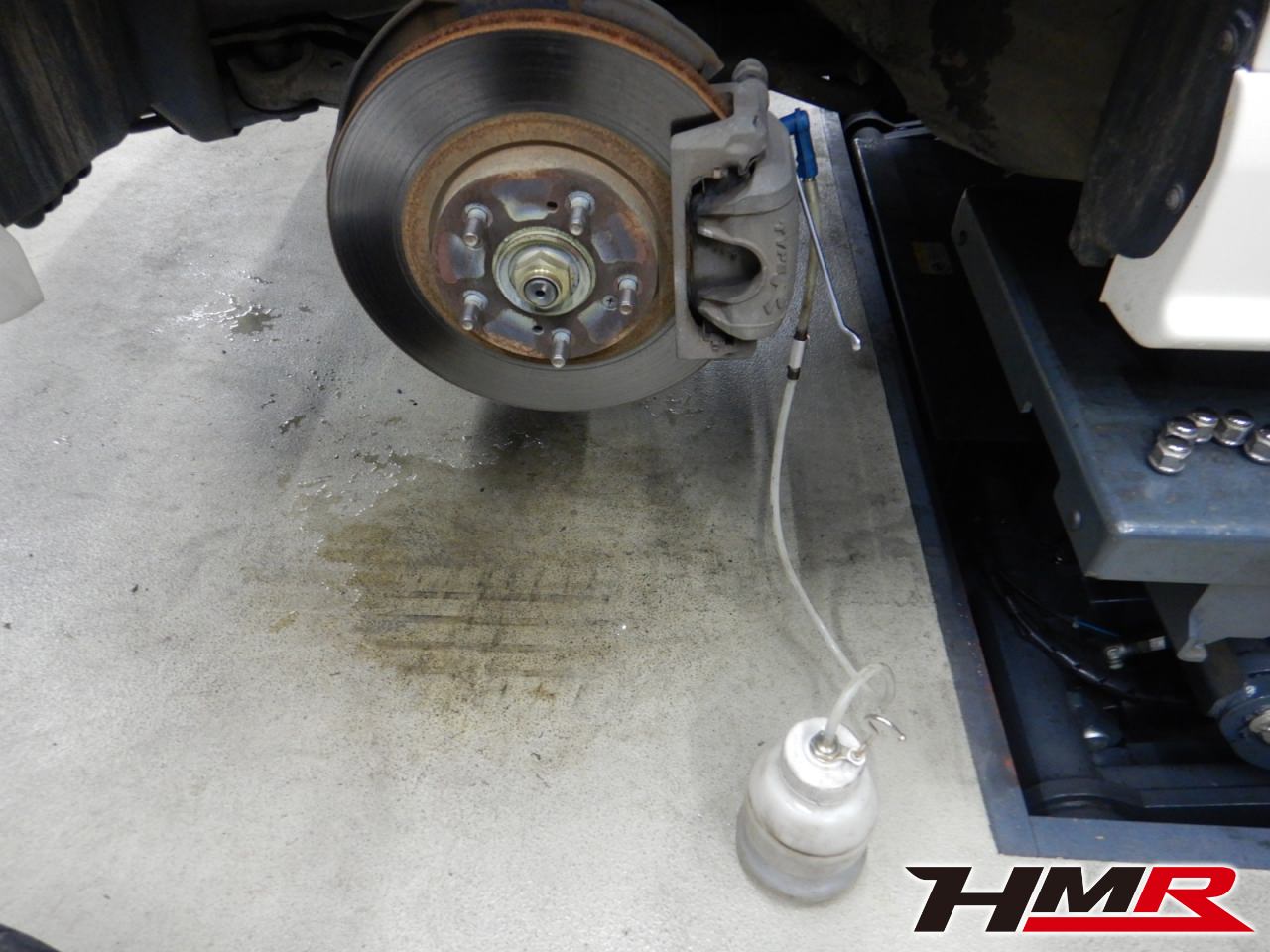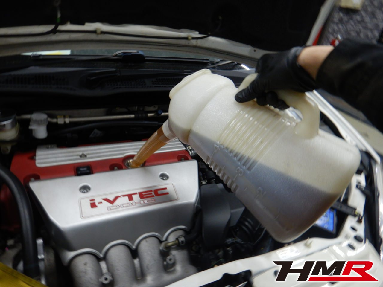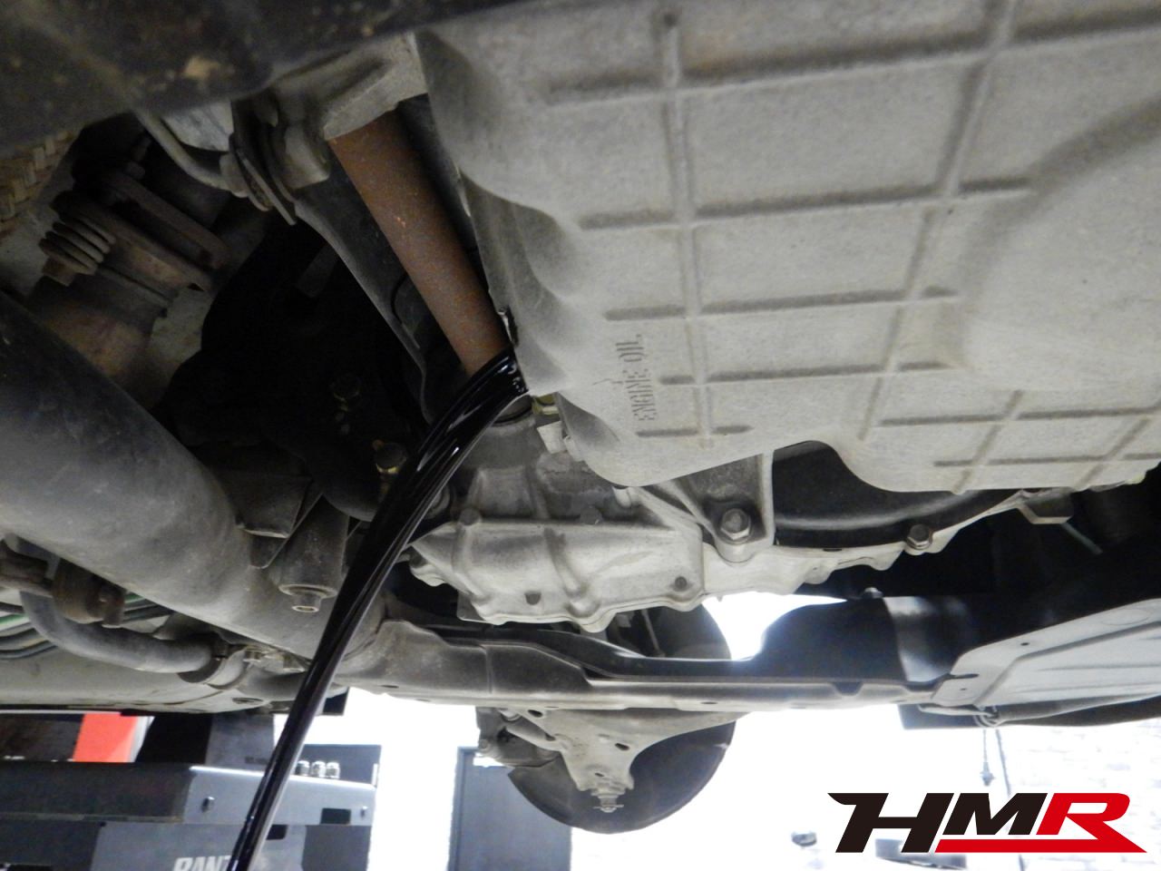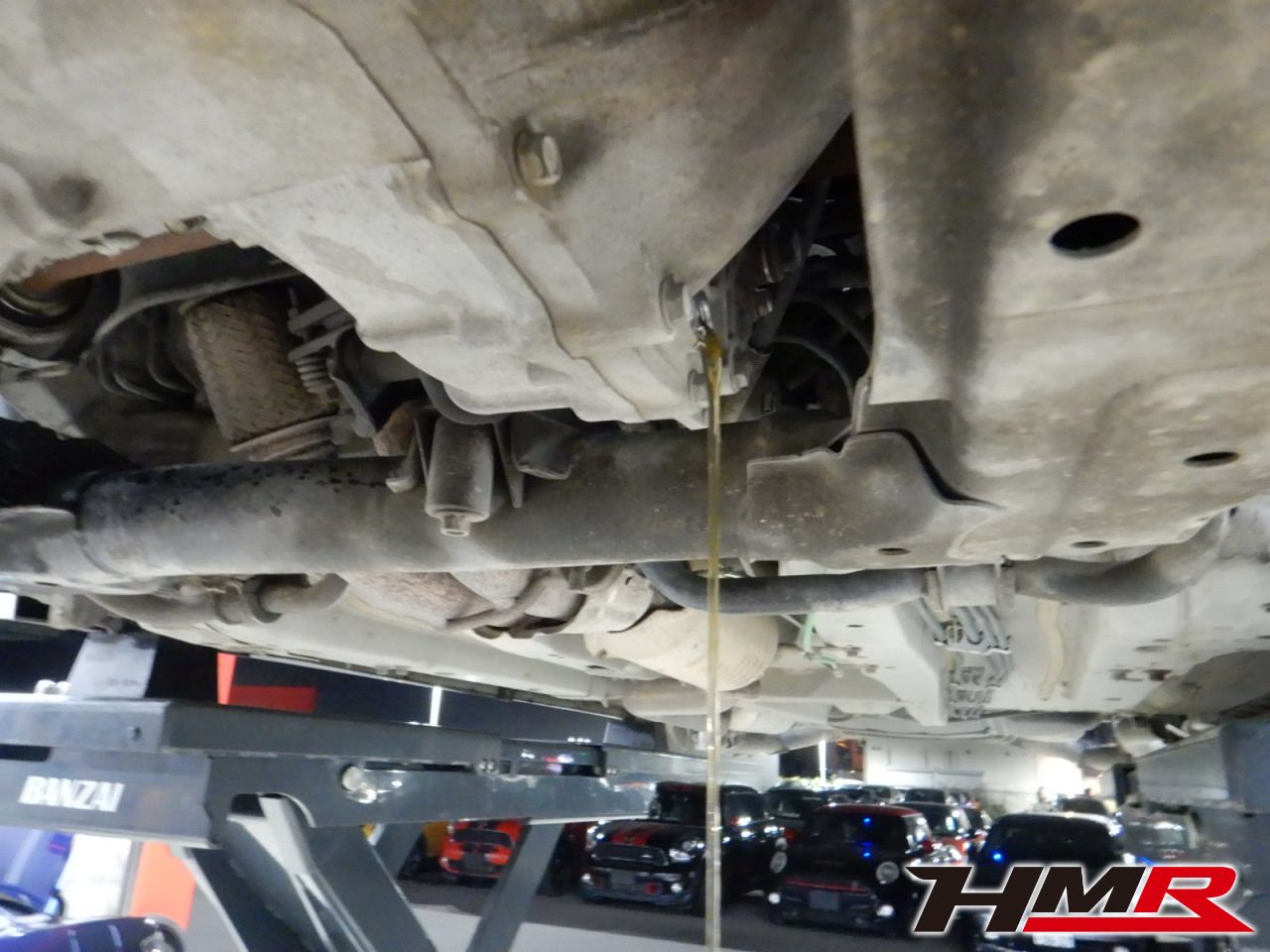 HMRではクルマに応じて、納車前点検でエンジンオイル・ブレーキフルード・ミッションオイル・ラジエタークーラントを新品交換しています。油脂類がリフレッシュされていれば納車してすぐのドライブも安心して楽しめますね。まずエンジンオイルから抜いていきます。エンジンオイルはエンジン内部の潤滑および冷却を行います。定期的な点検を行わず走り続けるとエンジンパワー低下、燃費悪化の原因となります。使用状況によりますが半年または5,000kmでの交換をおススメいたします。