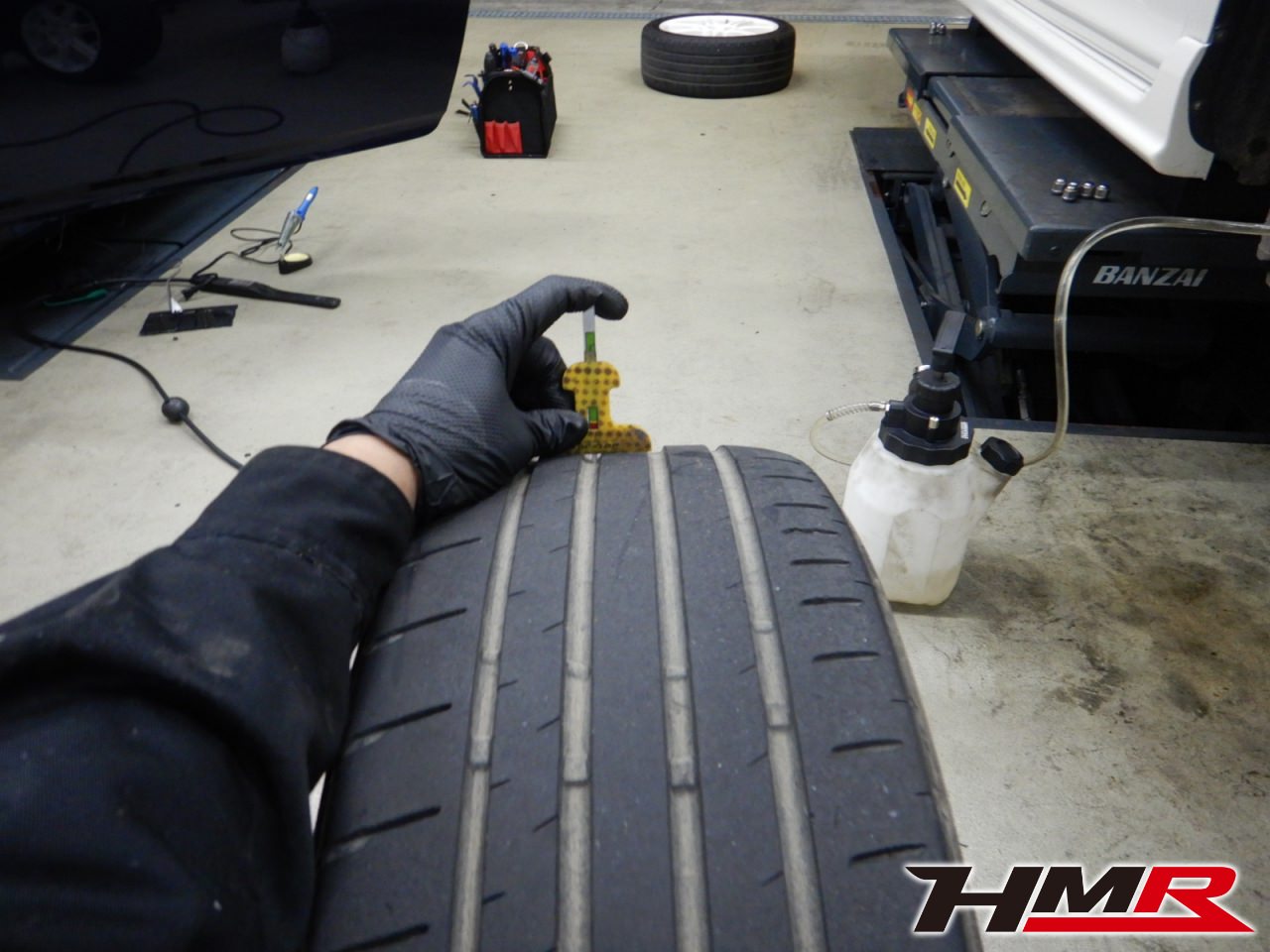 タイヤ溝の残量をチェックしていきます。フロント4.5mm・リア5mmでした。