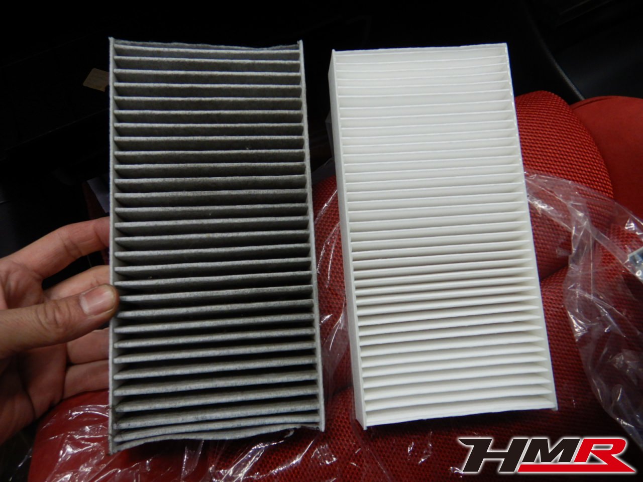 右が新しいエアコンフィルターです。フィルターにホコリや細かなゴミなどが目詰まりしてしまうと車内の不快な匂いの原因につながったり、エアコンの効きが落ちてしまいます。