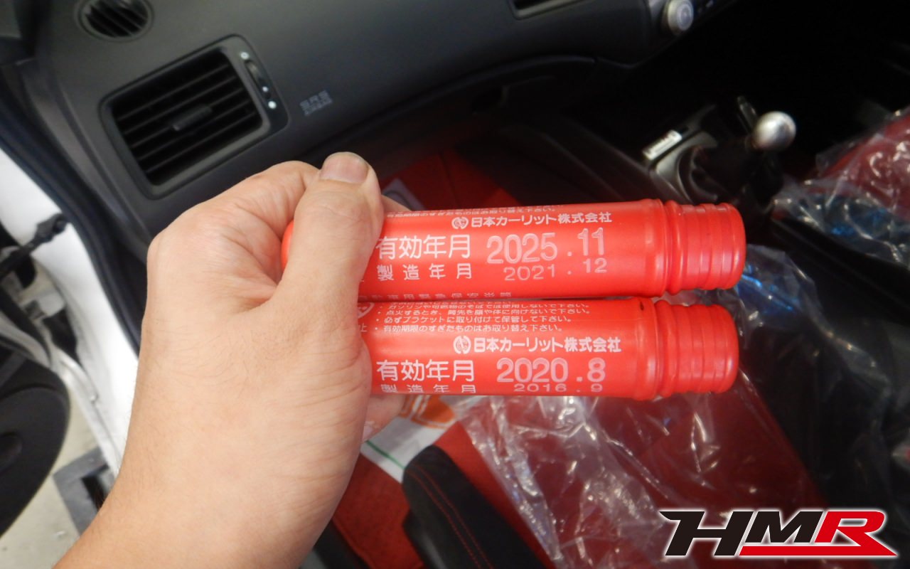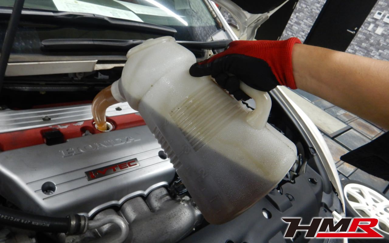 HMRでは納車前点検でエンジンオイルやブレーキフルード、ミッションオイル、ラジエタークーラントを新品交換しています。油脂類がリフレッシュされていれば納車してすぐのドライブも安心して楽しめますね。まずエンジンオイルから抜いていきます。エンジンオイルはエンジン内部の潤滑および冷却を行います。定期的な点検を行わず走り続けるとエンジンパワー低下、燃費悪化の原因となります。使用状況によりますが半年または5,000kmでの交換をおススメいたします。ミッションオイルも抜いていきます。ミッションオイルが劣化していくとギアの入りが悪くなったり、最悪ミッションのギアを痛めてしまいミッションブローに繋がりますので定期的な交換をおススメいたします。 クーラント液も抜いていきます。 新しいミッションオイルを入れていきます。ミッションオイルはホンダ純正のMTF-3を使用しています。 エンジンオイルを入れていきます。エンジンオイルはWAKO’SプロステージS 100%化学合成油 10W-40を使用しています。 次にブレーキフルードを交換しました。フルードはDOT4を使用しています。交換タイミングは、車検毎をおススメしております。 タイヤ溝の残量をチェックしていきます。フロント・リアともに4mmでした。 各タイヤの空気圧チェックをしています。タイヤのエアはゆっくり少しずつ抜けていきます。ガソリンスタンドで簡単に入れられますので1ヶ月に1度のチェックをおススメいたします。  リモコンキーの電池を交換しました。 エアコンフィルターを交換しました。エアコンフィルターは取り込んだ外気に含まれるチリやゴミを受け止めてくれます。交換せずに使用を続けていくとエアコンの性能が発揮できないだけでなく、車内の不快な匂いの原因に繋がってしまいます。 サンフレアの有効期限が切れていたので交換します。サンフレアは有効期限が切れていても車載されていれば車検は問題ありません。但しいざとなった時に使えるとは限りませんのでHMRでは有効期限が切れたものは交換させていただいております。