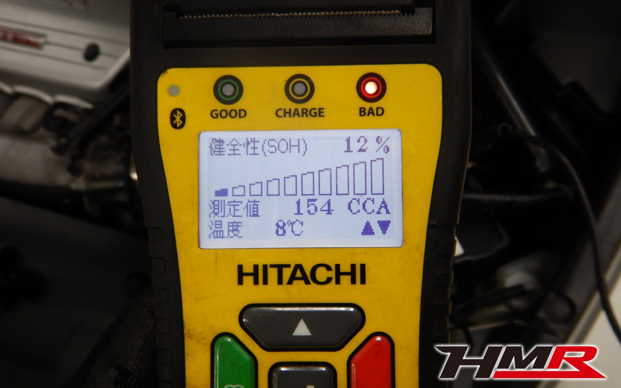 まずエンジンルーム内を点検していきます。 まず最初にバッテリーテスターでバッテリーを点検していきます。 健全性がかなり低いと出ました。つまり劣化が進んでいるということですので後ほど交換させていただきました。バッテリーの交換時期は使用状況によりますが3〜5年のサイクルで交換することをおススメいたします。また寒い時期になるとバッテリー上がりが多くなります。少しでもマメにエンジンを掛けて充電したり、カー用品店などで購入できる充電器を用意しておくといいでしょう。続いてエアフィルターの点検をしていきます。全体的に「汚れているな」、とわかるぐらいに取り込んだ空気の中に含まれていたチリやゴミが付着していましたので後ほど交換させていただきました。