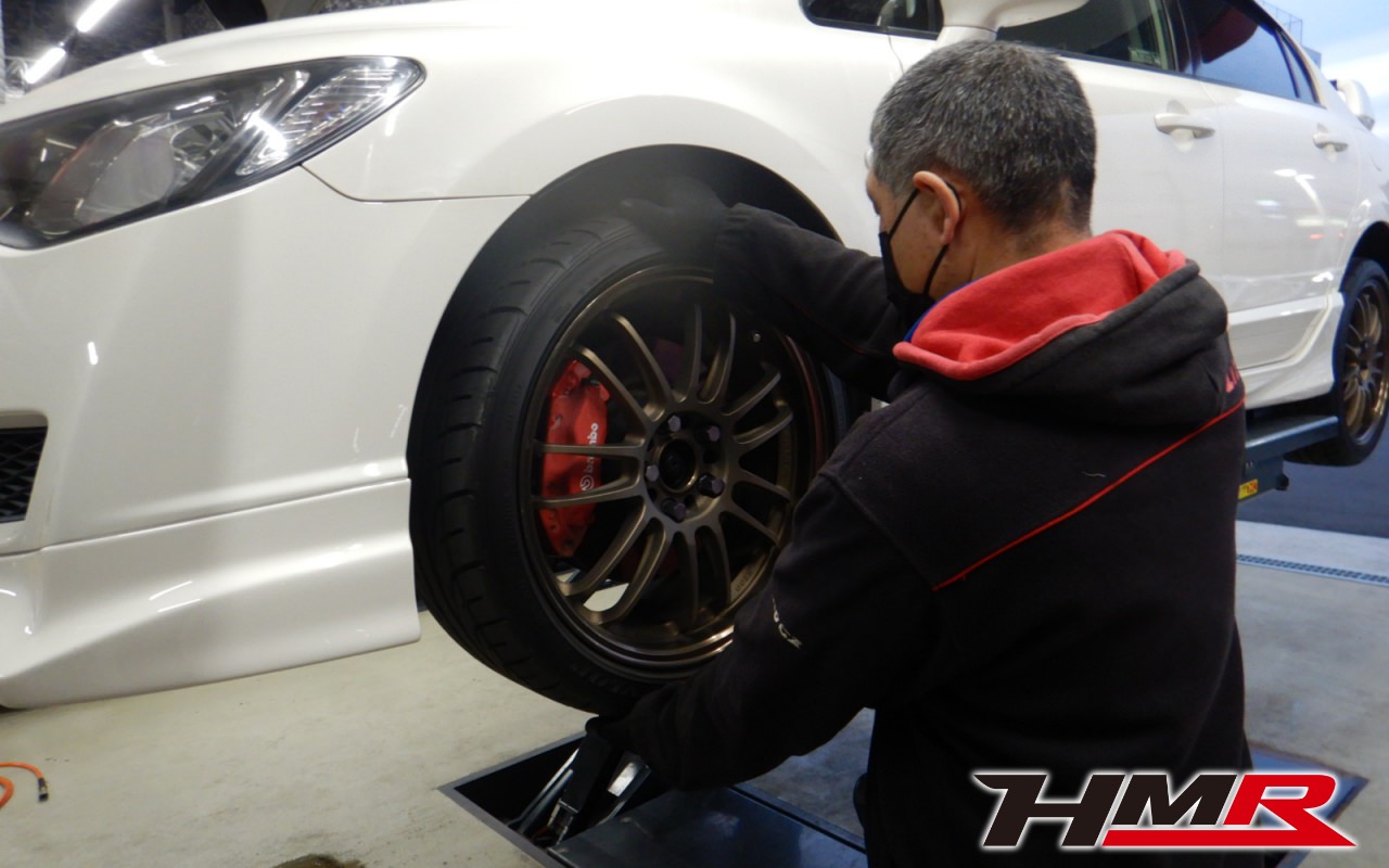 HMR(エイチエムアール)の栗原です。今回はレイズRE30 18インチ オーリンズ車高調 無限マフラー装備のシビックタイプR(FD2)の納車前点検整備を行いました。担当メカニックはワタナベです。