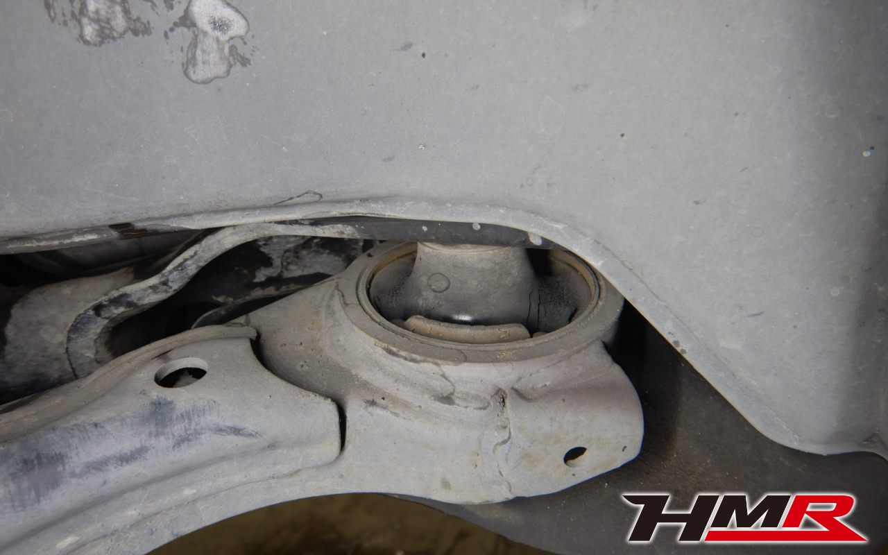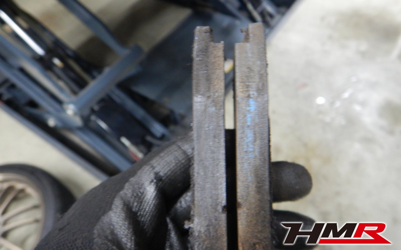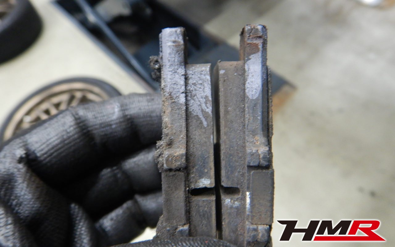 汚れで目詰まりを起こすと燃費悪化やエンジン本来の性能を発揮できなくなります。こちらも定期的にケースを開けて目視で確認してみましょう。 次に冷却系廻りを点検していきます。ホースに漏れはありませんでした。経年劣化していくと亀裂が入りそこから冷却水が漏れてしまいエンジンがオーバーヒートを起こす可能性があります。定期的な点検をおススメいたします。 続いて補機ベルトの状態およびオートテンショナーの異音やガタが無いかを点検していきます。問題ありませんでした。ベルトが切れてしまうとバッテリー充電が出来なくなり最悪エンジンが停止する恐れがあります。定期的な点検をおススメいたします。 続いてプラグの点検を行いました。4本とも特に問題ありませんでした。先端の部分がひどく汚れてしまうとエンジンが掛かりづらくなったり、走行中に失火が起こり故障の原因となります。エンジンが掛かりづらくなるなどの症状が出た場合は当店にご相談ください。 続いてリフトアップして足廻りをチェックしていきます。まず最初にタイヤを縦横に揺らしてハブベアリングとボールジョイントのガタがないかチェックを行います。特に問題ありませんでした。走行中に異音やハンドルのガタつきなどを感じた場合は当店へお早めにご相談下さい。  リフトアップして下廻りをチェックしていきます。特に目立つようなキズやサビはありませんでした。  足廻りのブッシュ・ブーツ、ダンパーをチェックしていきます。ブッシュ・ブーツにヒビが入ってしまいそのままにしておくと、そこからグリスが漏れ出したり、異物が侵入して足廻りの機能に支障をきたすだけではなく、車検を通過できなくなってしまいます。  フロントロアアームブッシュにヒビが見つかりました。 ブレーキキャリパーシールの状態やキャリパーピストンの動きに問題ありませんでした。 シールが劣化するとピストンに水が進入して錆が発生し、ピストンの動きを妨げてしまいブレーキの引きずり症状に繋がる可能性があります。 パッドの残量をチェックしていきます。フロント3mm・リア6mmでした。フロントの残量が少なくなってきていますのでお早めの交換をオススメさせていただきました。