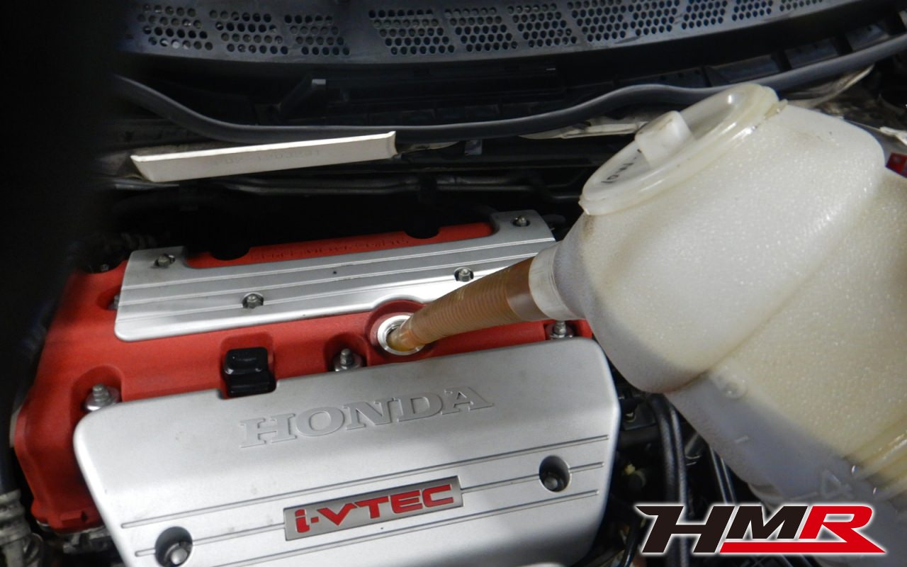 HMRではクルマに応じて、納車前点検でエンジンオイル・ブレーキフルード・ミッションオイル・ラジエタークーラントを新品交換しています。油脂類がリフレッシュされていれば納車してすぐのドライブも安心して楽しめますね。まずエンジンオイルから抜いていきます。エンジンオイルはエンジン内部の潤滑および冷却を行います。定期的な点検を行わず走り続けるとエンジンパワー低下、燃費悪化の原因となります。使用状況によりますが半年または5,000kmでの交換をおススメいたします。オイルフィルターも交換していきます。フィルターの交換のタイミングはオイル交換2回ごとになります。 ミッションオイルも抜いていきます。ミッションオイルが劣化していくとギアの入りが悪くなったり、最悪ミッションのギアを痛めてしまいミッションブローに繋がりますので定期的な交換をおススメいたします。  クーラント液も抜いていきます。 交換するミッションオイルはホンダ純正のMTF-3を使用しています。  エンジンオイルを入れていきます。エンジンオイルはWAKO’SプロステージS 100%化学合成油 10W-40を使用しています。 次にブレーキフルードを交換しました。フルードはDOT4を使用しています。交換タイミングは、車検毎をおススメしております。   新しいクーラント液を入れていきます。タイヤ溝の残量をチェックしていきます。フロント・リア6mmでした。  グローブボックス奥にあるエアコンフィルターも取り外したらゴミがびっしりと付着していましたので交換させていただきました。   左が新しいエアコンフィルターです。フィルターにホコリや細かなゴミなどが目詰まりしてしまうと車内の不快な匂いの原因につながったり、エアコンの効きが落ちてしまいます。 リモコンキーの電池を交換しました。  汚れてしまっていたエアクリーナーフィルターを交換しました。写真右が新しいものになります。 バッテリーも交換していきます。写真下が新しいバッテリーになります。  劣化したワイパーブレードゴムを交換しました。 お客様からのご要望でドライブレコーダーを取付しました。元レーシングドライバーの脇阪寿一氏がプロデュースしたOwltech製の前後2カメタイプの製品になります。駐車監視機能が標準装備となります。 今の時代、ドライブレコーダーは安全なドライブの必需品となっています。  写真を撮り忘れたのですがフロント・リアのエンブレムの取付を行いました。以上で作業は終了です。K様、この度はシビックタイプR(FD2)ご契約ありがとうございました。ご納車まで今暫くお待ち下さい。