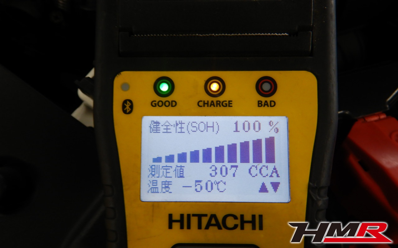 バッテリーテスターでバッテリーの健全性を点検していきます。特に問題ありませんでした。バッテリーの交換時期は使用状況によりますが3〜5年のサイクルで交換することをおススメいたします。
