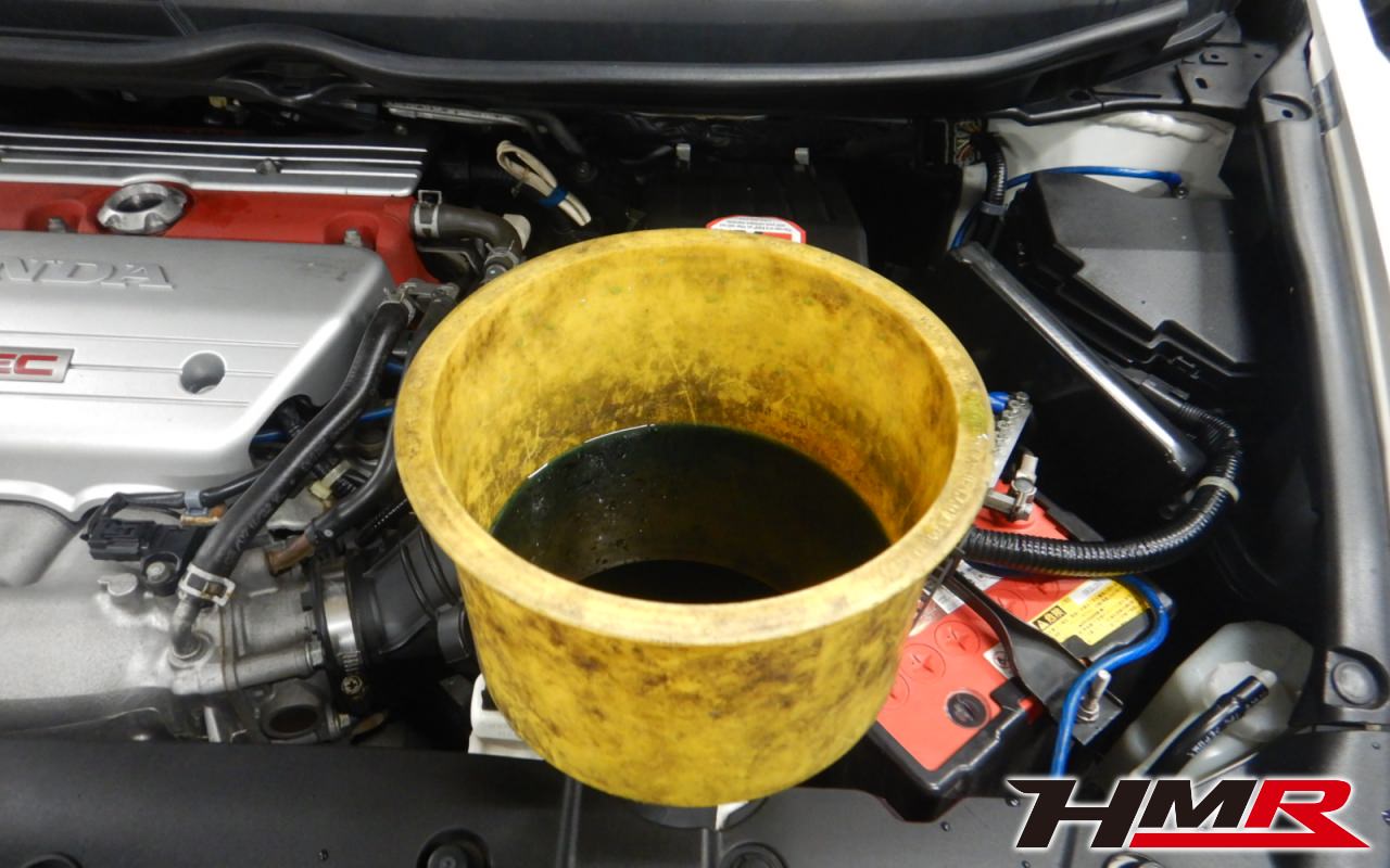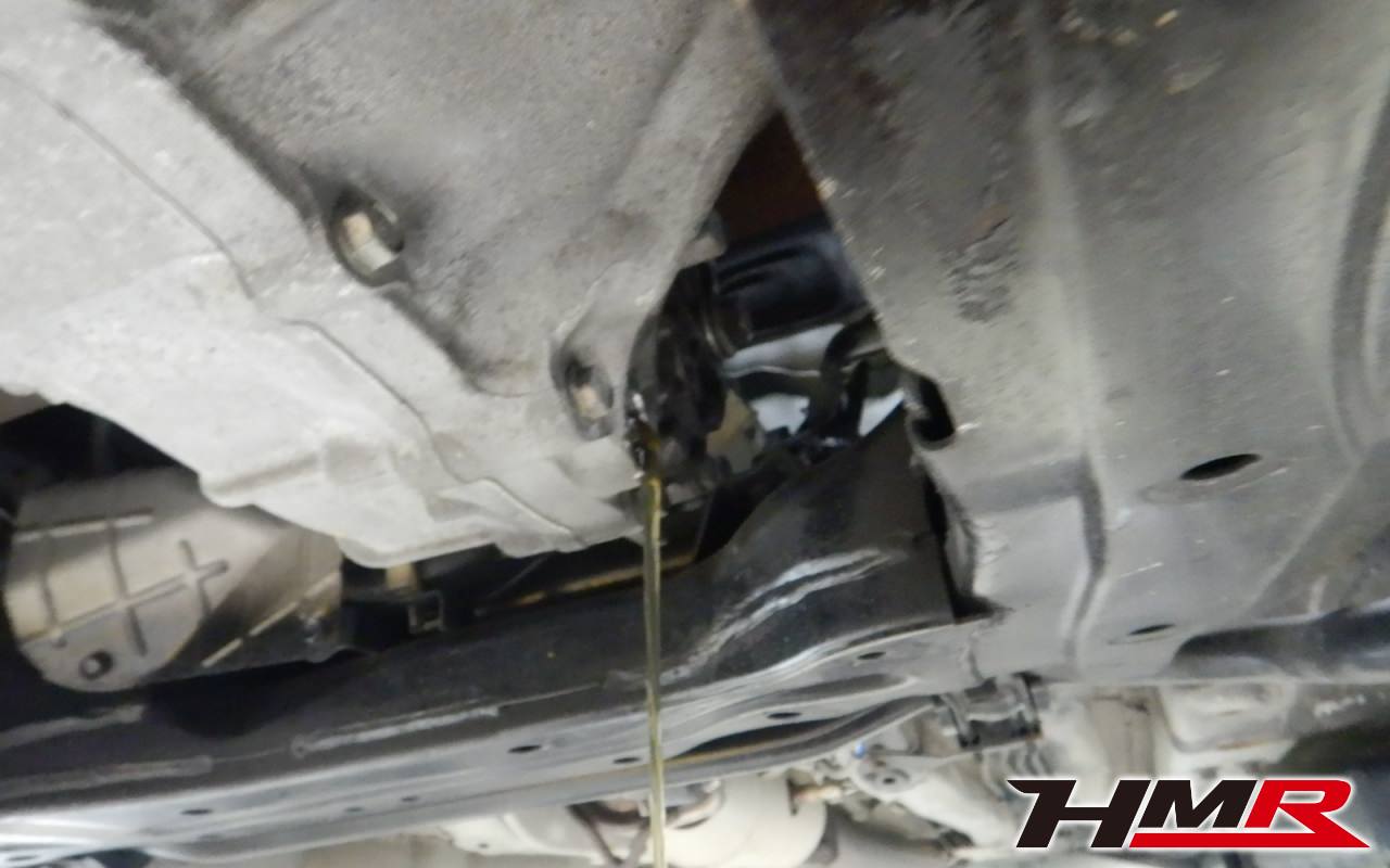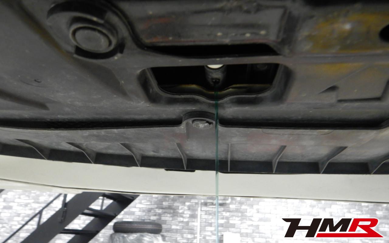 HMR HONDAでは納車前点検でエンジンオイルやブレーキフルード、ミッションオイル、ラジエタークーラントを新品交換しています。油脂類がリフレッシュされていれば納車してすぐのドライブも安心して楽しめますね。まずエンジンオイルから抜いていきます。エンジンオイルはエンジン内部の潤滑および冷却を行います。定期的な点検を行わず走り続けるとエンジンパワー低下、燃費悪化の原因となります。使用状況によりますが半年または5,000kmでの交換をおススメいたします。
