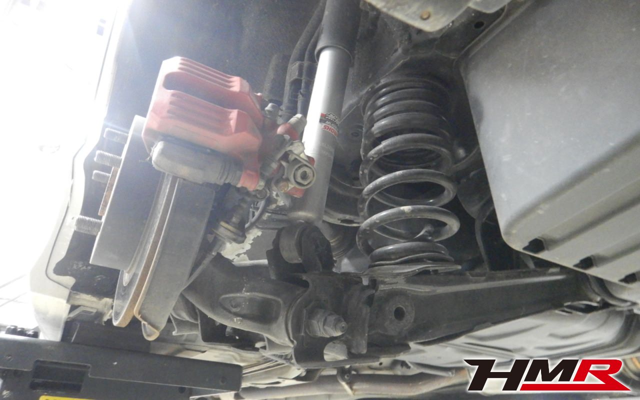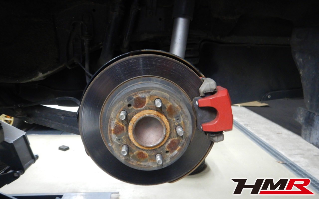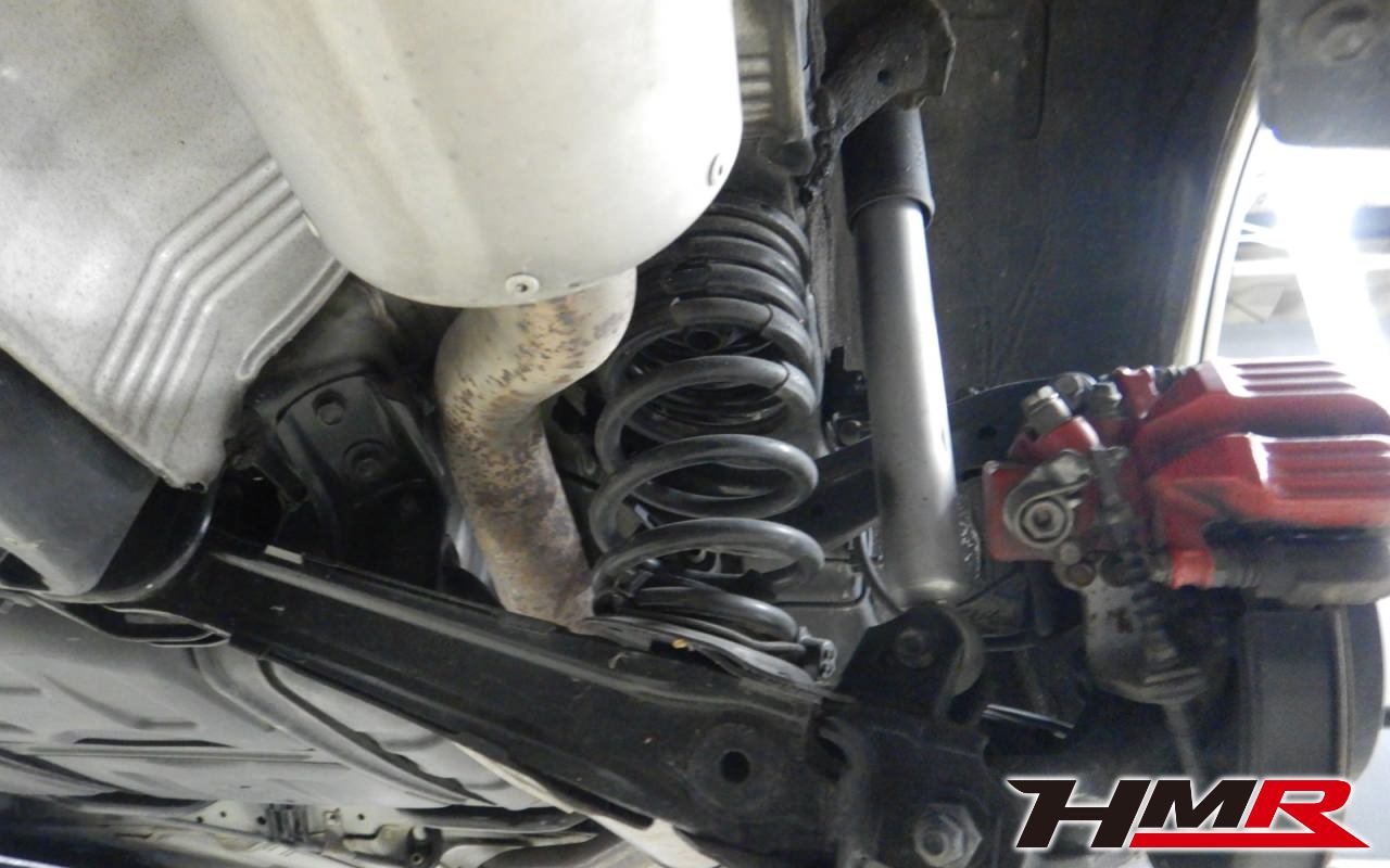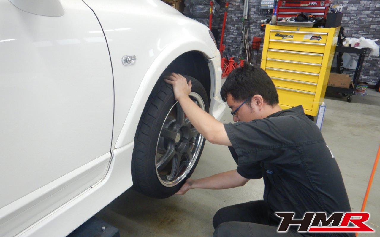 リフトアップして足廻りをチェックしていきます。タイヤを縦横に揺らしてハブベアリングとボールジョイントのガタが無いかチェックを行いましたが問題ありませんでした。走行中に異音やハンドルのガタつきなどを感じた場合は当店へお早めにご相談下さい。