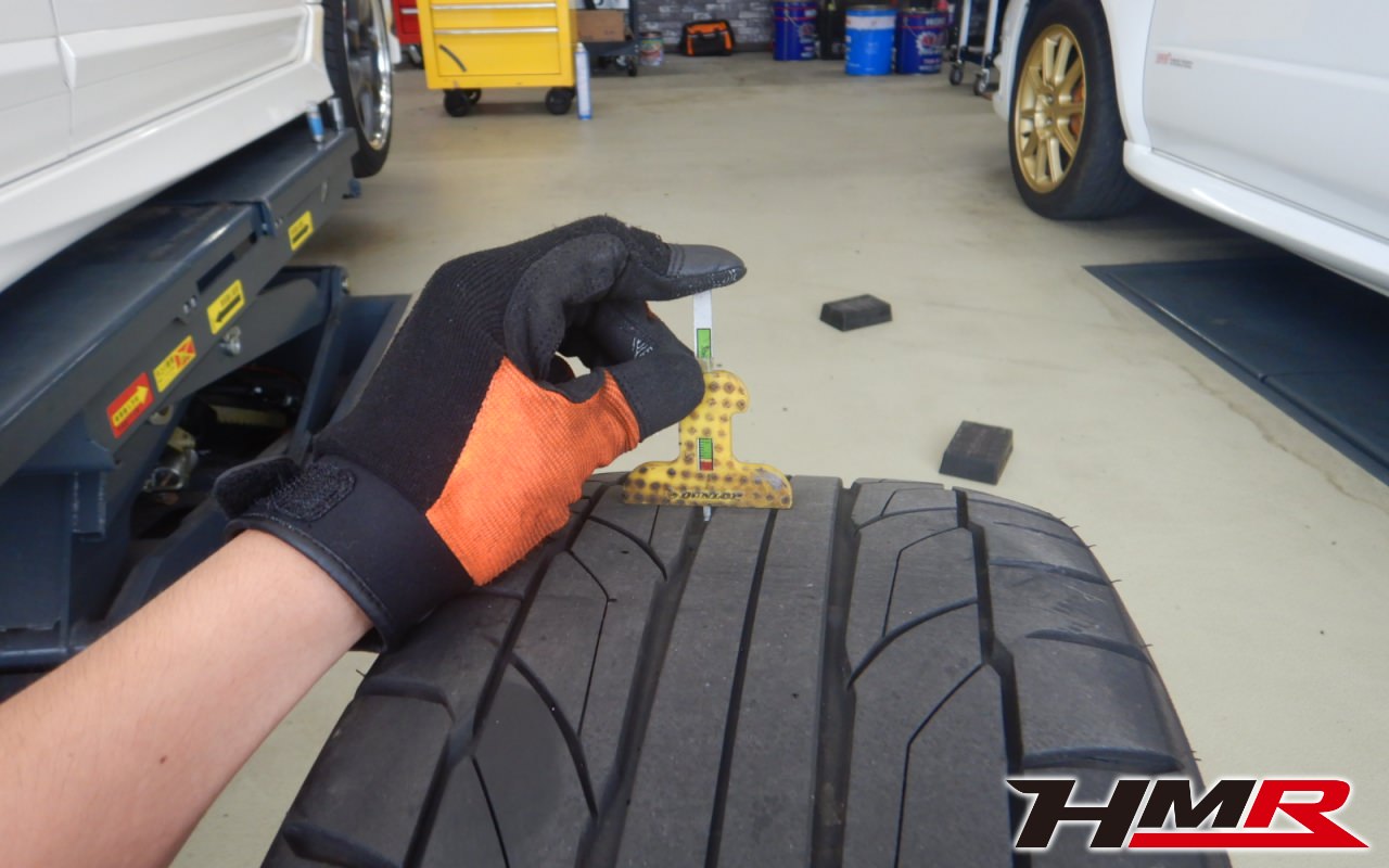 タイヤ溝の残量をチェックしていきます。フロント・リアともに4mmでした。もう半年〜1年内での交換をおススメさせていただきました。
