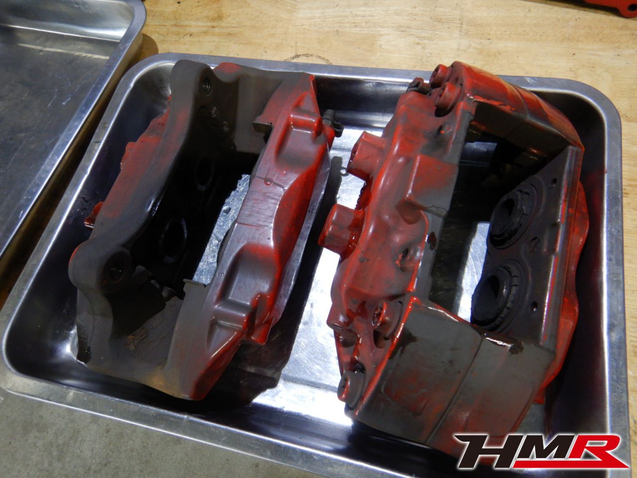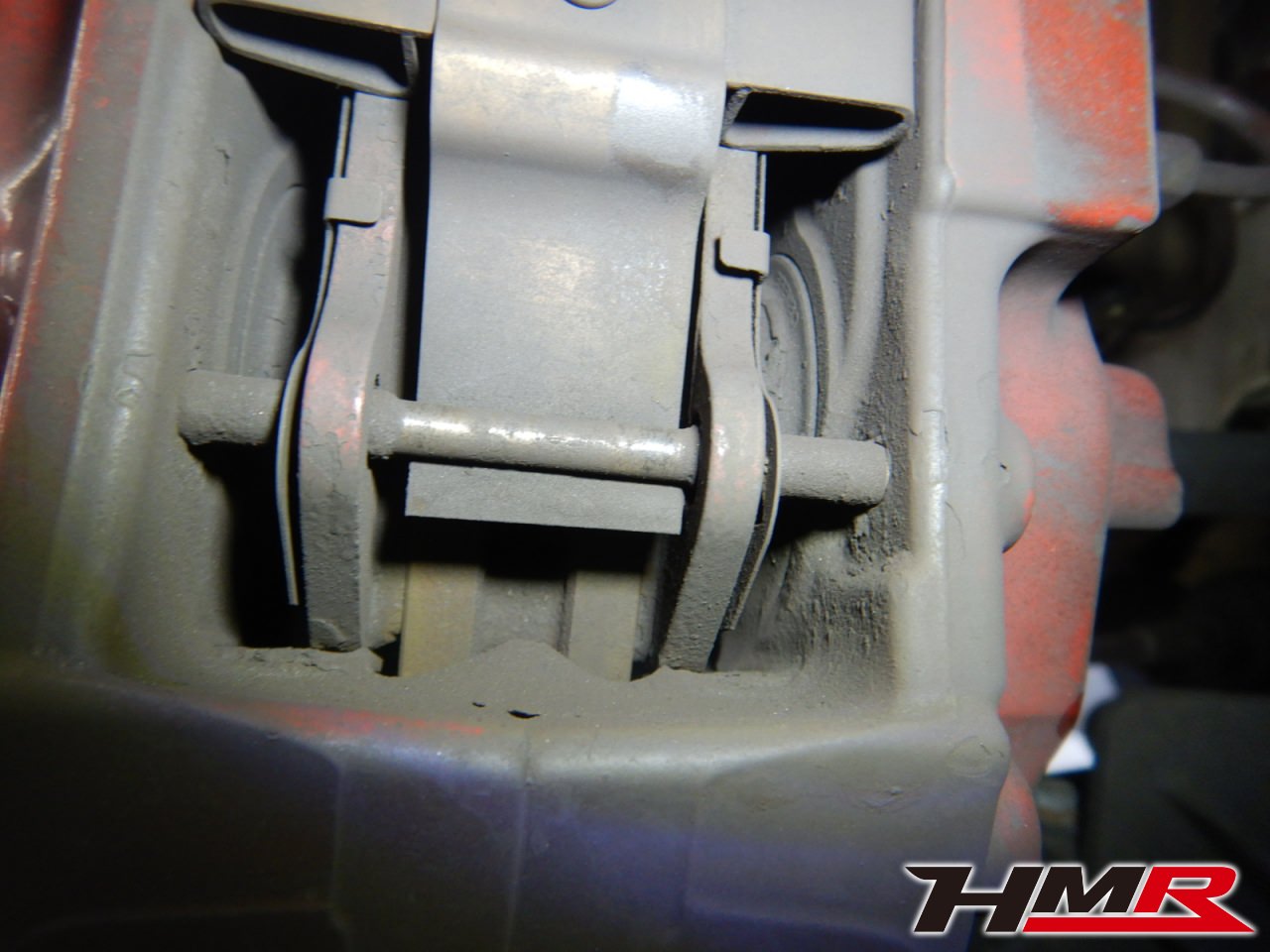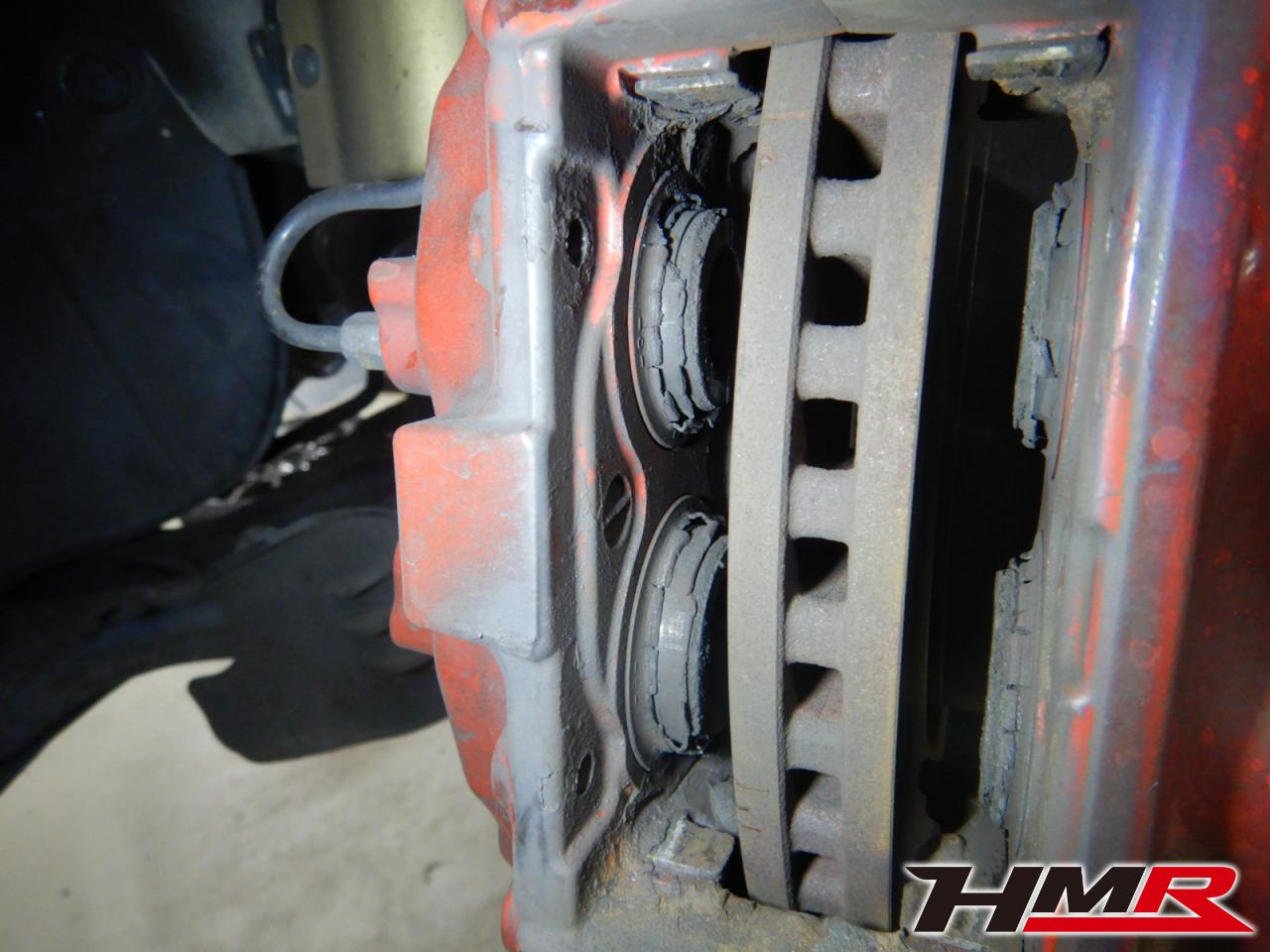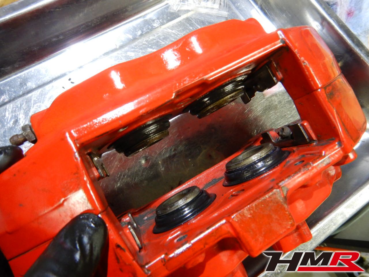 パッドとローターがそれだけ酷使されてるということは、キャリパーも各部が消耗していたり汚れが溜まっています。写真のように粉塵だらけです。分解して丁寧にチェックしていきます。