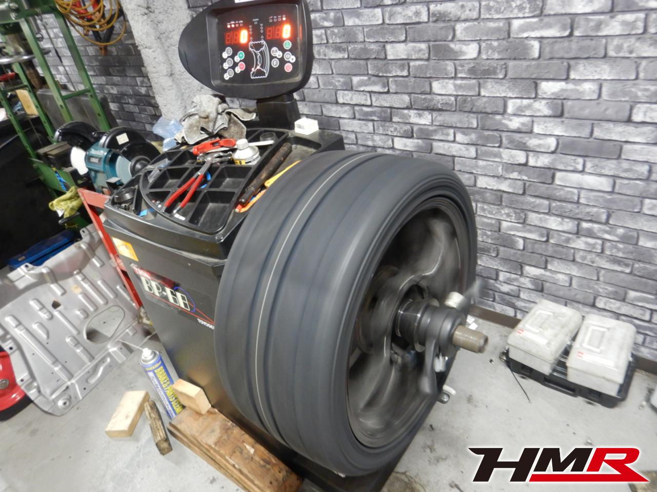 タイヤを組み付けたらホイールバランサーでバランス調整をしていきます。このバランス調整をしないとクルマの直進・コーナーリングに悪影響を与える恐れがあります。特に高速走行のサーキットとなると駆動部にダメージを与えて、破損がキッカケでの事故につながる恐れがありますので必ずバランス調整は行いましょう。