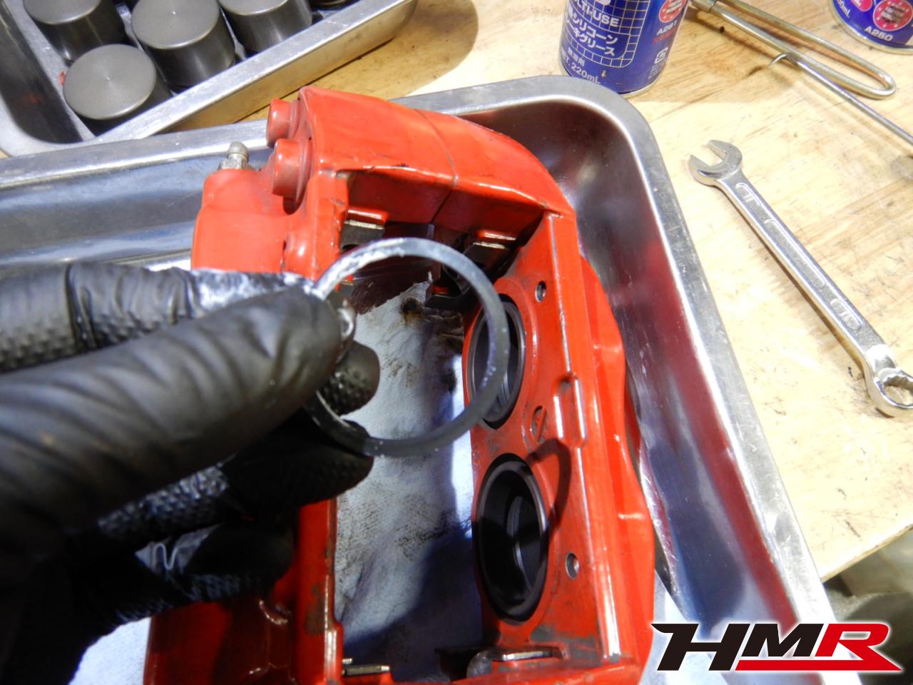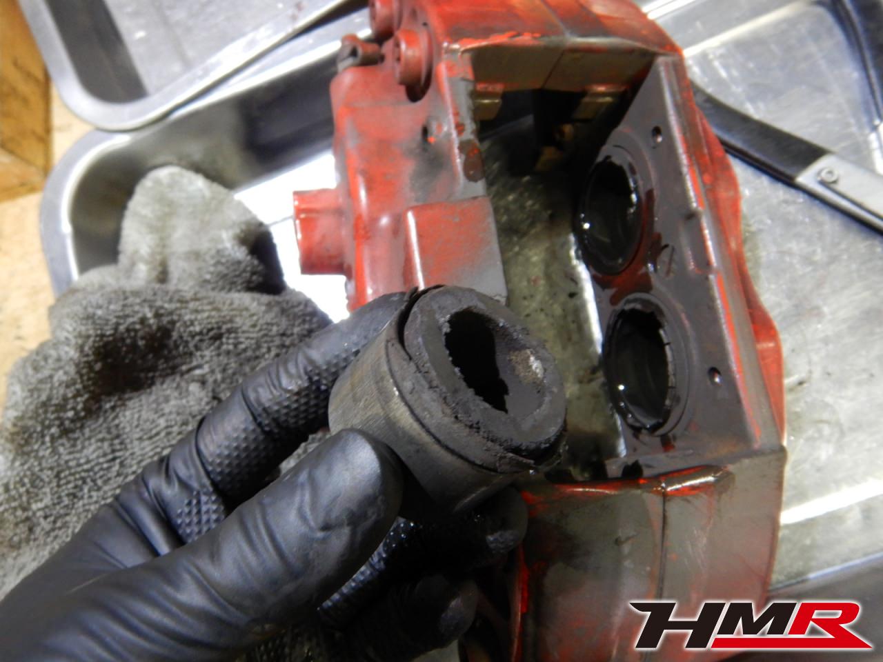 パッドを外した後のキャリパーを除いてみるとピストンシールがボロボロになっていました。サーキット走行での高温でシールが焼けてしまったのです。このまま使い続けていくとピストン内部に鉄粉・水分など異物が入り込んでピストンが錆びついたりし、しっかり動作しなくなってパッドとローターを交換しても制動力が得られなく恐れがあります。