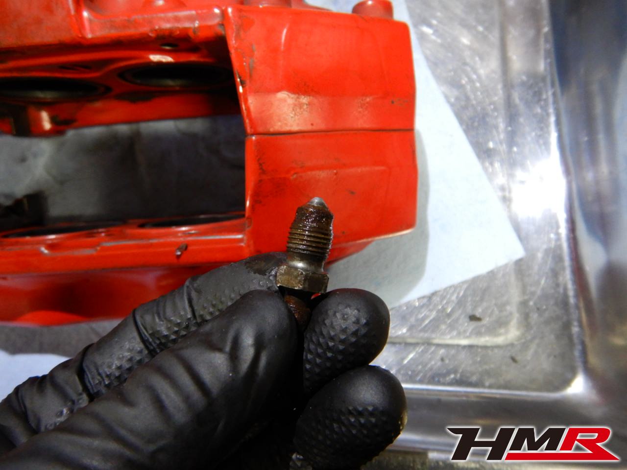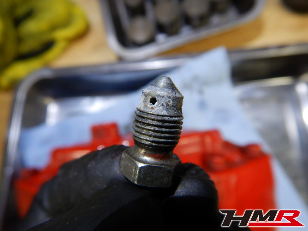 これはボルト先端から内部に貫通している穴からフルードを抜く、ブリーダーボルトです。フルードで穴がふさがっているようにみえます。