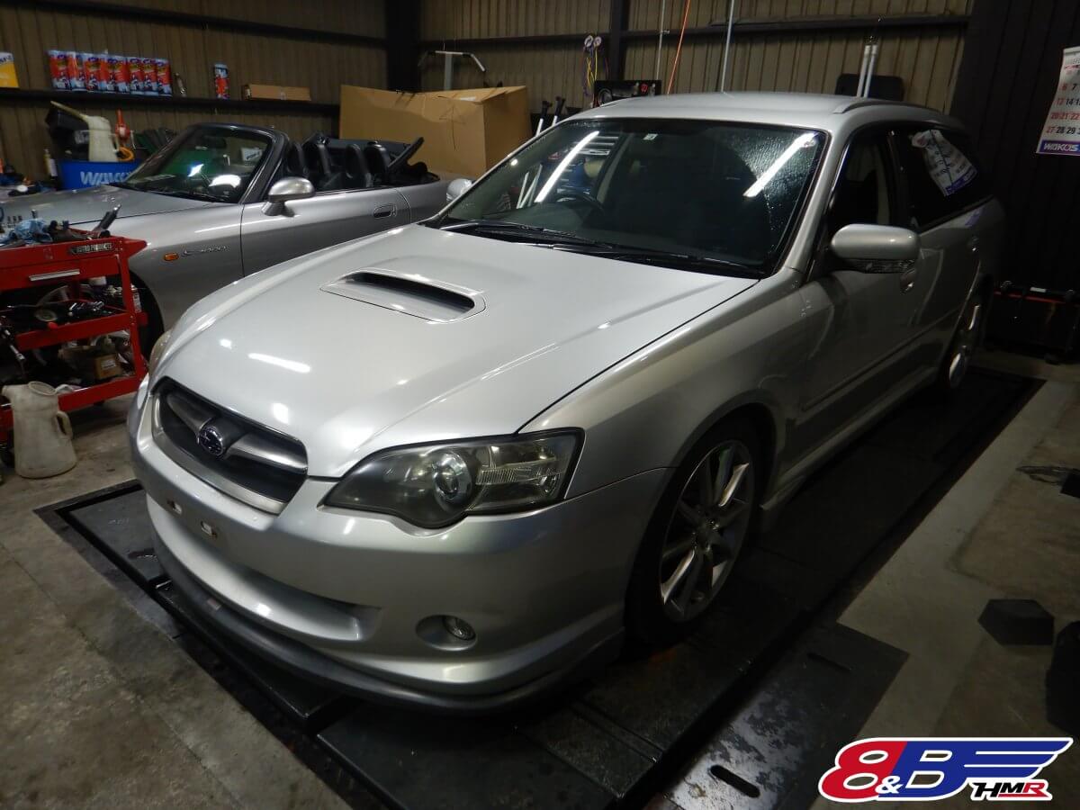 8&B HMR(エイトアンドビーエイチエムアール)の石川です。2.0GTスペックBのレガシィツーリングワゴンの納車前点検と整備をさせていただきました。STIのフロントリップスポイラーを装着して、ホイールも社外品を装着したスタイリッシュなワゴンです。それでは納車前点検をご紹介します。作業はメカニックのワタナベです。