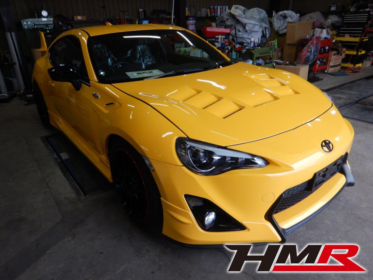 8&B HMR(エイトアンドビーエイチエムアール)のヤナギです。今回は86(ZN6)の特別仕様車のGTイエローリミテッドの納車前の点検整備を行いました。2か月半の期間限定注文でしか入手できない車両で、その中でもエアロパッケージFTという専用エアロが装着されたモデルです。一言で言うとかなりレアな車両です(笑)作業はメカニックのムラマツです。