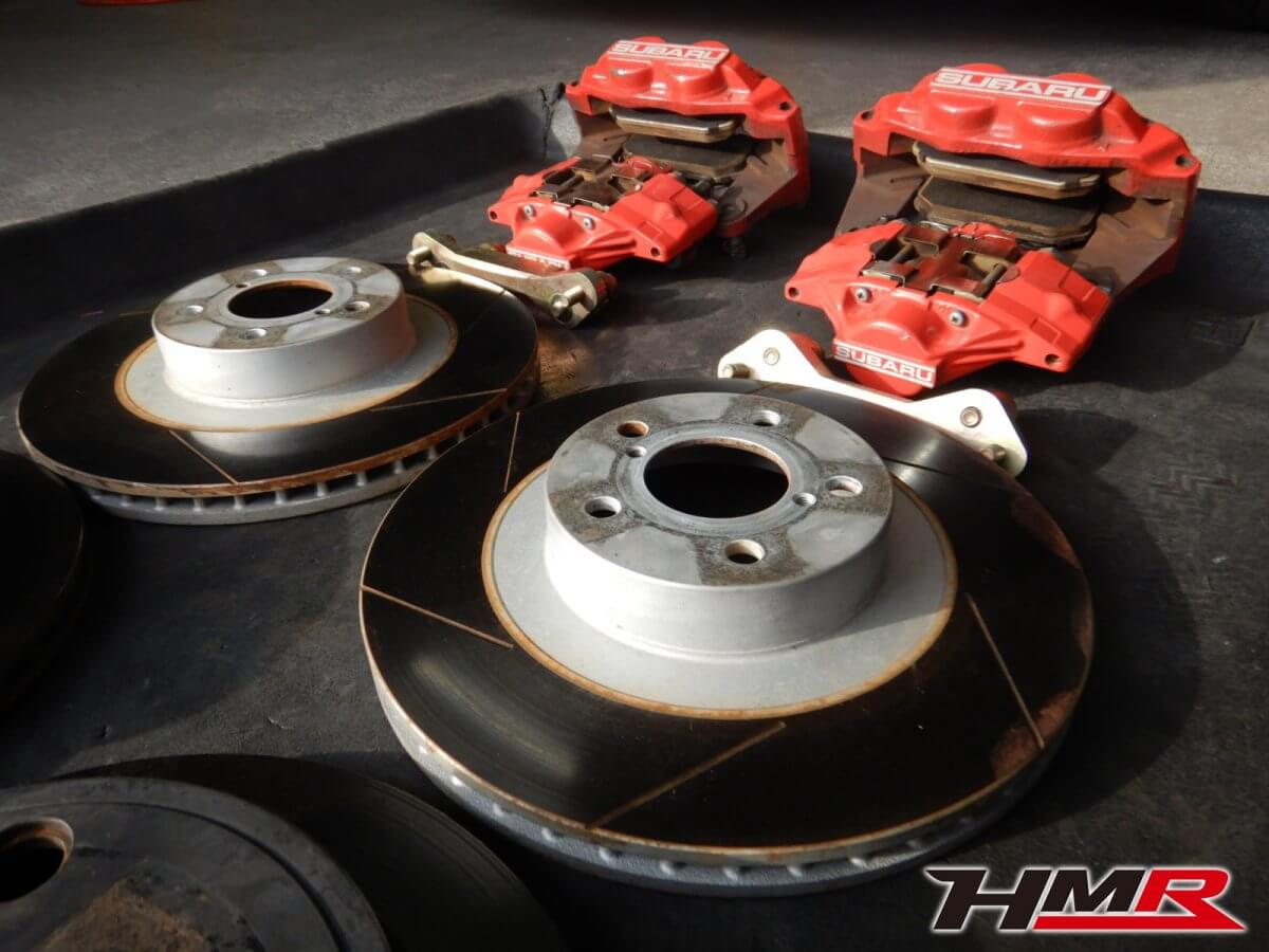 こちらが今回取り付けるブレーキです。スバルの赤キャリパーとスリットローターをお客様に持ち込んでいただきました。
