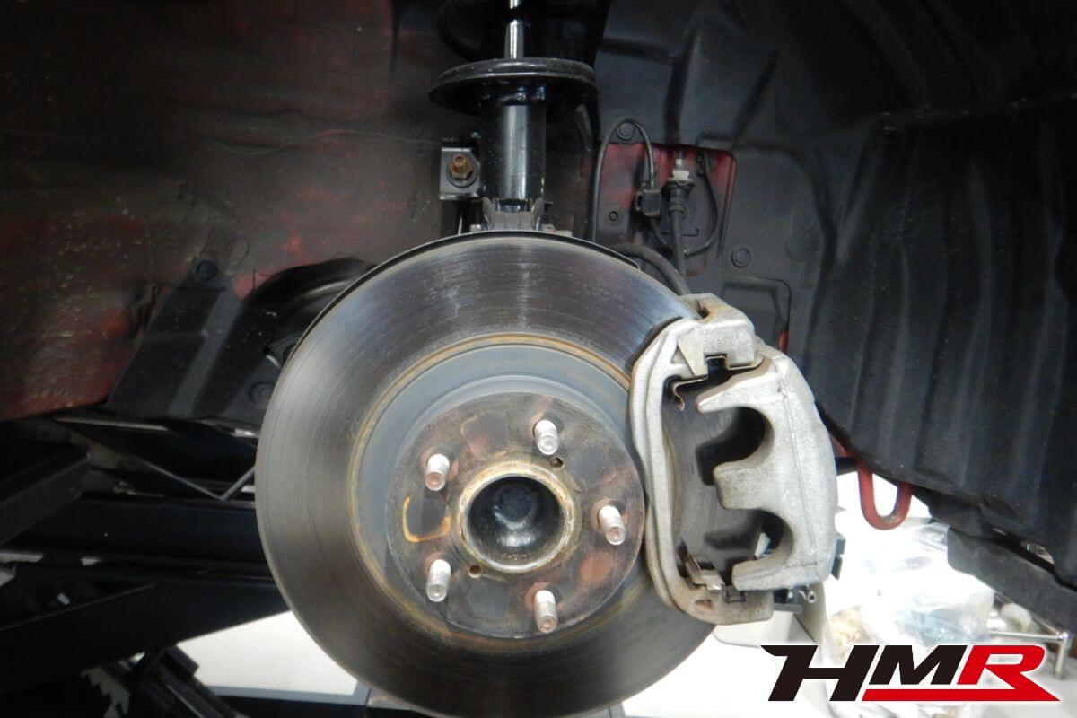 次にクルマをリフトアップして足廻りなどをチェックしていきます。最初にハブベアリングのガタやボールジョイントのガタが無いかチェックを行いましたが、特に問題ありませんでした。ガタが発生していると異音がしたり、まっすぐ走行することが困難になります。当店での定期的な点検をおススメいたします。