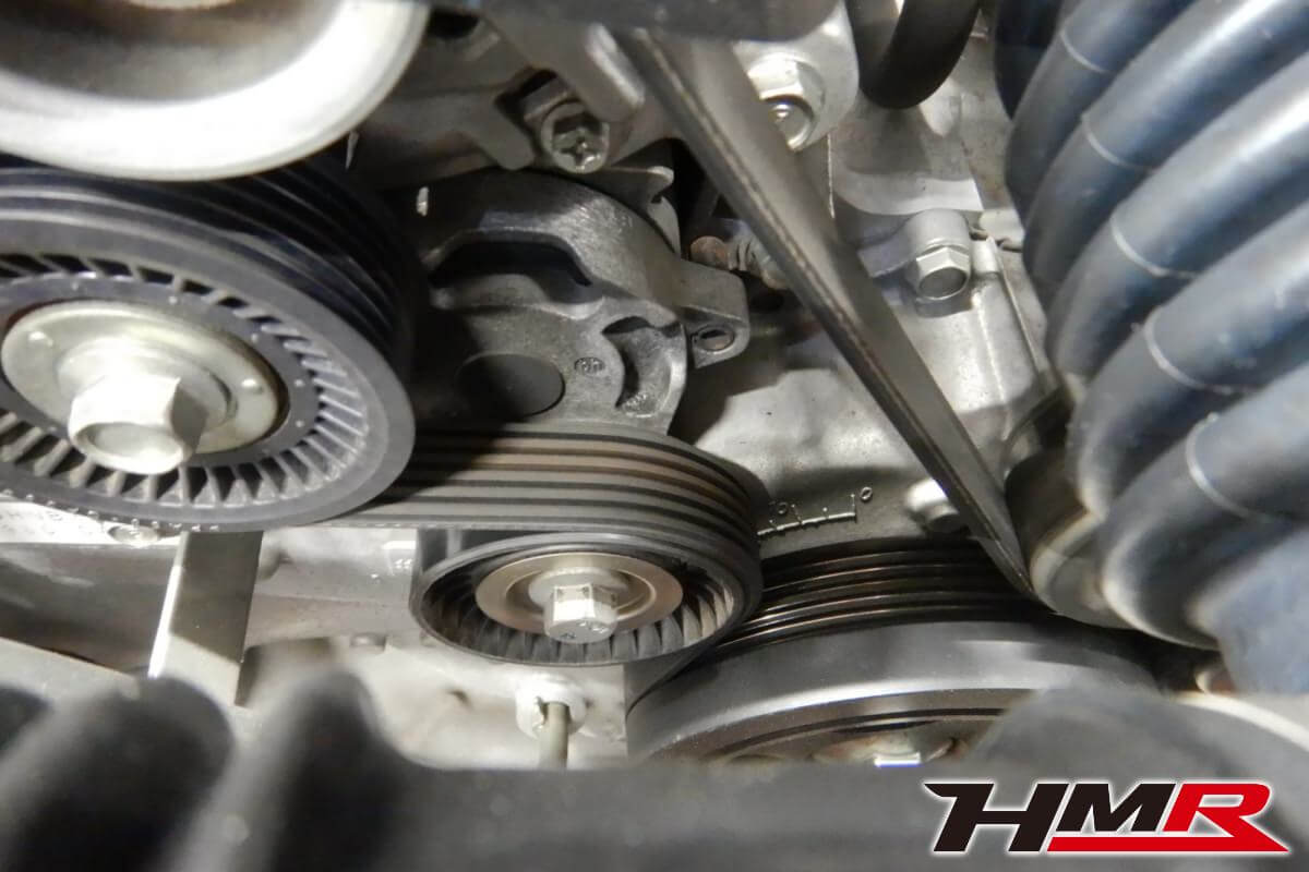 続いて補機ベルトの状態およびオートテンショナーの異音やガタが無いかを見ていきます。こちらも特に問題ありませんでした。べルトが切れてしまうとエアコンが効かなくなるだけではなく、充電ができずにバッテリー切れを起こす恐れがあります。定期的な点検をおススメいたします。