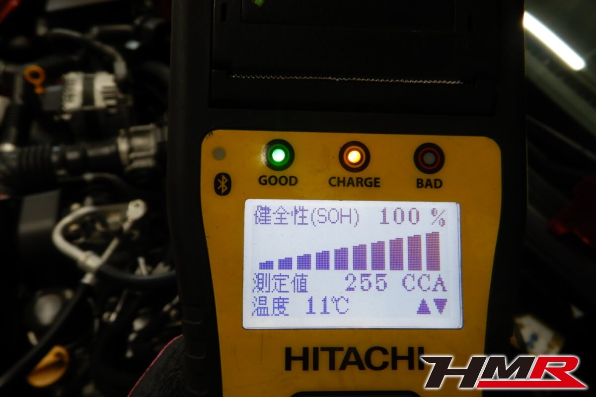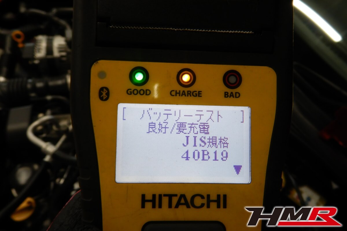 バッテリーの健全性をチェックしていきます。テスターで確認したところ健全性に問題はなかったのですが、充電が必要と出ましたので充電しました。バッテリーの交換時期は、使用状況にもよりますが3〜5年が目安とされています。定期的な点検をおススメいたします。