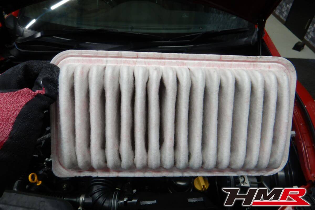 次にエアクリーナーのチェックに移っていきます。わずかな汚れが確認できますが、交換は必要なほどではありませんでした。汚れが目立ってくるとそれらが吸気抵抗となってしまい、エンジン性能をフルに発揮できなくなってしまいます。