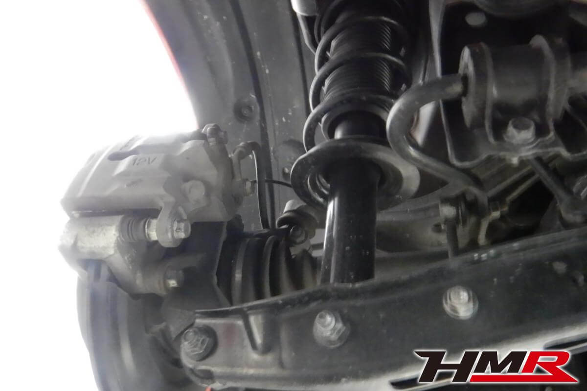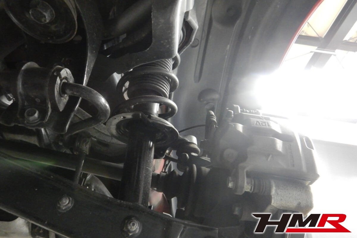 足廻りのブッシュ・ブーツをチェックしていきます。問題ありませんでしたがブッシュ・ブーツにヒビが入ってしまうとそこからグリスが漏れ出したり異物が侵入して足廻りの機能に支障をきたします。それ以外にもダンパーのオイル漏れがないかを点検していきます。