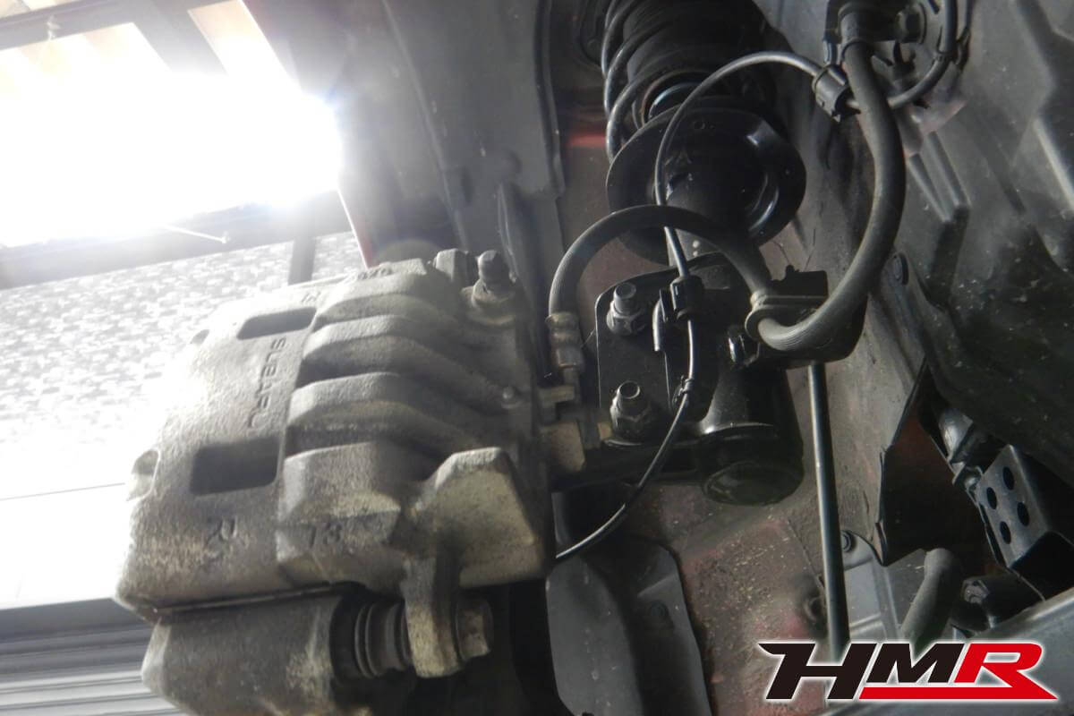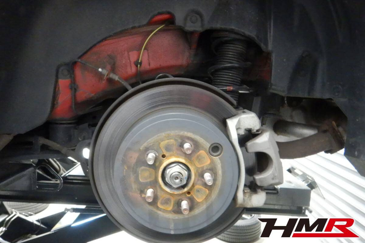 次にクルマをリフトアップして足廻りなどをチェックしていきます。最初にハブベアリングのガタやボールジョイントのガタが無いかチェックを行いましたが、特に問題ありませんでした。ガタが発生していると異音がしたり、まっすぐ走行することが困難になります。当店での定期的な点検をおススメいたします。