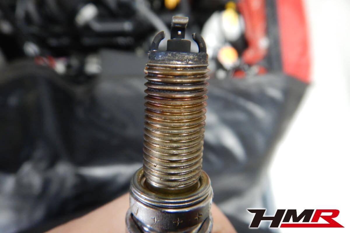 次にプラグのチェックを行いました。純正のイリジウムプラグが装着されています。4本とも特に問題ありませんでした。イグニッションコイルと合わせて交換するとエンジン出力が戻るぐらい86はプラグとコイルが劣化します。10万kmまでにはプラグとコイルの交換おススメいただいております。
