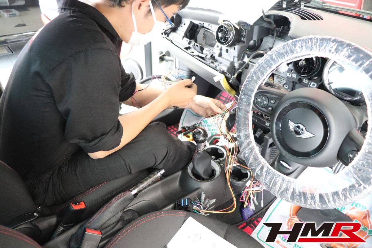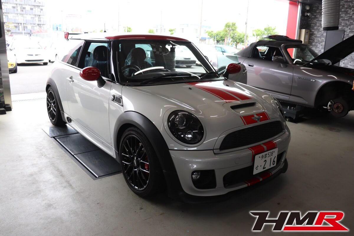当店デモカーのミニ・ジョン・クーパー・ワークスに取り付けていきます。