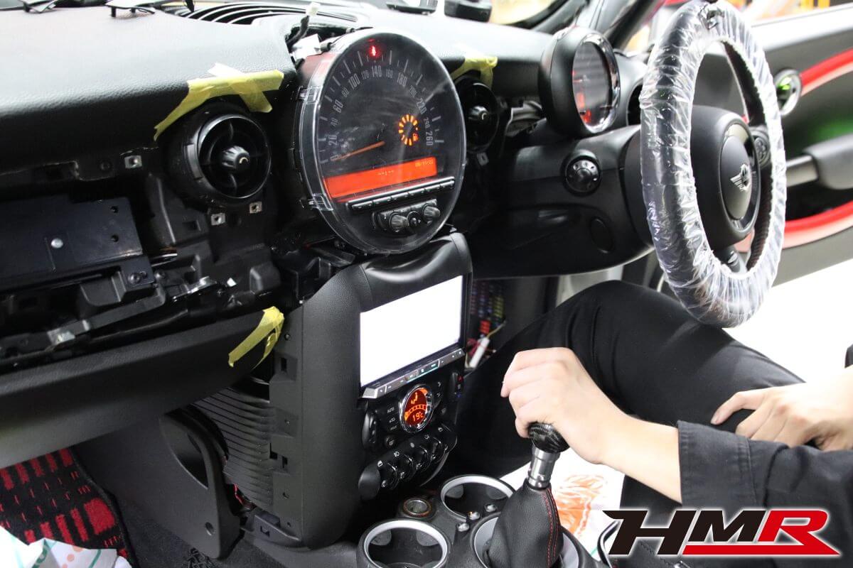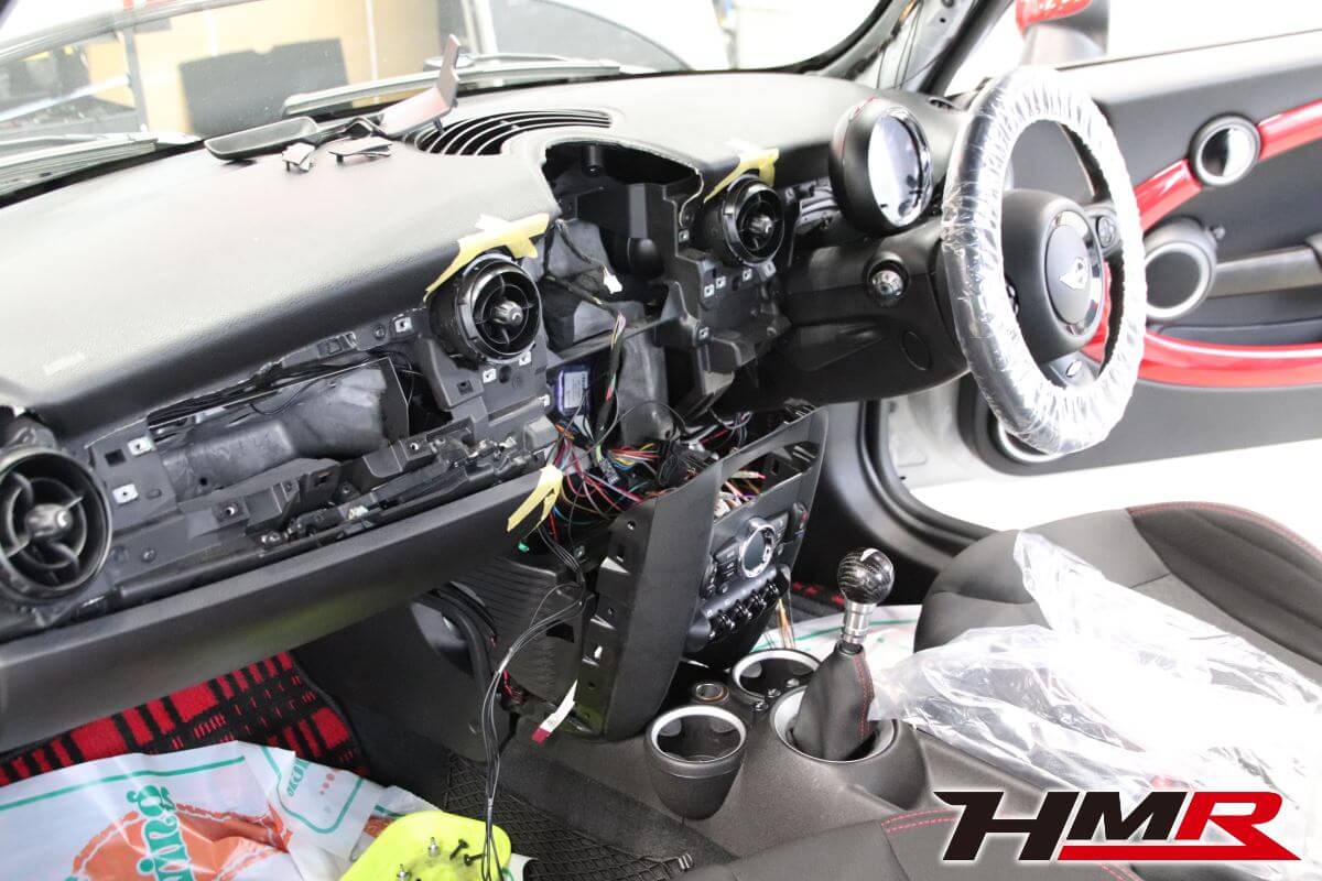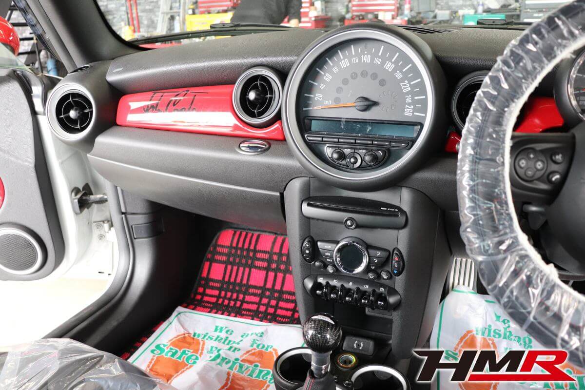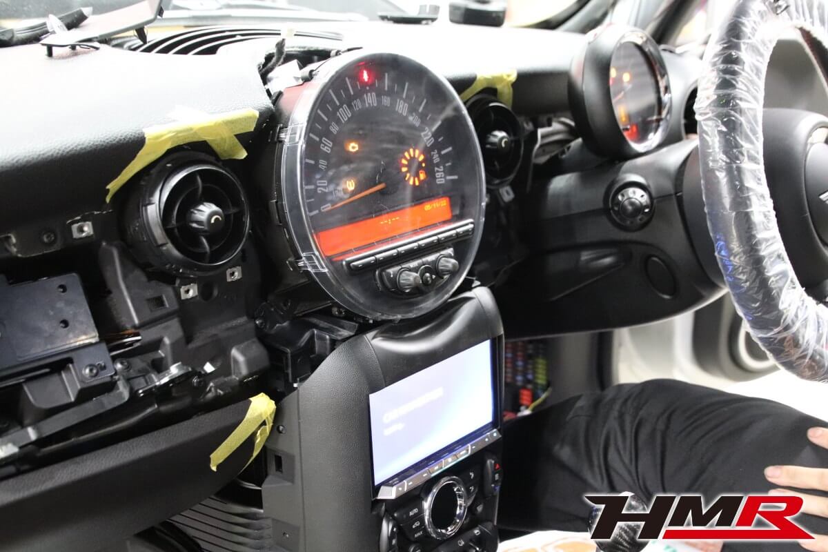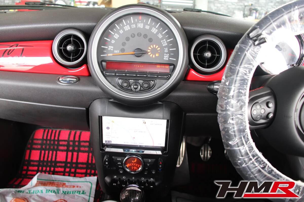 HOT HATCH HMR(ホットハッチエイチエムアール)の栗原です。今回は、2代目ミニJCW(R56)に社外2DINナビを専用キットを用いて取付しました。2代目BMWミニのインテリアの特徴であるセンターコンソールにある大きなスピードメーター。このメーターがあることで純正ナビが用意されていません(3代目からセンターコンソールにビルトインされたナビゲーションシステムが設定されました)。今の時代、ナビはドライブの必須アイテムとなっています。しかし、2代目ミニは設定がなく多くのオーナーの悩みでした。スマートフォンをエアコンの吹き出し口にホルダーに固定してナビアプリで対応している方もいらっしゃると思います。けどスマートではないですよね。