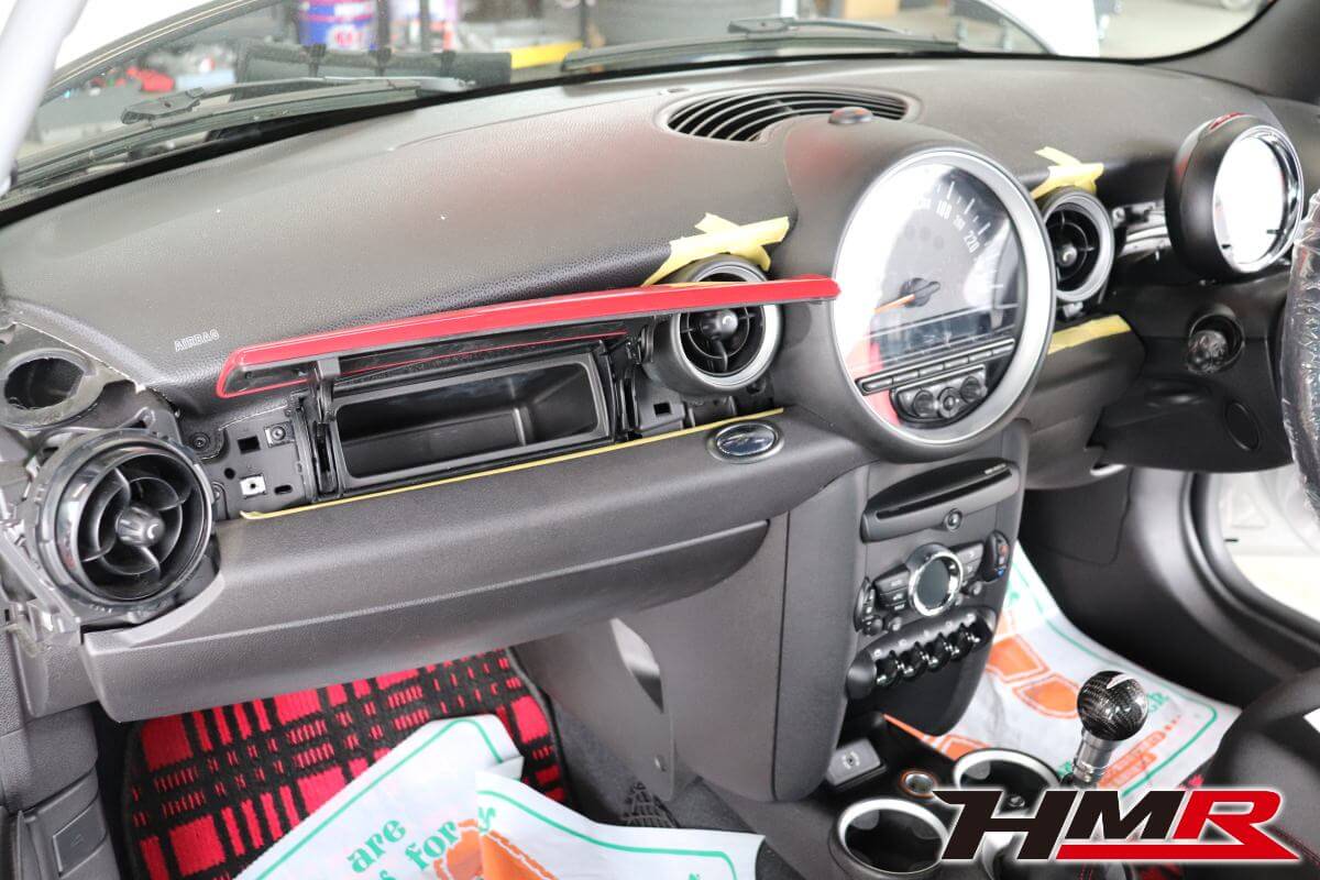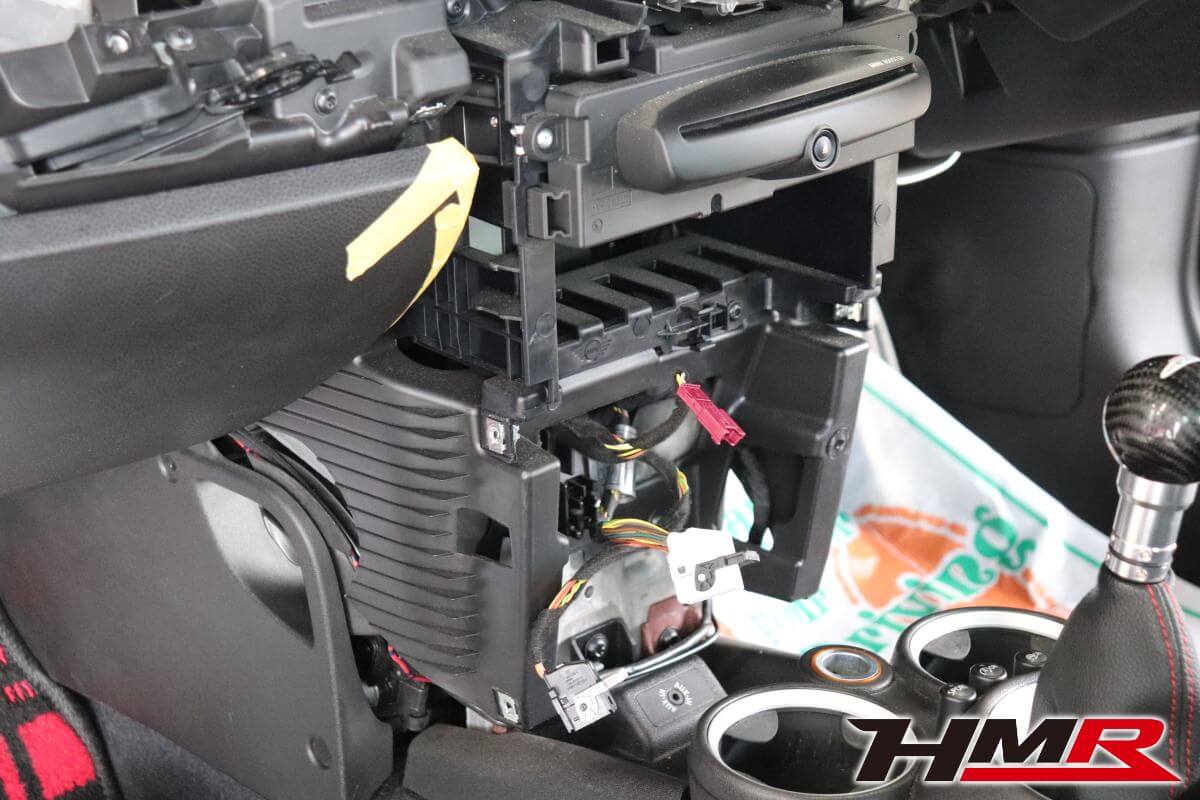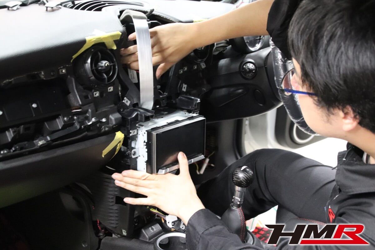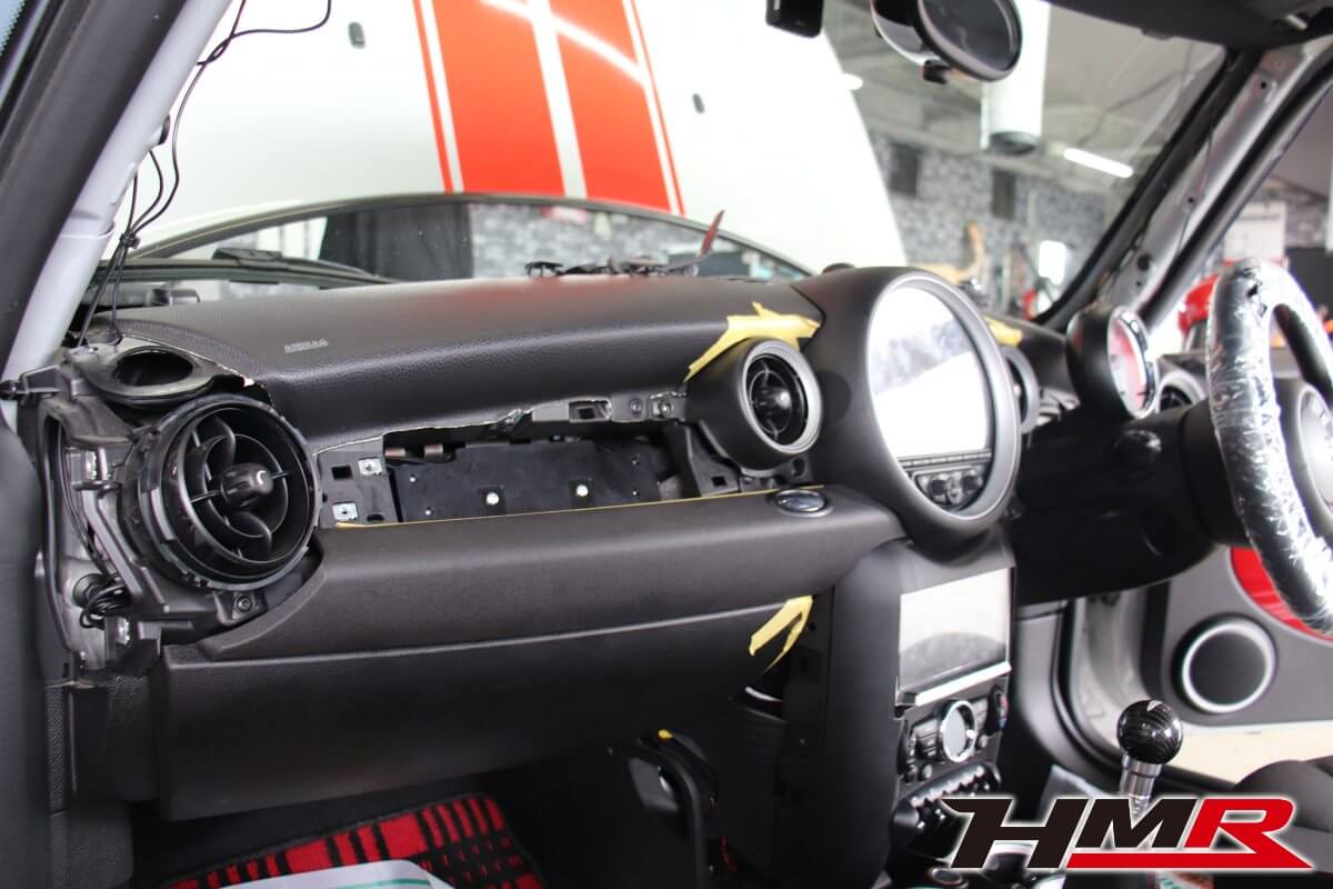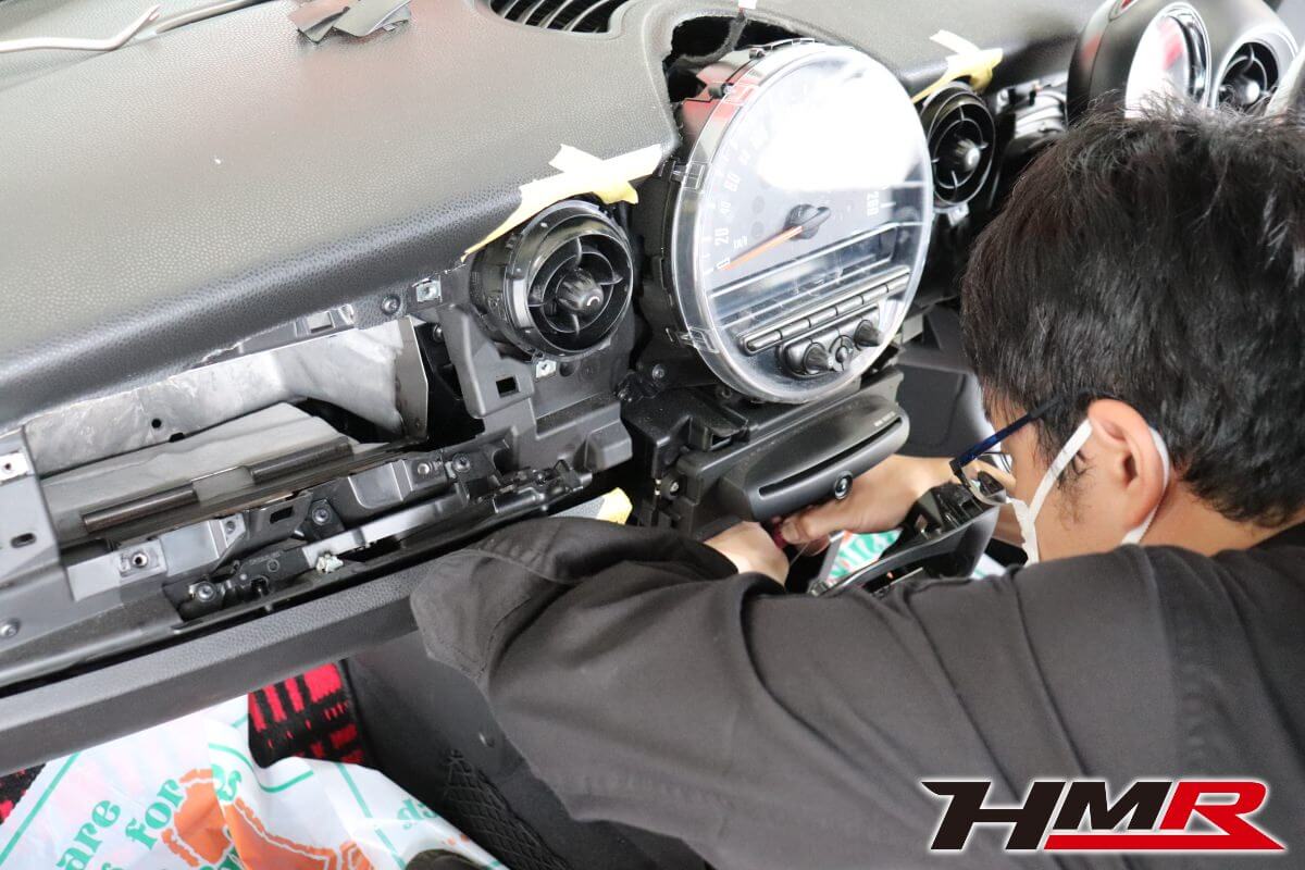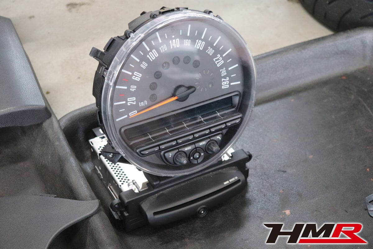 HOT HATCH HMR(ホットハッチエイチエムアール)の栗原です。今回は、2代目ミニJCW(R56)に社外2DINナビを専用キットを用いて取付しました。2代目BMWミニのインテリアの特徴であるセンターコンソールにある大きなスピードメーター。このメーターがあることで純正ナビが用意されていません(3代目からセンターコンソールにビルトインされたナビゲーションシステムが設定されました)。今の時代、ナビはドライブの必須アイテムとなっています。しかし、2代目ミニは設定がなく多くのオーナーの悩みでした。スマートフォンをエアコンの吹き出し口にホルダーに固定してナビアプリで対応している方もいらっしゃると思います。けどスマートではないですよね。