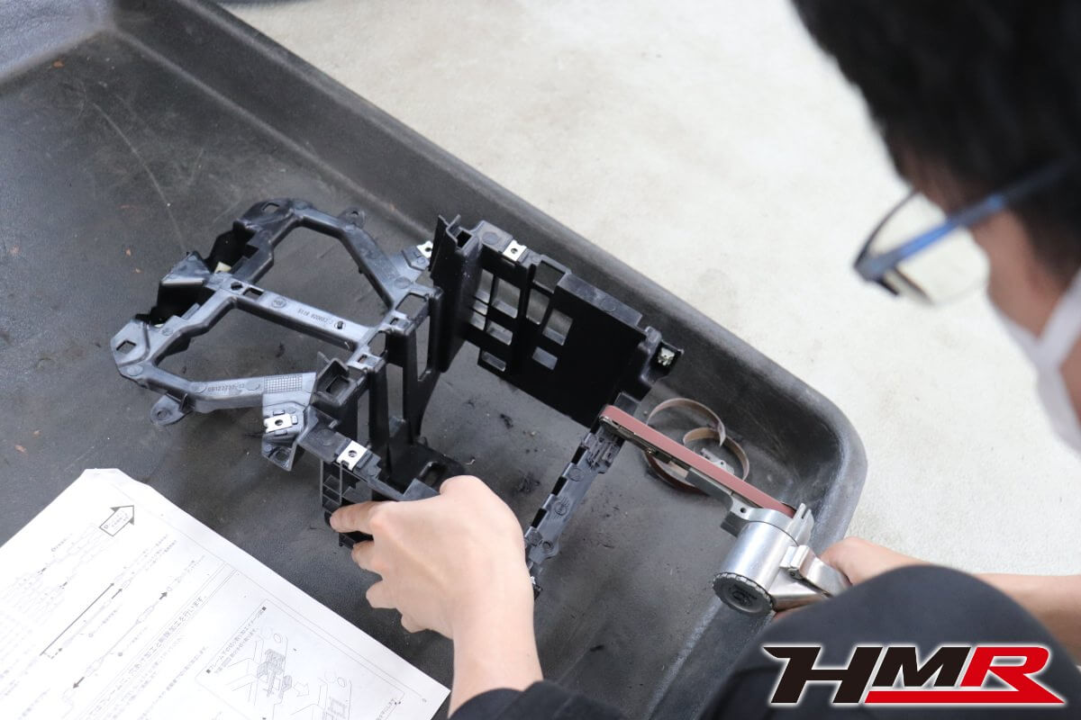 上のセンターメーター+CDプレイヤー固定していたフレーム下半分の箇所に2DINナビが入ります。その為のパーツを装着するので細かな加工が必要となります。