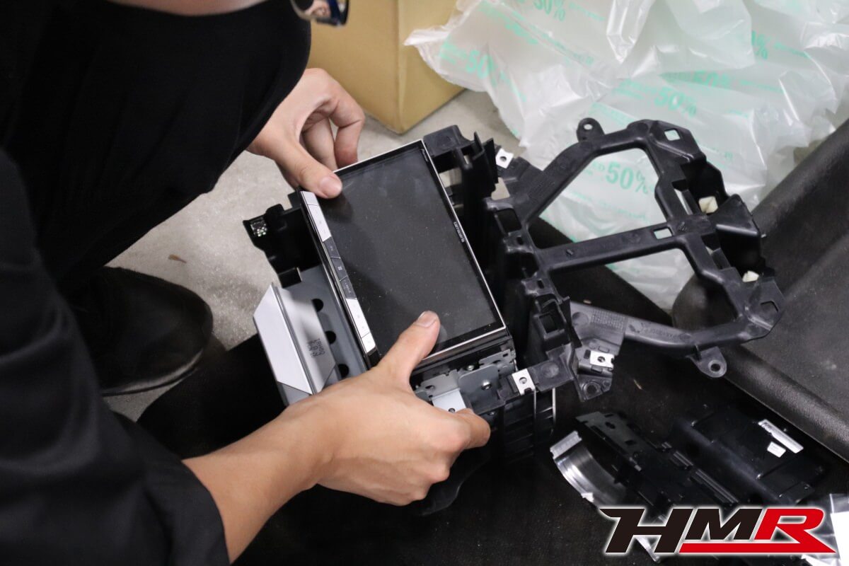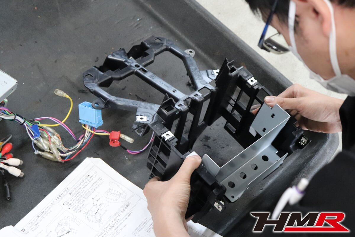 ナビ本体を取り付けていきます。しっかりとしているので取付がそれなりにタイト。誤って金具を曲げたり、ナビ本体を傷つけないように注意を払いつつ作業を続けていきます。